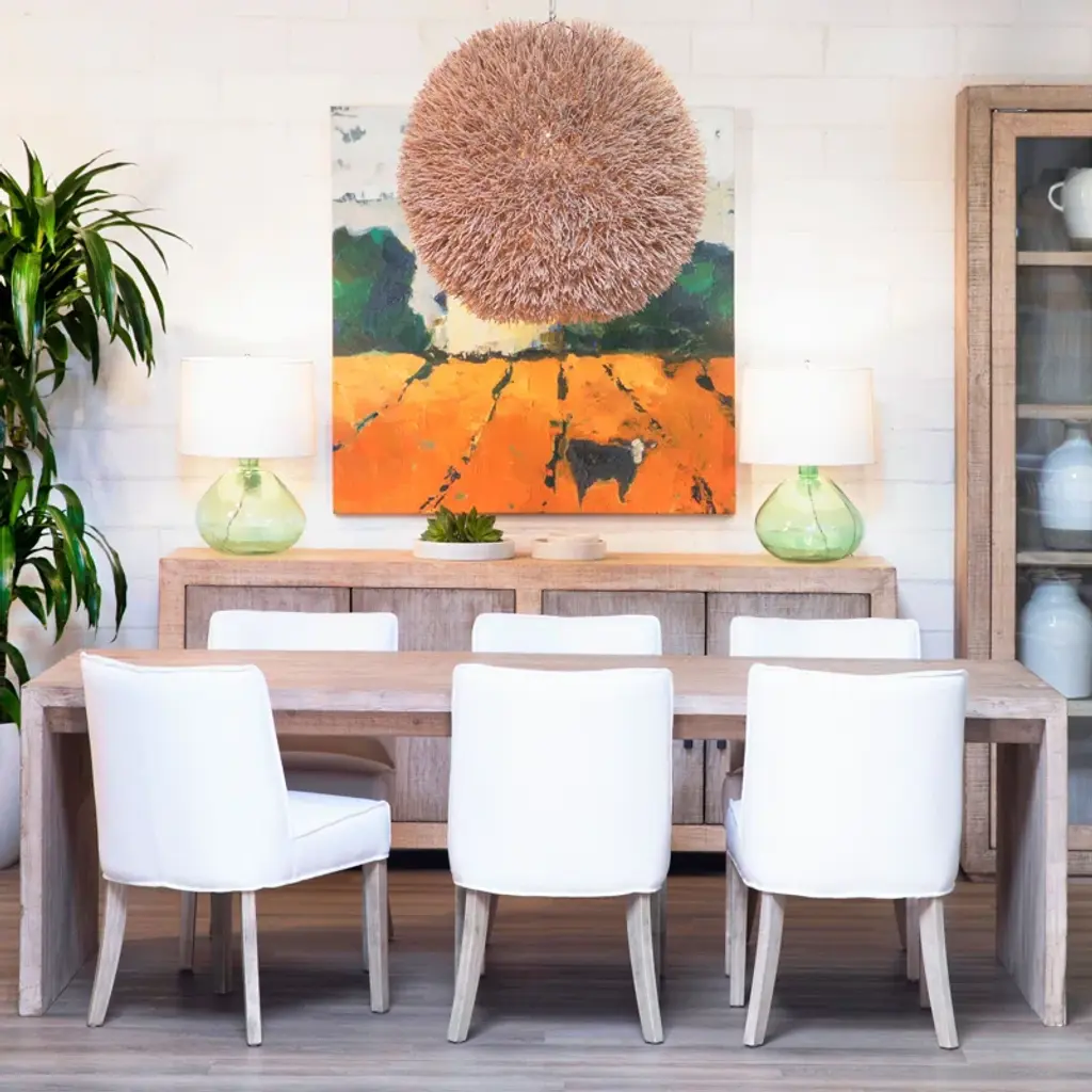 Crafted from reclaimed pine wood, this Alderete pine solid wood dining Table showcases the beauty of its natural texture in a minimalist design. Featuring two intentional wood cut-outs that add to its natural charm. Finished in a beautiful light warm wash color to add a warm statement to your dining space.