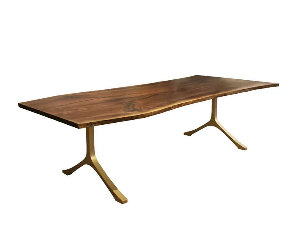 The Metal Base Live Edge Dining Table features a perfect union of a natural elements, with the natural variation of the live edge table top and precise lines of metal fabrication. Each live edge dining table is unique due to the natural variation of the wood grain and color tone. The solid steel metal base is designed and fabricated in Portland by INGOT Furnishings. Each of the three metal base designs (Argon, Carver, and Talos) are available in a Black, Gold, Iron, or Silver finish.Available online in Western Walnut. Please contact us here for additional wood and finish options along with currently in stock availability.
