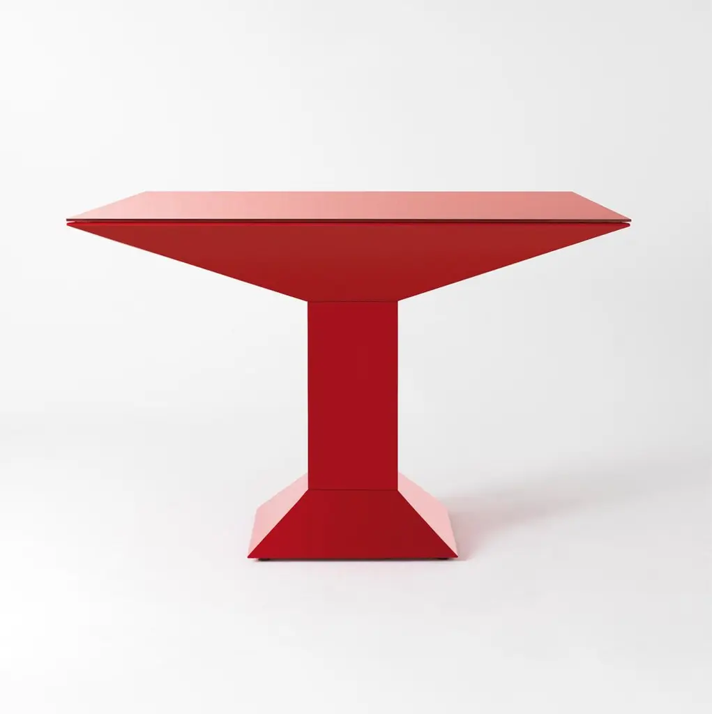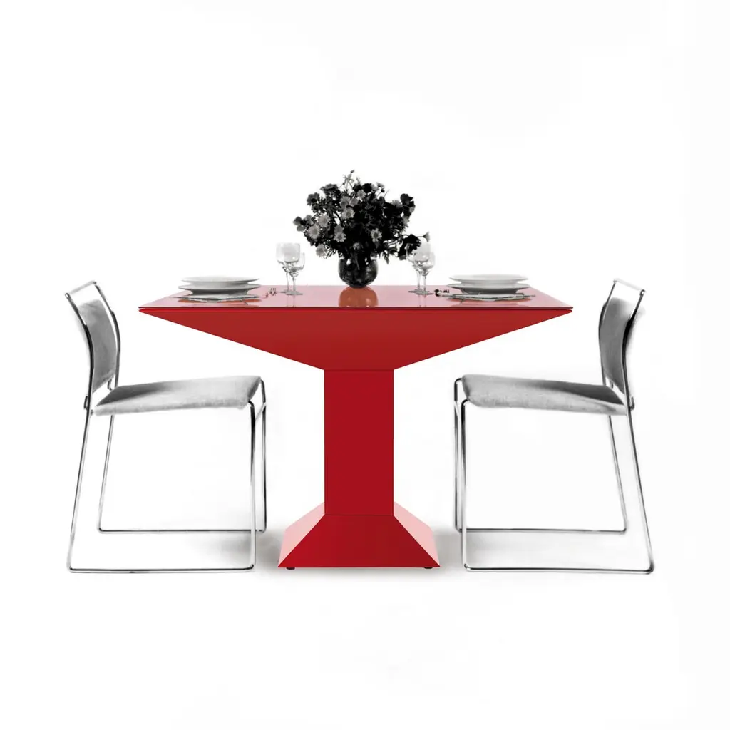Mettsass dining table, Ettore SottsassDimensions: 110 x 110 x 73 H cmMaterials: steel, glassThe structure is of flat sheets of steel painted in red. The glass on the top is painted in the same colour as the structure.Irreverent, provocative, non-conformist, ground-breaking: a Postmodern master, are just some of the terms applied to Ettore Sottsass whose wildly innovative work has had an enormous influence on many contemporary artists. His association with the avant-garde Memphis Group is well known, but in fact, back in 1972 almost a decade before they formed he had forged a relationship with BD Barcelona, one of the first designers to work with the then, fledgling group. His Metsass table from 1972 looks as contemporary today as it did decades ago, his BD designs include the Knossos lamp and Manhattan ashtray and the notorious Shiva Vase, now in the permanent collection of The Metropolitan Museum of Art. Always experimental in his approach to form and colour, his work is truly iconic. Influenced by both ancient civilizations and contemporary culture, a man who looked to the future for inspiration and whose legacy is an integral part of the history of BD Barcelona.BDB