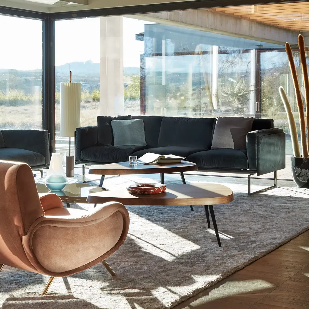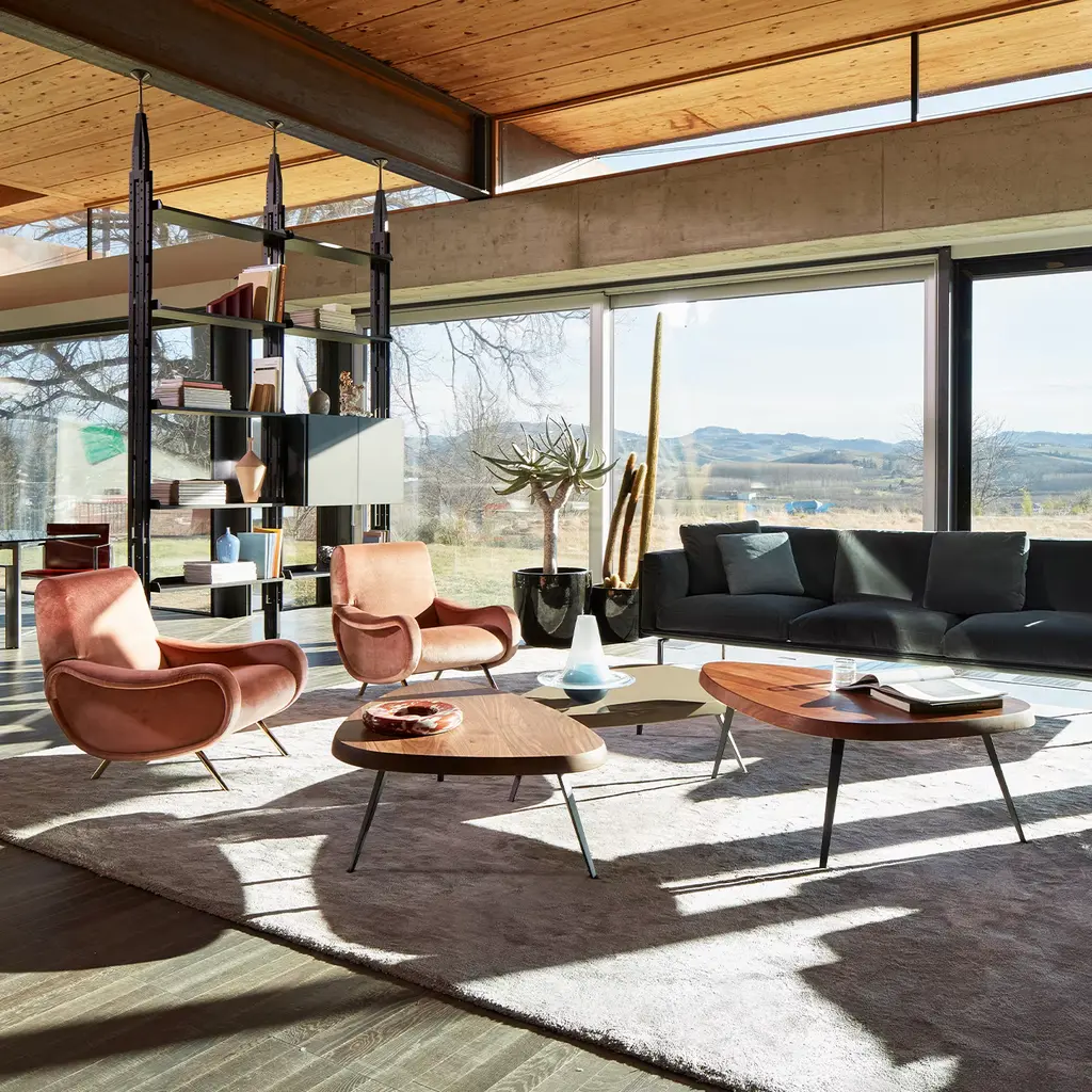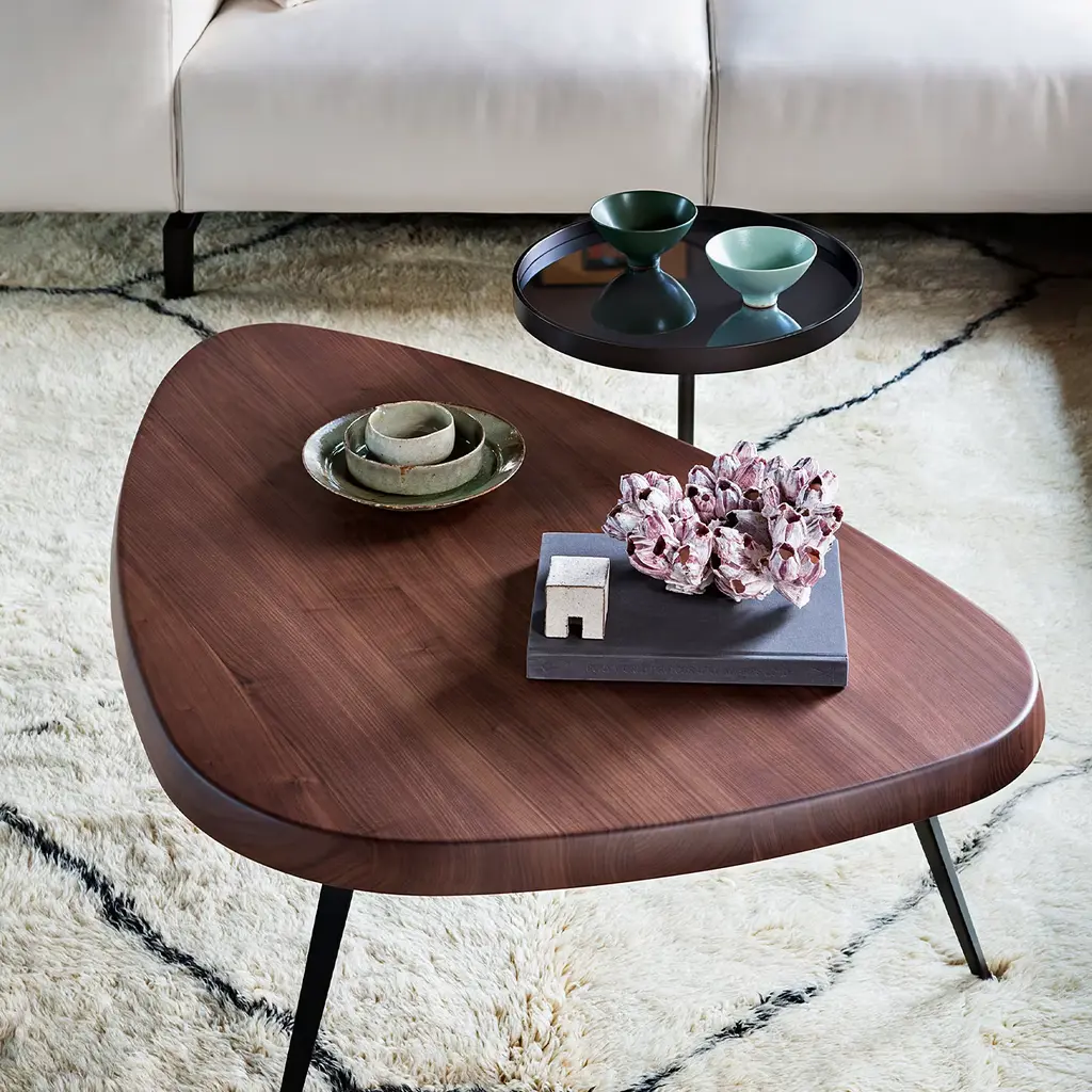 Mexique - Triangular table in american walnut solid wood. Included as one of the tables en forme libre created between 1938 and 1939, the fi nal design was developed in 1952 for the students’ rooms of the Maison du Mexique at the Cité Universitaire Internationale in Paris. With a frame designed to be as compact as possible, the tables could be juxtaposed to create larger, symmetrical units. In 1952, the wooden legs were replaced by triangular-section bent metal. In 1956, the low level version was created for the Galerie Steph Simon in Paris. The generous depth of the wooden table-top, available in solid wood, as well as with a gloss or matte fi nish, resonates with rare beauty. Meanwhile, form follows function in the edges form, refl ecting the size of the human hand. New dining versions are added for 5 or 6 people, a new bar version and two new heights for the low tables. In addition, a number of new fi nishes enhance further the potential for these tables to work together and serve new purposes.