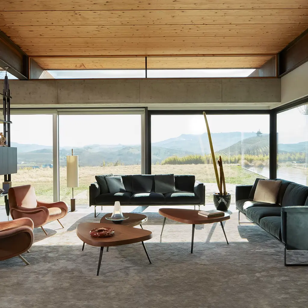 Mexique - Triangular table in natural oak solid wood. Included as one of the tables en forme libre created between 1938 and 1939, the fi nal design was developed in 1952 for the students’ rooms of the Maison du Mexique at the Cité Universitaire Internationale in Paris. With a frame designed to be as compact as possible, the tables could be juxtaposed to create larger, symmetrical units. In 1952, the wooden legs were replaced by triangular-section bent metal. In 1956, the low level version was created for the Galerie Steph Simon in Paris. The generous depth of the wooden table-top, available in solid wood, as well as with a gloss or matte fi nish, resonates with rare beauty. Meanwhile, form follows function in the edges form, refl ecting the size of the human hand. New dining versions are added for 5 or 6 people, a new bar version and two new heights for the low tables. In addition, a number of new fi nishes enhance further the potential for these tables to work together and serve new purposes.