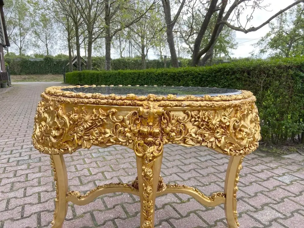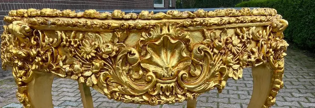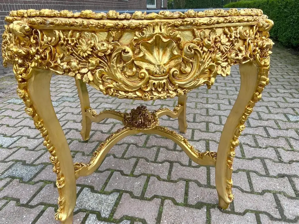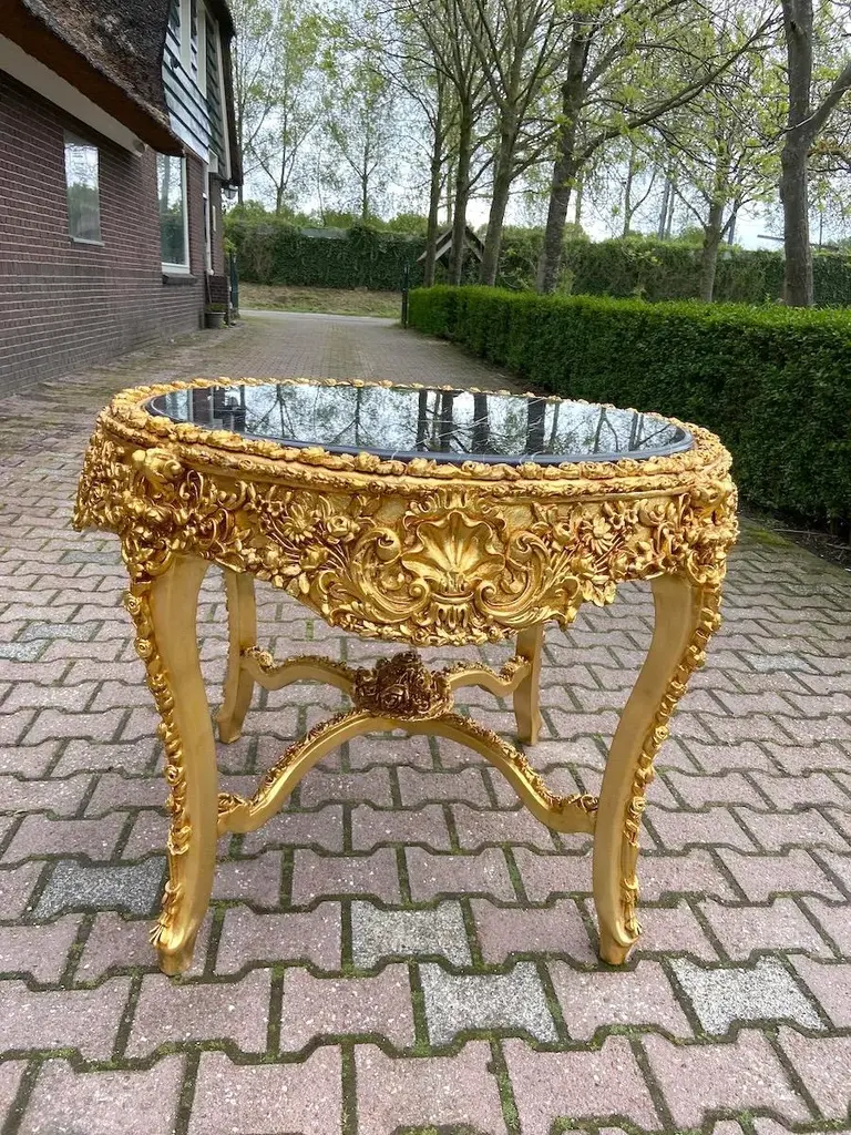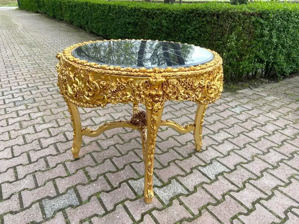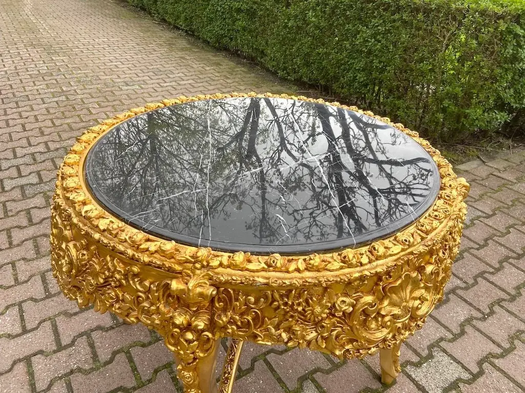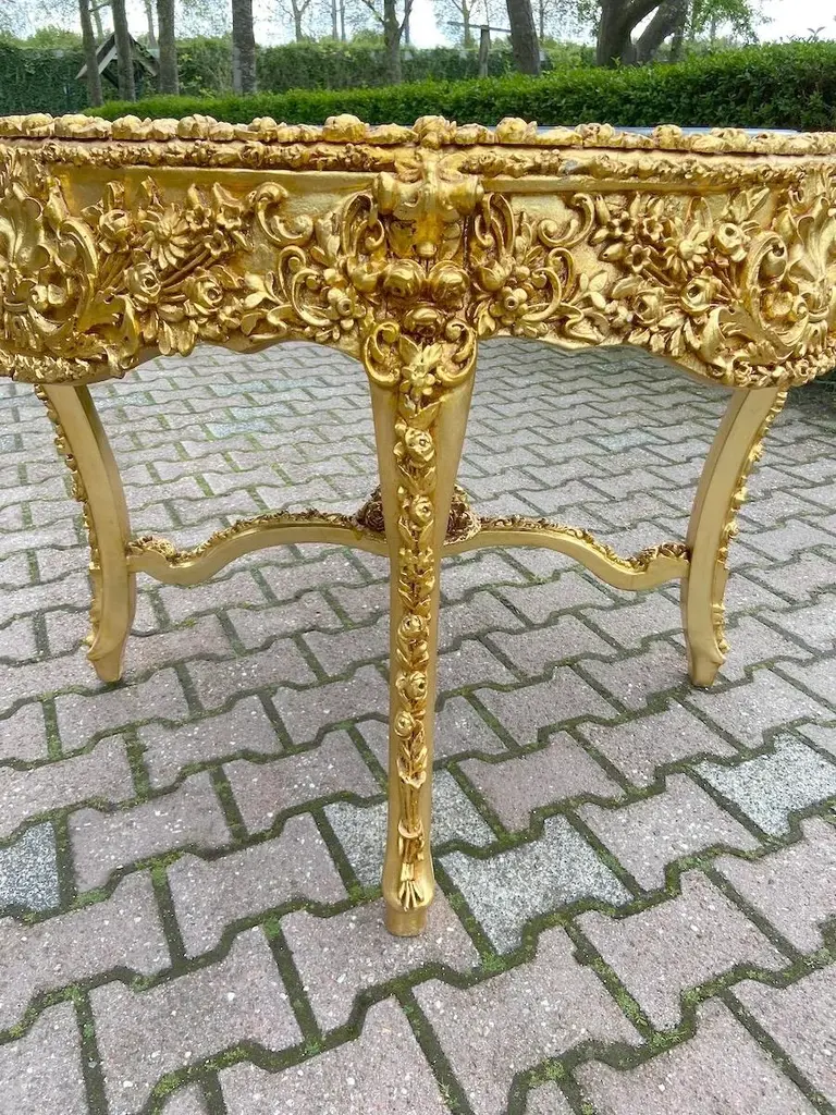 Mid 20th Century Italian Baroque Rococo Gold Gilded Beechwood Dining or Center Table with Black Marble Top Bring dramatic Italian grandeur into your home with this mid 20th-century Baroque/Rococo-style table, a masterpiece of craftsmanship and design. Handmade from solid beechwood, finished in rich gold leaf, and topped with genuine Italian black marble, this piece functions equally well as a dining table, center table, or statement display piece. Its ornate carvings and bold material contrasts embody the romance and opulence of Baroque revival design. ✨ Key Features Date/Period: Mid 20th Century (Vintage) Origin/Maker: Italian artisan-made Style: Baroque / Rococo Revival – ornate neoclassical flourishes Material: Carved beechwood with gold leaf finish; Italian black marble top Color: Gold base with black marble top Category: Tables – Dining Table / Center Table # of Pieces: 1 Craftsmanship & Design Carved Beechwood Base: Four ornately carved cabriole legs converge at a central bouquet of roses, a rare decorative feature that enhances the table’s romantic character. Gold Leaf Finish: Hand-applied gilding highlights the sculptural carvings, creating depth and a luxurious golden patina. Italian Marble Top: The thick, polished black marble provides a striking contrast to the gilded wood, its natural veining adding refinement and uniqueness. Baroque Influence: Exuberant curves, floral motifs, and theatrical details capture the spirit of 17th–18th century Italian design. ️ Decorative Versatility Ideal as a formal dining table or breakfast table for intimate gatherings. Perfect as a centerpiece table in a grand foyer, salon, or gallery. Can serve as a display surface for sculpture, floral arrangements, or fine art objects. Dimensions Metric: 110 cm W × 110 cm D × 81 cm H Imperial: 43 in W × 43 in D × 32 in H ⚖️ Condition Very good vintage condition. Marble is smooth and well-preserved with natural veining. Gold finish retains its vibrancy, with minor age-related patina that enhances authenticity. The frame can have some marks of use . Structurally sound, stable, and ready for immediate use. Shipping & Handling Carefully packed in a custom-made wooden crate for secure transit. Fully insured and tracked, ensuring peace of mind from dispatch to delivery. Why You’ll Love It This Italian Baroque Rococo table is more than furniture—it is a sculptural statement piece. With its gilded floral carvings and luxurious black marble top, it radiates romantic drama and aristocratic elegance. Whether showcased in a grand entryway or styled as an intimate dining table, it embodies the timeless artistry and grandeur of Italian design, making it a showpiece for sophisticated interiors.