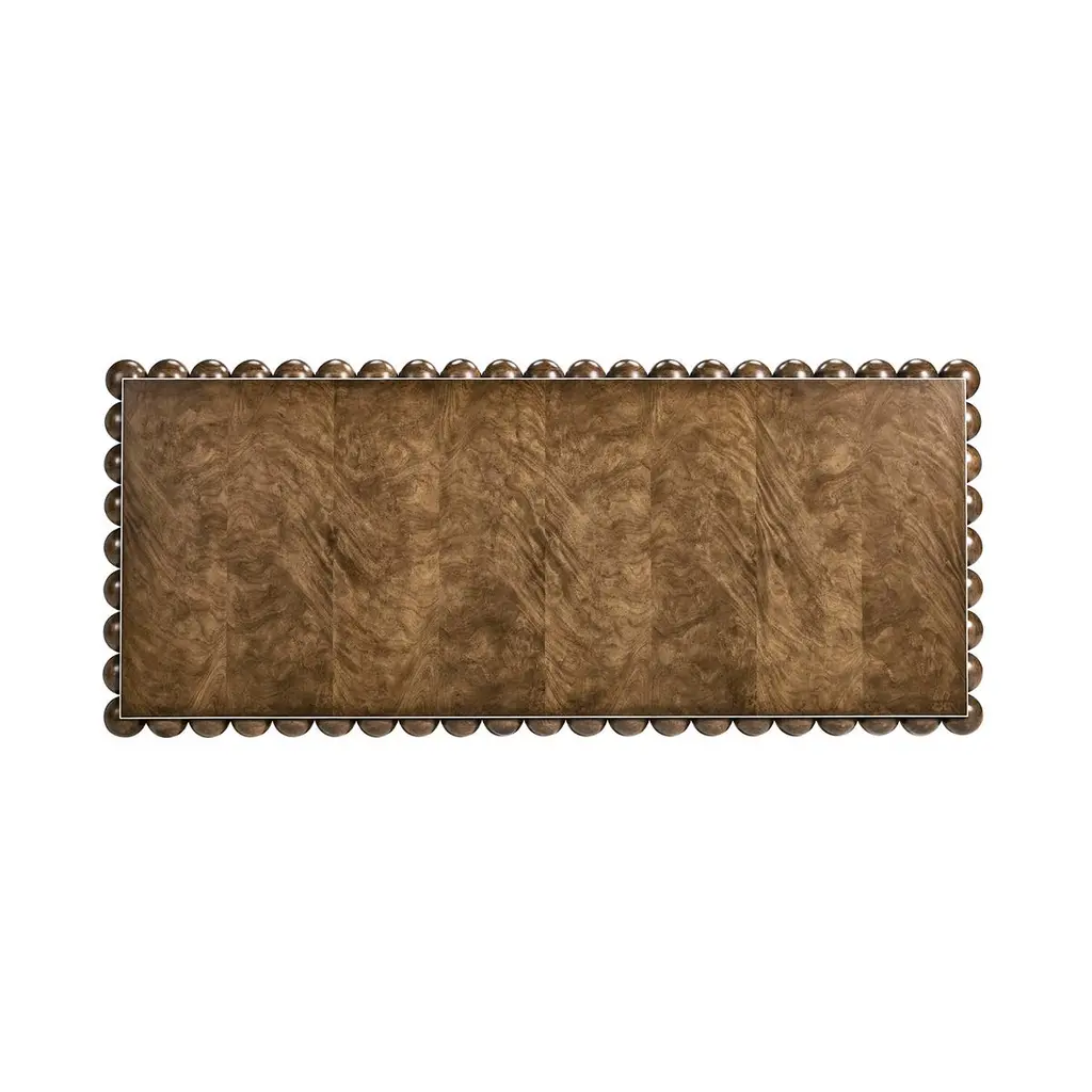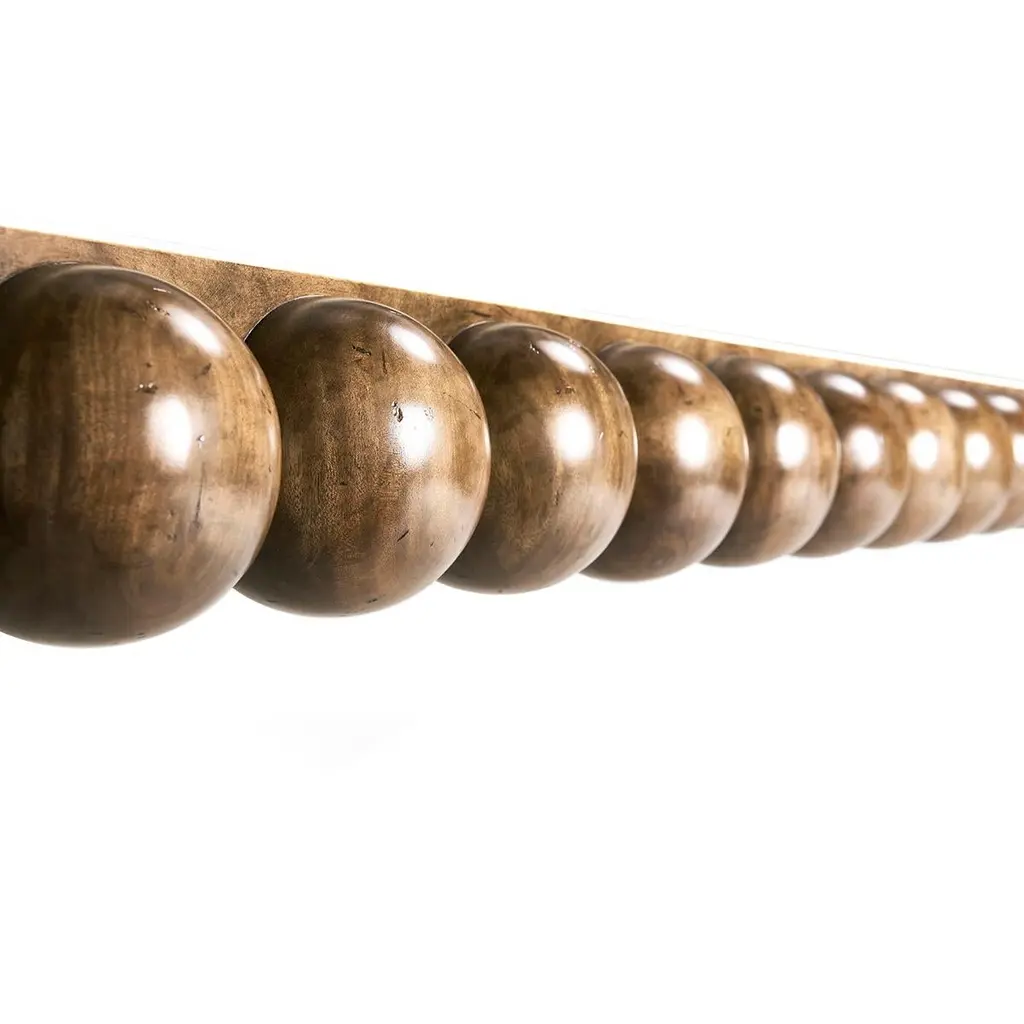 The table's solid wood-stacked orbs form a foundation that fuses art and functionality. These orbs create a unique and eye-catching leg and apron design that adds personality to the piece.The faux bone inlay creates a subtle visual contrast against the medium brown mahogany, elevating the table's overall appearance. Immerse yourself in the playful side of modern design and transform every meal into an experience.Dimensions: 103.63" W x 44.38" D x 30" H