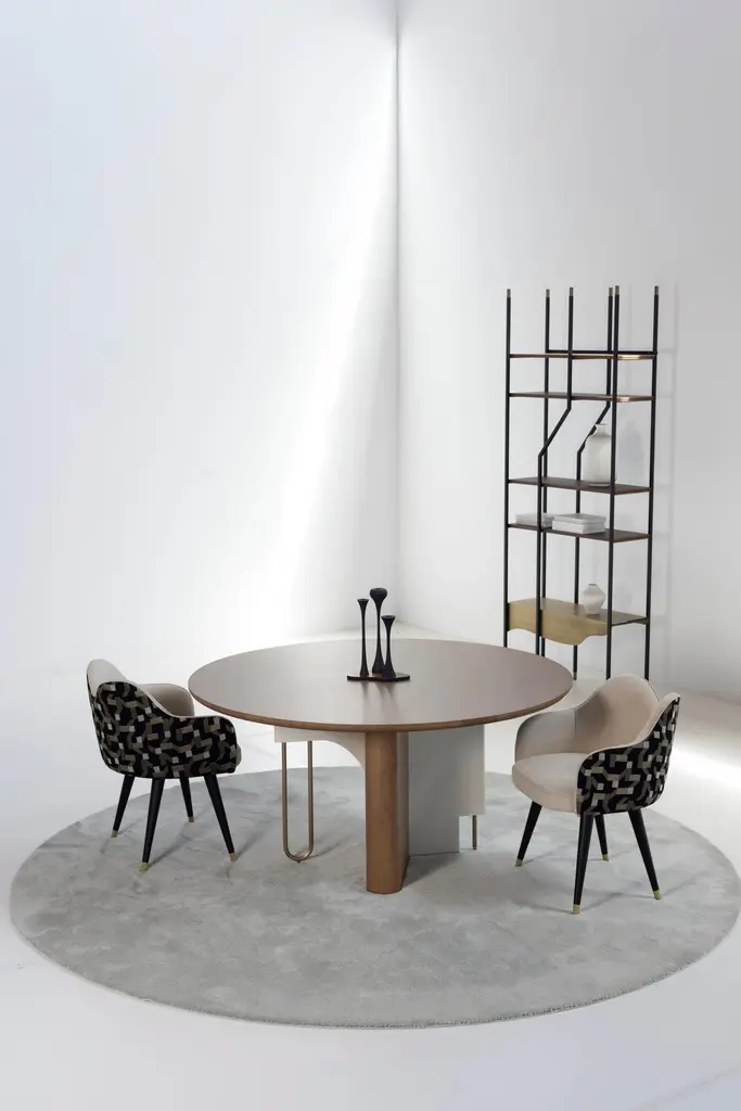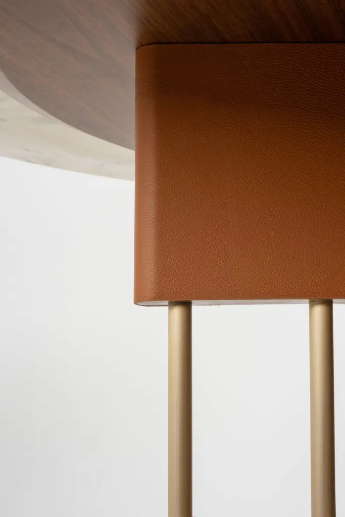 Ferreirinha Dining Table, Contemporary Collection, Handcrafted in Portugal - Europe by Greenapple.The Ferreirinha marble dining table pays homage to Antónia Adelaide Ferreira, a visionary businesswoman who defied the male-dominated Portuguese wine industry in the 19th century. Crafted with meticulous attention to detail, this marble dining table stands as a tribute to strength, resilience, and generosity—the defining qualities of the legendary “Ferreirinha.” Its sculptural design, with bold yet graceful elements, reflects her pioneering spirit, which continues to inspire generations.The Ferreirinha dining table features a polished Calacatta Cremo marble top, in cream tones. Wooden base in natural brown walnut veneer, with a matte varnish, and upholstered in dark orange leather. Tubular metal base details in brushed and burnished antique brass with a matte varnish.The veneer is treated to be anti-fungal and vermin-free, ensuring exceptional longevity and preservation.The Ferreirinha dining tale can be customized in terms of dimensions, materials and finishes.Ferreirinha 8-Seat Dining Table Material CodesWD075 Walnut, Closed-pore, Varnished, Natural Brown Walnut, MatteST010 Calacatta Cremo Marble, Polished, Cream, GlossME032 Brass, Brushed, Burnished, Varnished, Antique-Brass, MatteM105039 Leather, Dark OrangeHandcrafted in Portugal - Europe by GreenappleUnique by design, Crafted by peopleGreenapple transforms contemporary spaces into exclusive narratives of design and craftsmanship. From custom-made furniture to bespoke interiors, each creation is a timeless work of art, shaped by master artisans who honor centuries-old techniques.Founded in 2005 by Sérgio Rebola and Rute Martins, Greenapple has earned global recognition among high-end clientele and leading design firms. While Rute designs each unique piece, Sérgio ensures uncompromising quality from design to production and from production to your home. We provide a seamless experience, offering short production lead times, worldwide delivery within 7 to 10 days, and white-glove service upon request.For U.S. clients, we can handle all customs clearance, cover duties, and offer white-glove service as well upon request.Table, Round Table