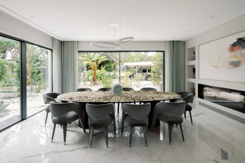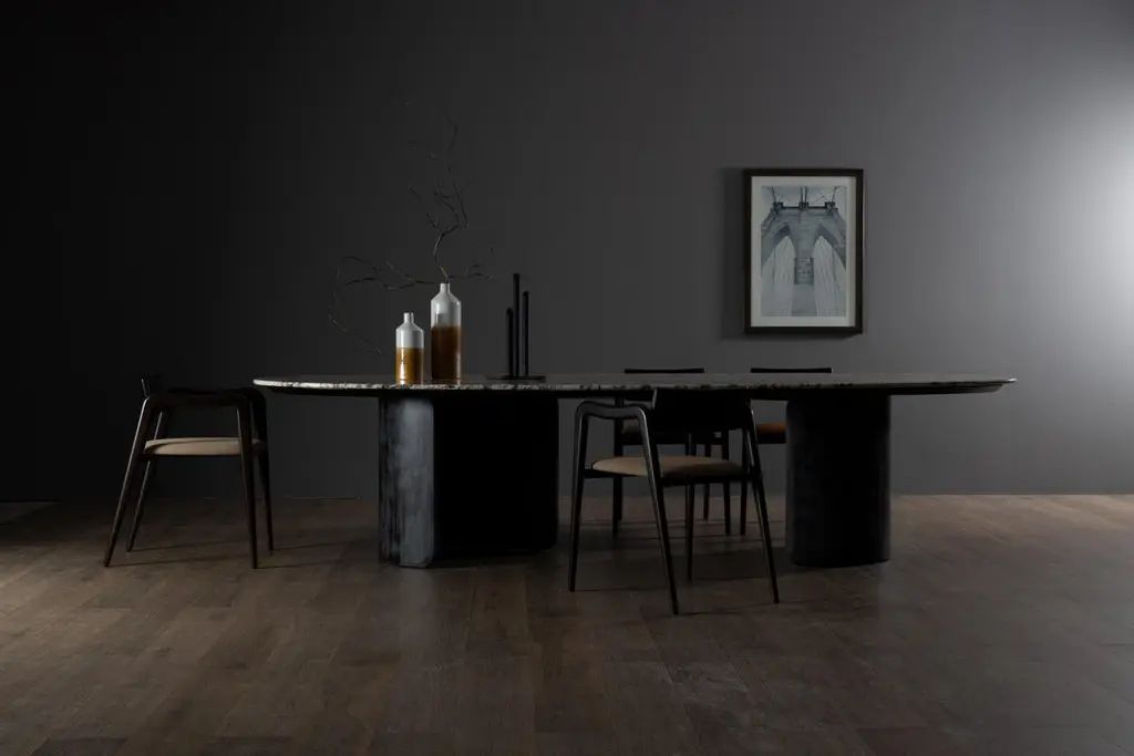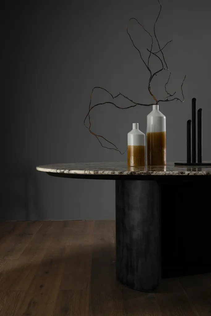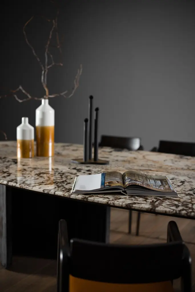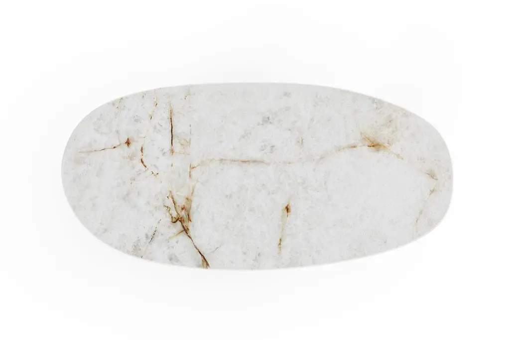 Organic Modern Gimonde Dining Table, Contemporary Collection, Handcrafted in Portugal - Europe by Greenapple.The Gimonde marble dining table is a bold expression of exclusive design and natural beauty. Its sculptural marble top showcases organic textures and rich patterns, making each piece truly one of a kind. A tribute to raw materials and expert craftsmanship, the Gimonde marble dining table transforms any dining space into a statement of timeless sophistication.The Gimonde dining table features a top in polished Cristallo Trasacqua Natural Quartz in white and rust tones, supported by two semicircular bases in brushed and burnished dark antique brass with a matte varnish.The Gimonde dining table can be customized in terms of dimensions, materials and finishes. Gimonde 10-Seat Dining Table Material CodesST100 Cristallo Trasacqua Natural Quartz, Polished, White-Rust, GlossME032 Brass, Brushed, Burnished, Varnished, Antique-Brass, MatteHandcrafted in Portugal - Europe by GreenappleUnique by design, Crafted by peopleGreenapple transforms contemporary spaces into exclusive narratives of design and craftsmanship. From custom-made furniture to bespoke interiors, each creation is a timeless work of art, shaped by master artisans who honor centuries-old techniques.Founded in 2005 by Sérgio Rebola and Rute Martins, Greenapple has earned global recognition among high-end clientele and leading design firms. While Rute designs each unique piece, Sérgio ensures uncompromising quality from design to production and from production to your home. We provide a seamless experience, offering short production lead times, worldwide delivery within 7 to 10 days, and white-glove service upon request.For U.S. clients, we can handle all customs clearance, cover duties, and offer white-glove service as well upon request.Table