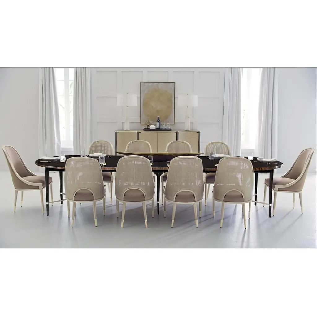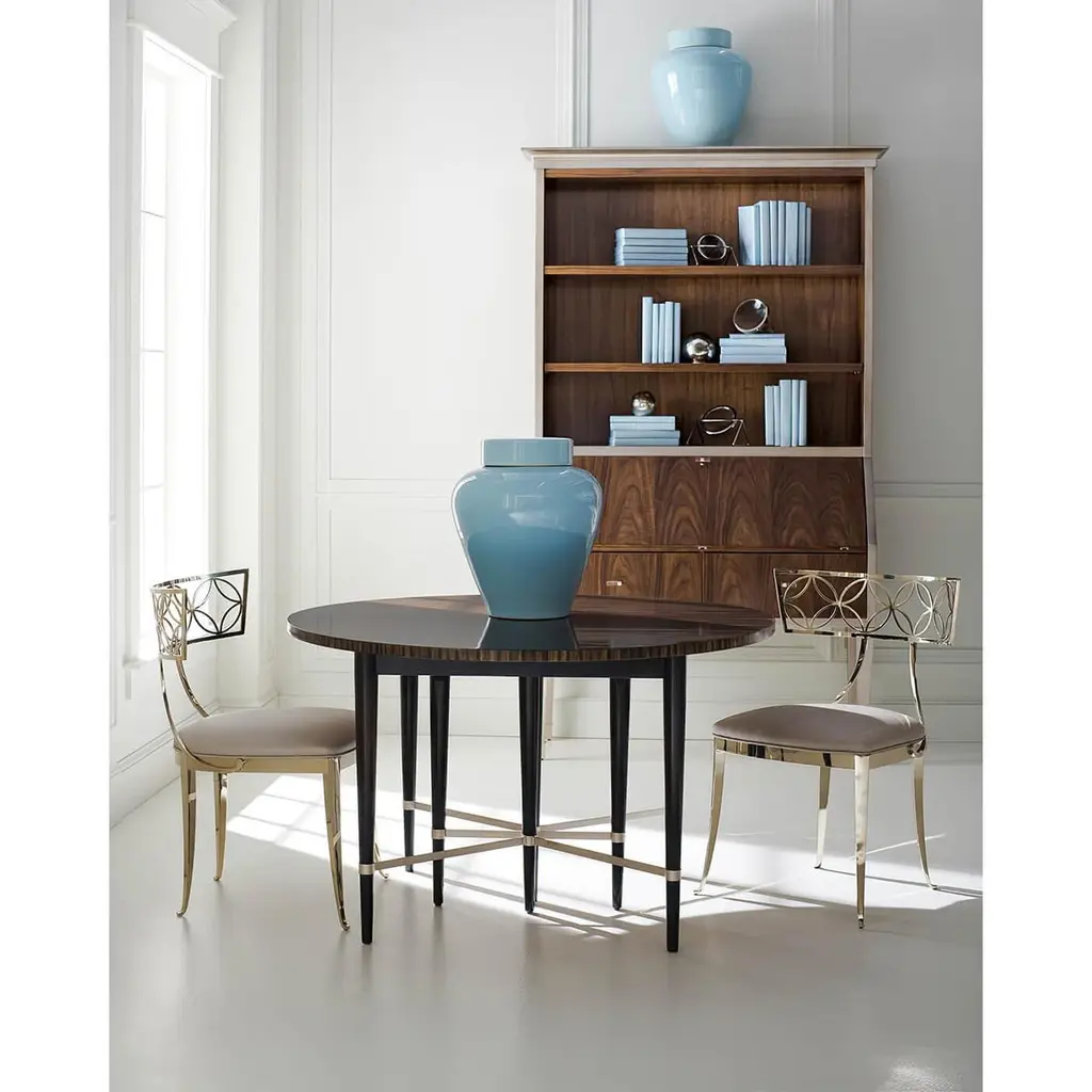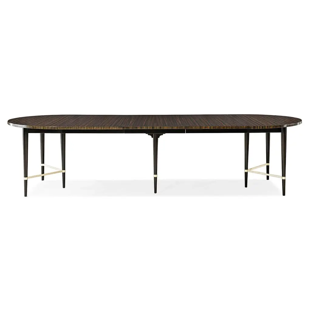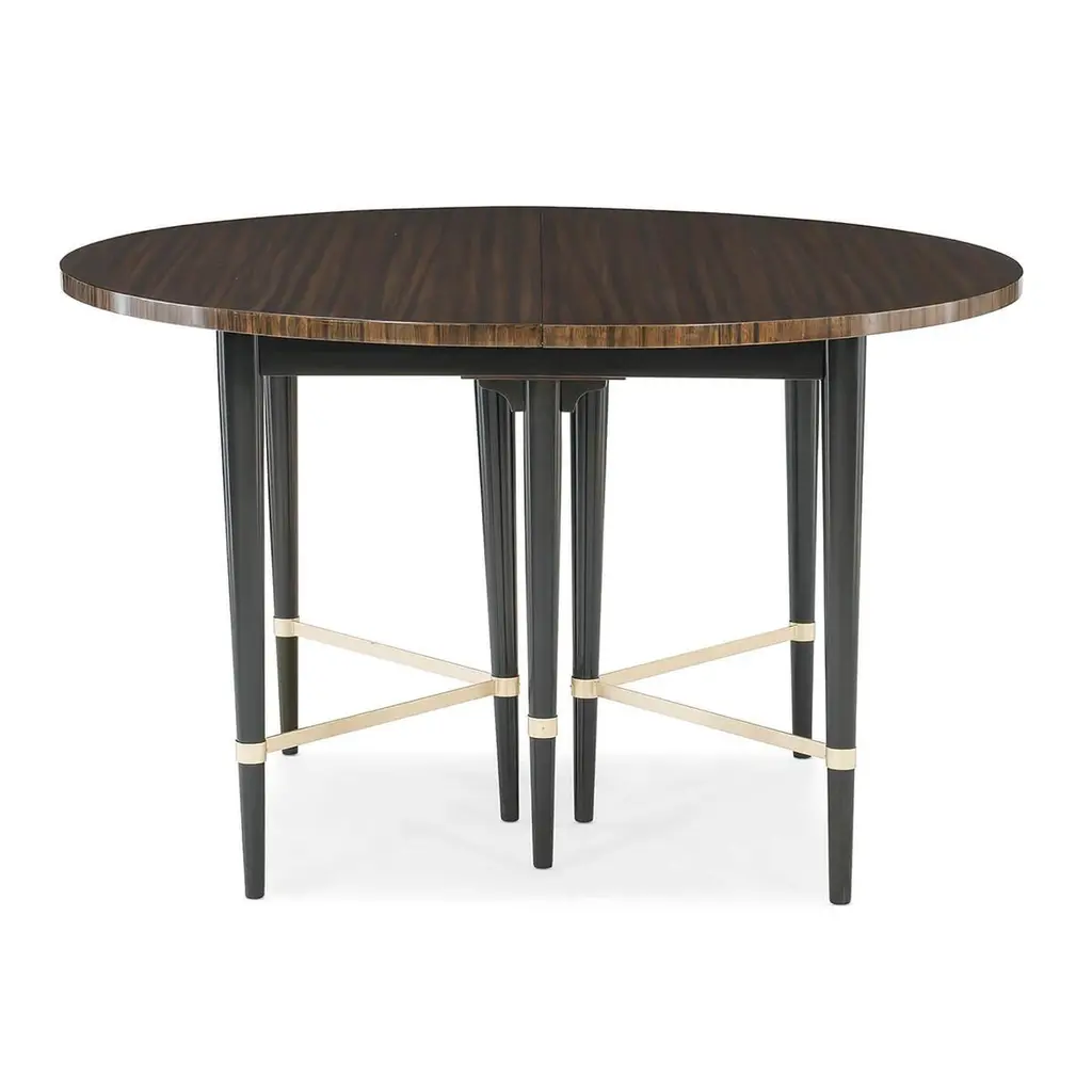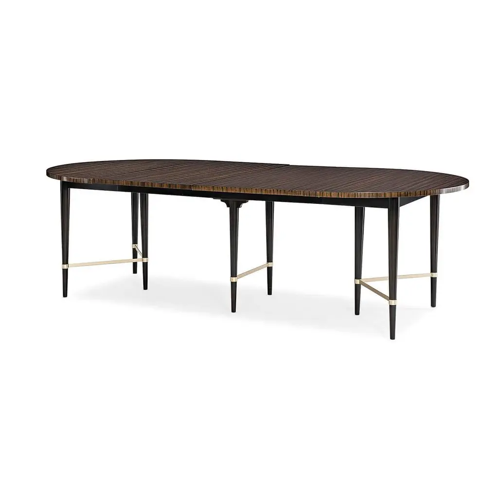 A Mid-Century Modern style extending dining table. For gatherings small or large, this bold statement-making dining table will sweep you off your feet. Its contemporized traditional profile is designed to accommodate groups from four to 12.Quartered Paldao wood distinguishes the tabletop and is finished in a rich shade of saddle while a deep black saddle finish adds depth to its legs and apron. A Neutral Metallic highlights its stretchers for an added element of glamour. As your party grows, this impressive table can be extended to 144 inches with the addition of four 24-inch leaves.DimensionsClosed: 48" W x 48" D x 30" HFully opened: 144" W x 48" D x 30" HCan be used with any amount of the four 24" leaves.