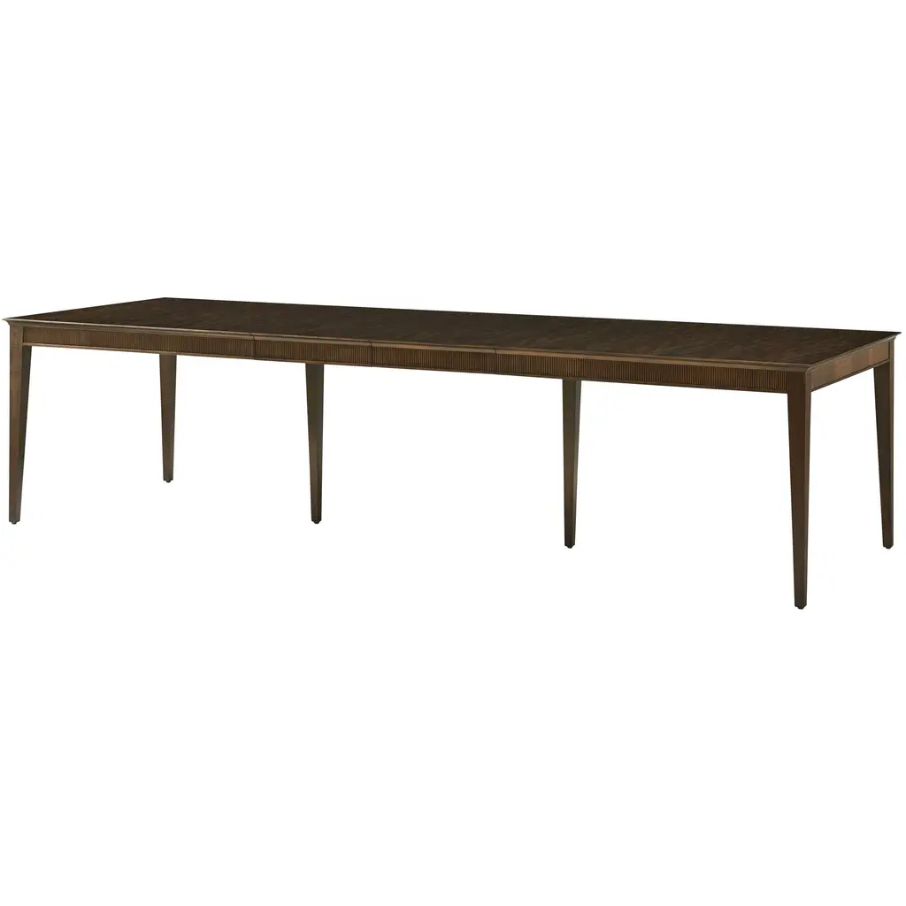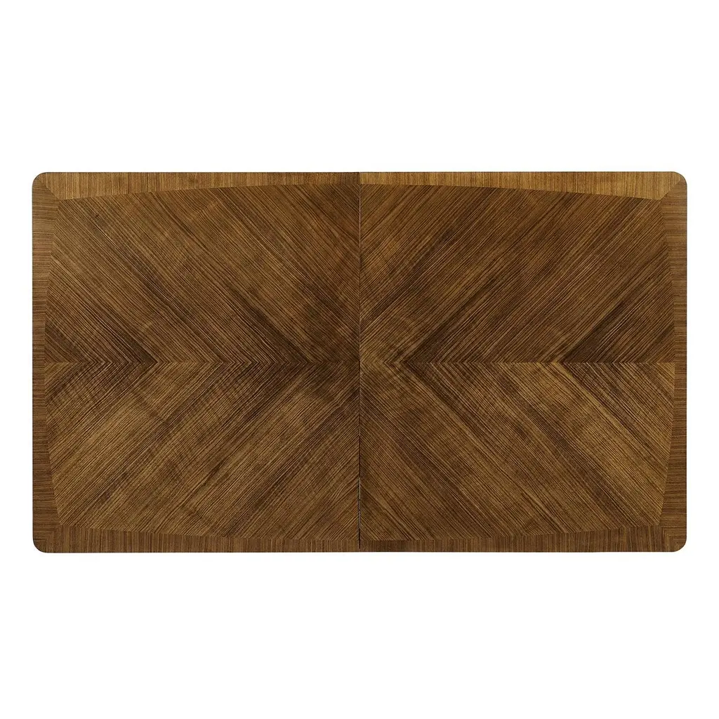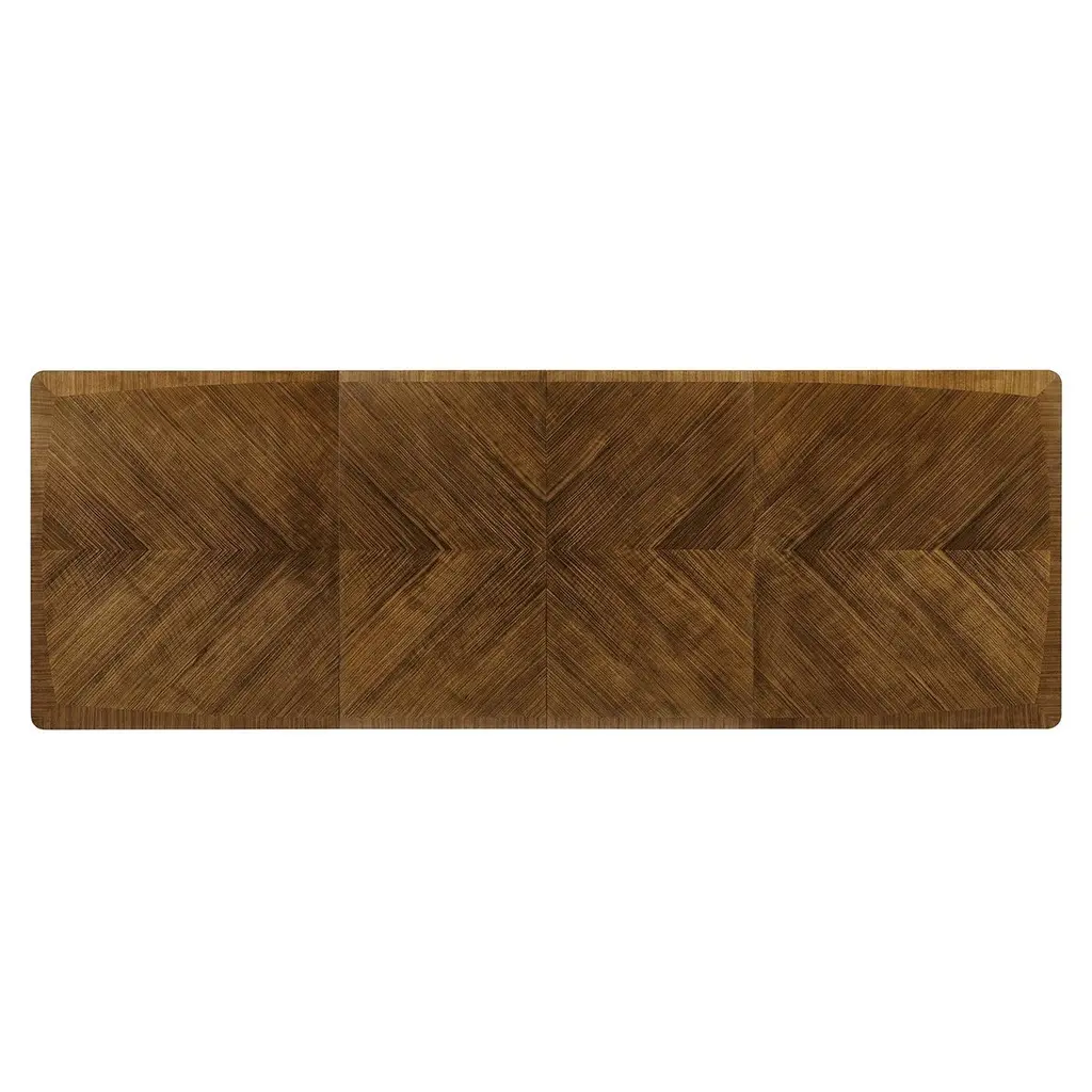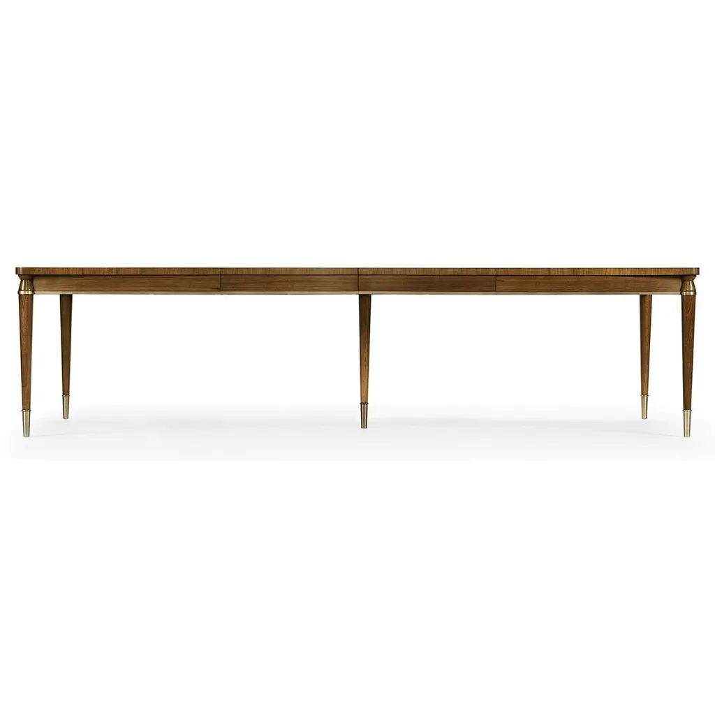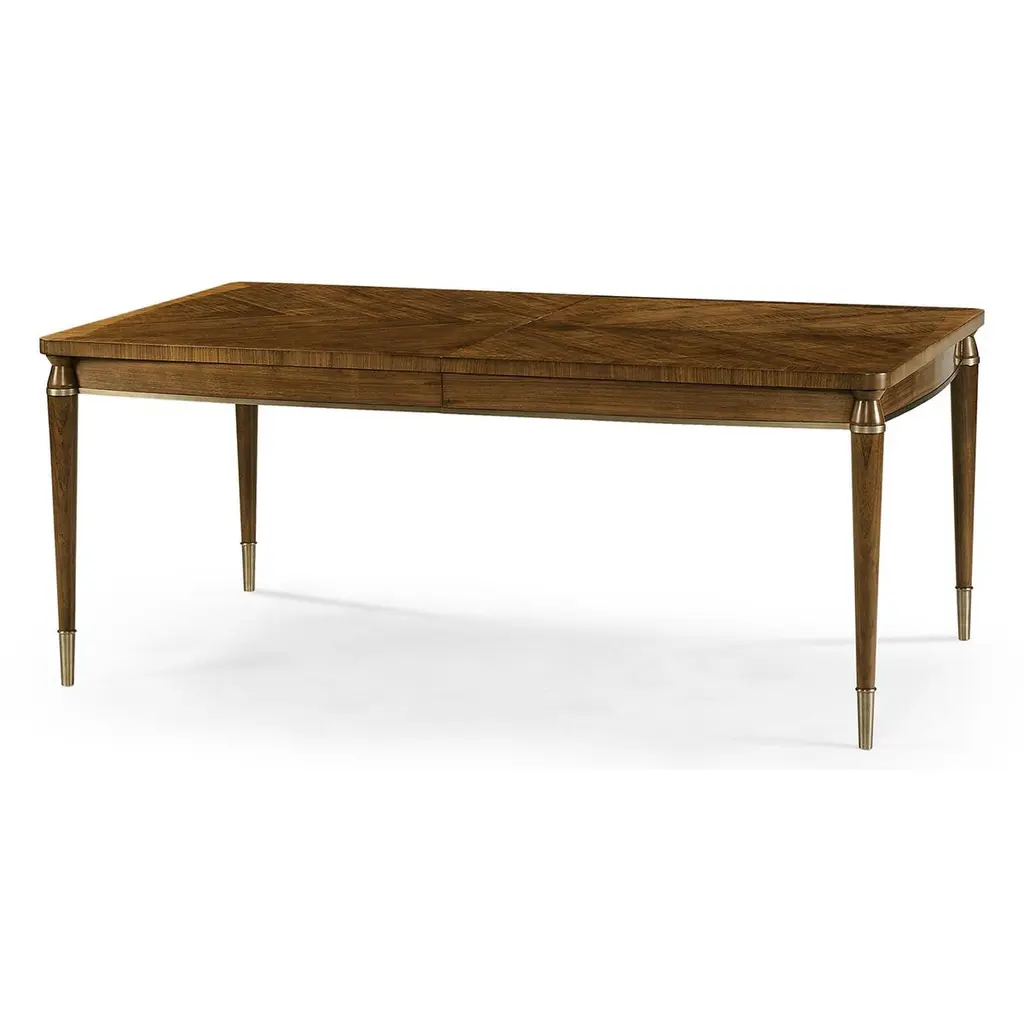 A Mid-Century Modern extending dining table with a crossbanded and figured walnut veneer in a book-matched pattern reminiscent of straw work with brass hardware and trim on turned and tapered legs also with brass caps.Dimensions: 120" W x 42" D x 30" HClosed dimensions: 72" W x 42" D x 30" Hwith two 24" leaves.