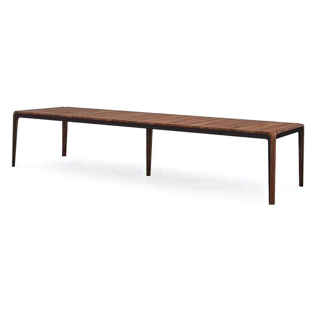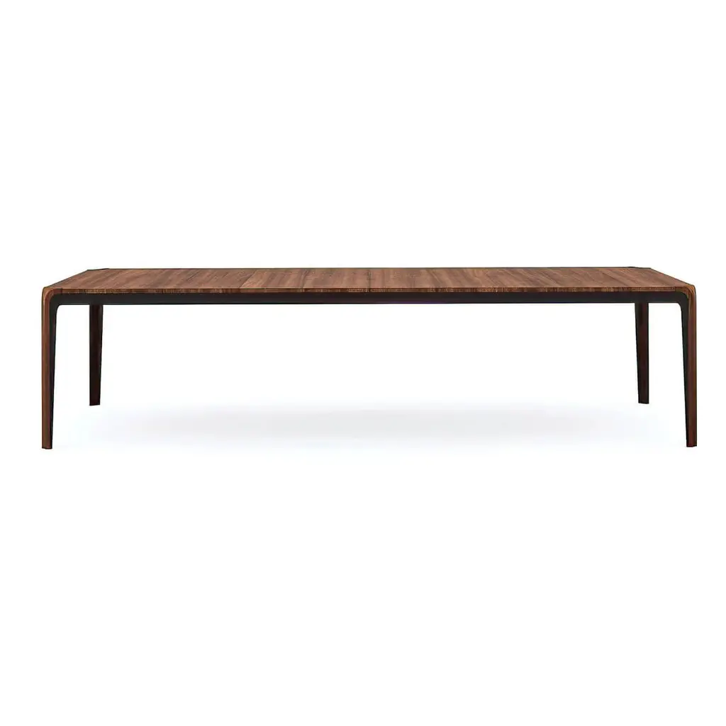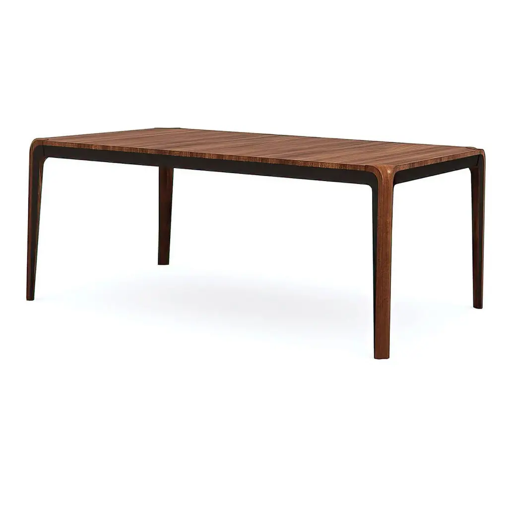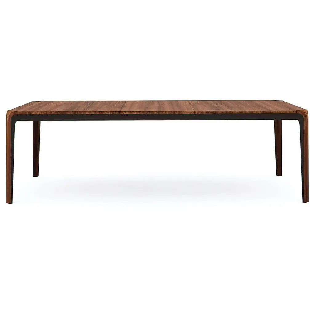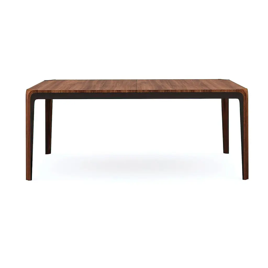 A Mid Century Modern-style walnut extending dining table with tapered legs. The tabletop is finished in rich walnut with mitered edges in Dark Chocolate. It features self-storing leaves and a foldable center support leg that tucks away neatly when not in use. Comfortably seats 8 without leaves, and seats 14 when fully expanded with three leaves. This table is a beautiful balance between refined simplicity and modern functionality. DIMENSIONSOpen: 145" W x 44" D x 29.5" H Closed: 73" W x 44" D x 29.5" H.Includes three 24" Leaves.