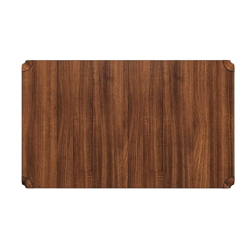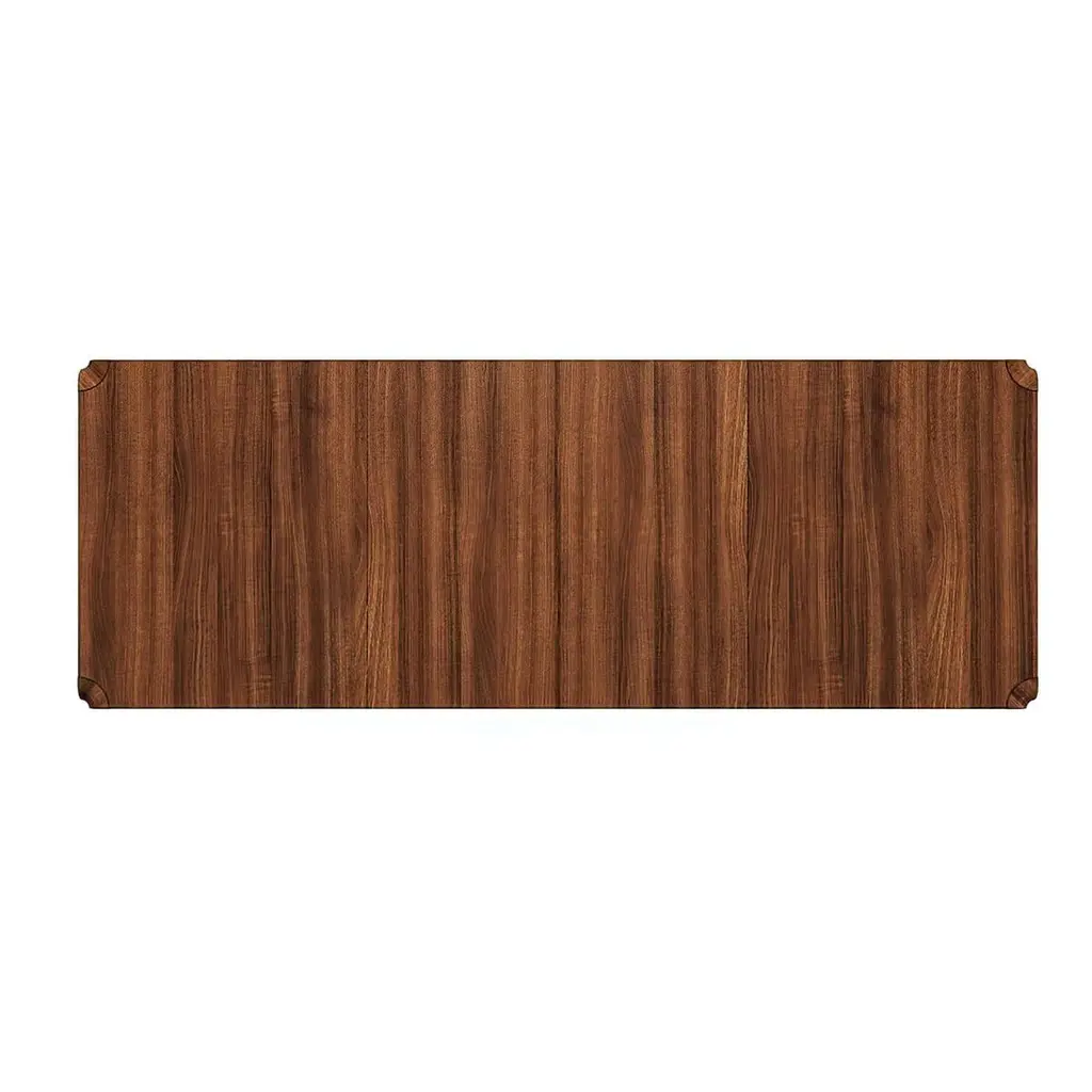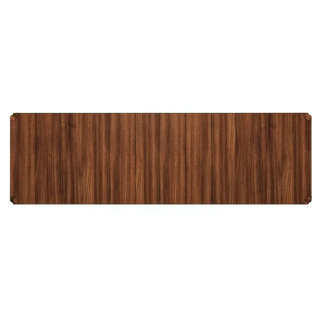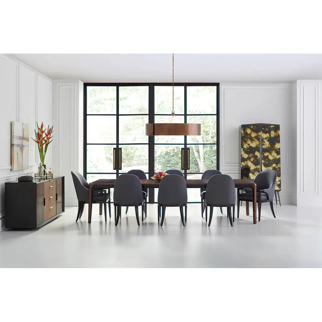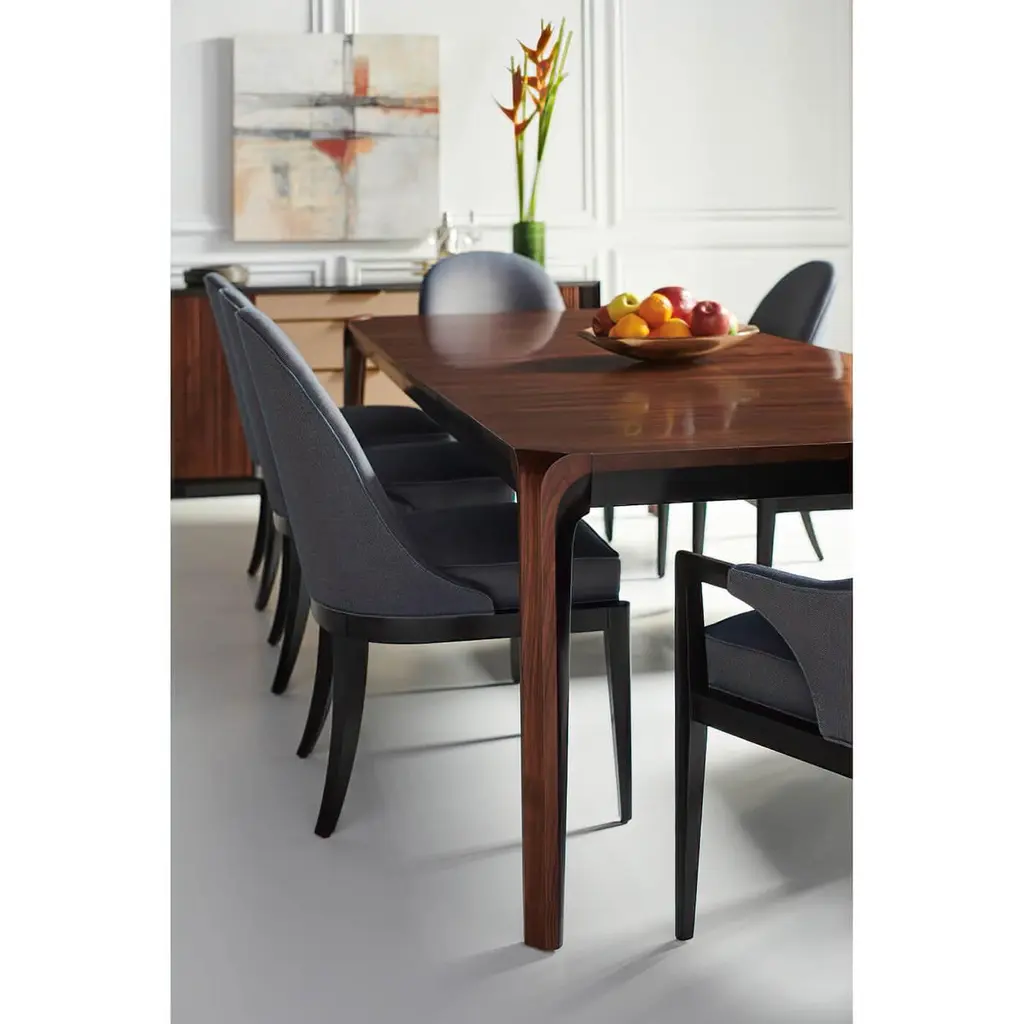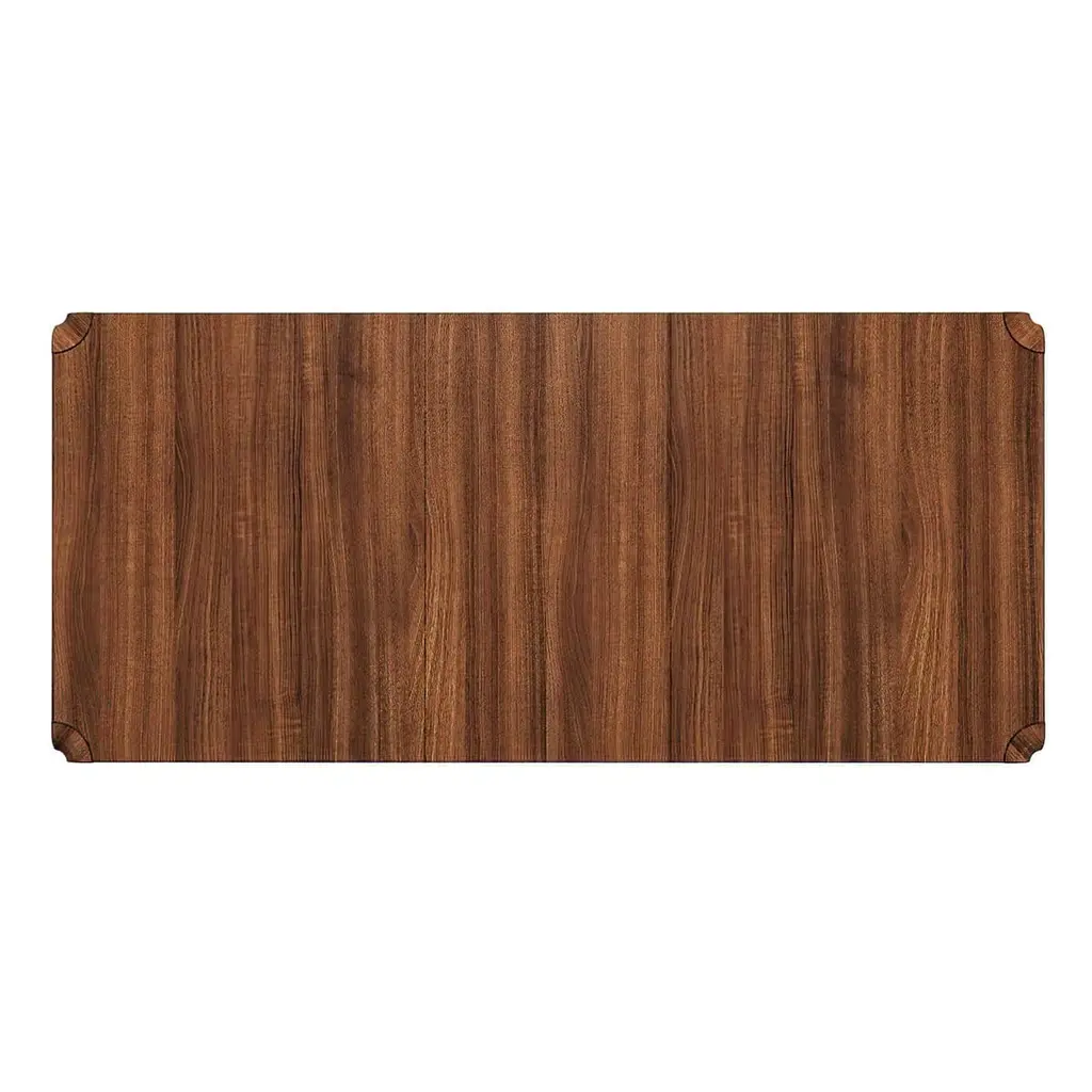 A Mid Century Modern-style walnut extending dining table with tapered legs. The tabletop is finished in rich walnut with mitered edges in Dark Chocolate. It features self-storing leaves and a foldable center support leg that tucks away neatly when not in use. Comfortably seats 8 without leaves, and seats 14 when fully expanded with three leaves. This table is a beautiful balance between refined simplicity and modern functionality. DIMENSIONSOpen: 145" W x 44" D x 29.5" H Closed: 73" W x 44" D x 29.5" H.Includes three 24" Leaves.