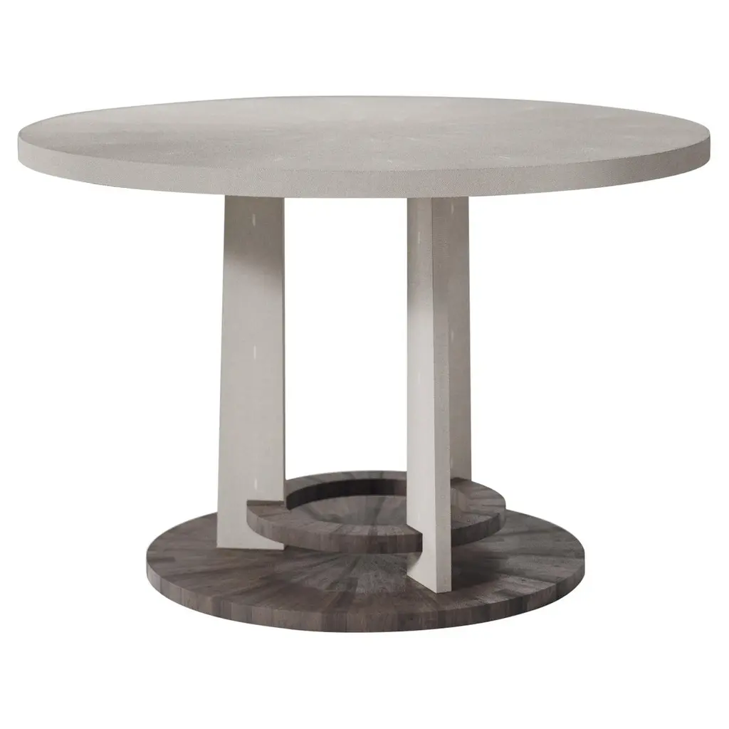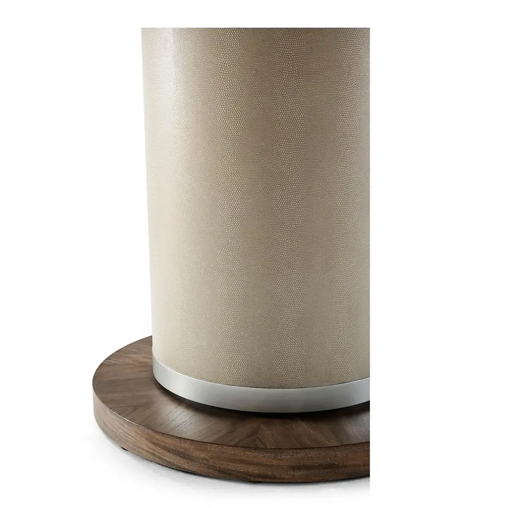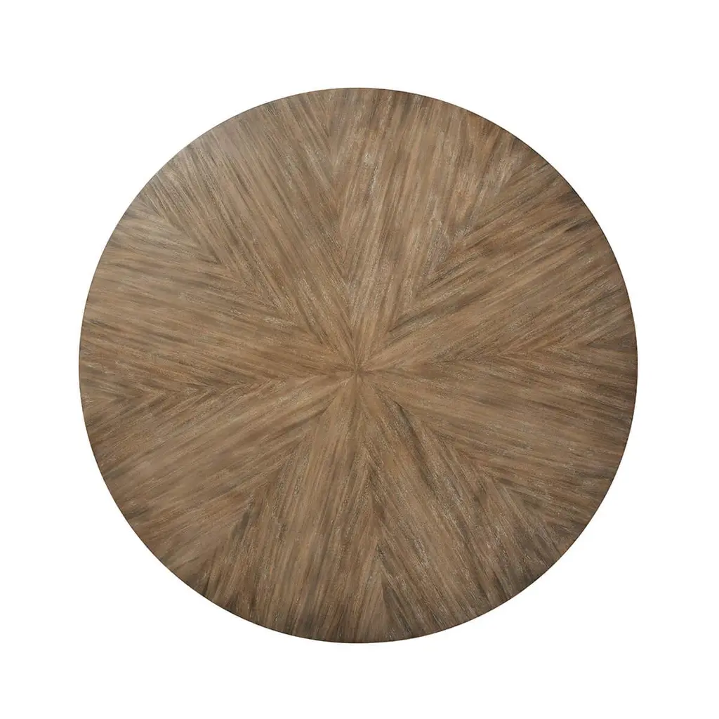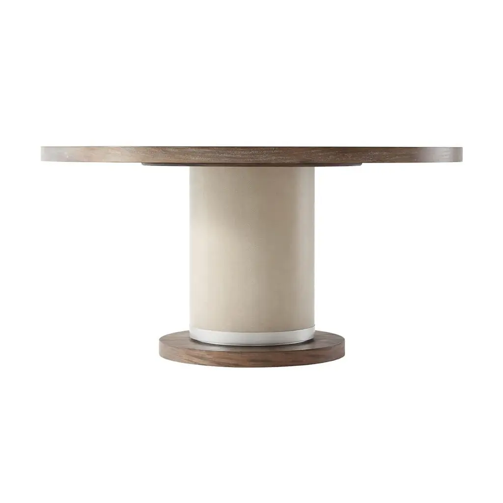 with a sunburst inlaid mangrove primavera veneered circular top in raised on a cylindrical column pedestal wrapped in Komodo embossed leather, with brushed nickel accents and a veneered platform base.Dimensions: 60 " W x 60" D x 30" H