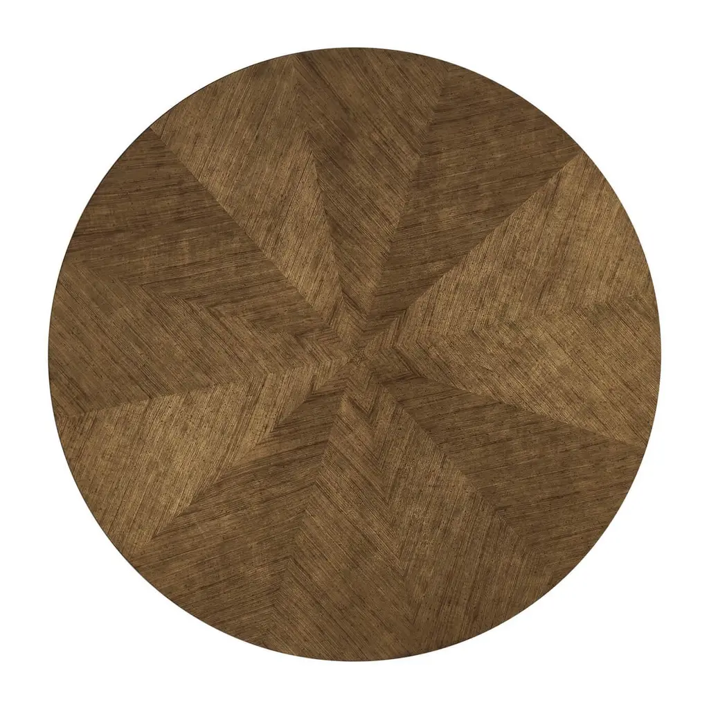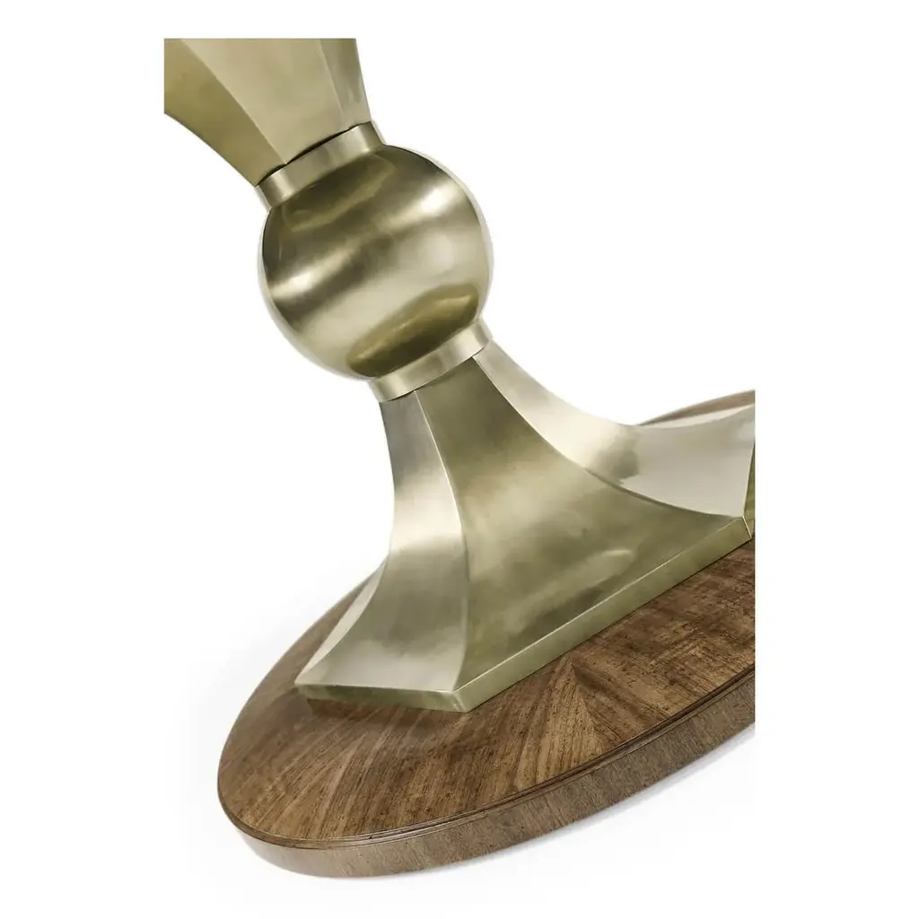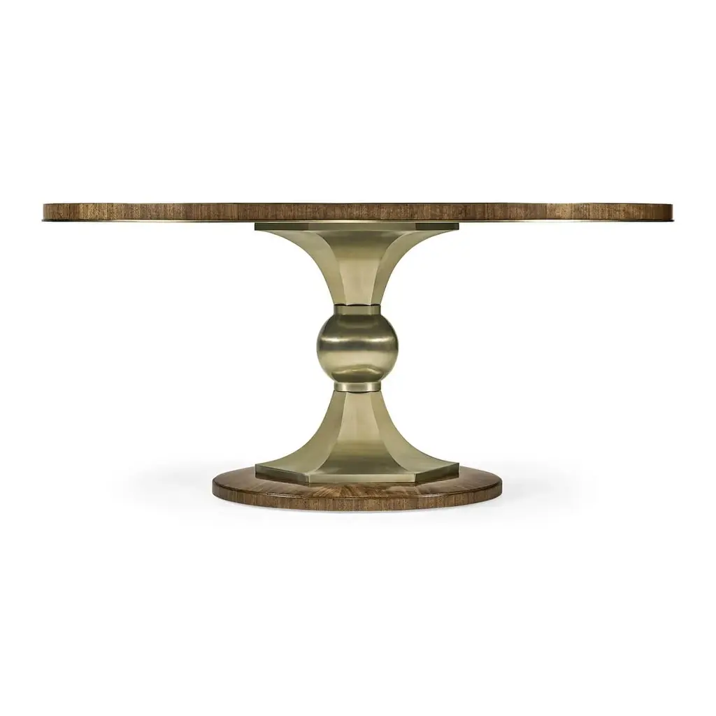 A Mid Century Style Walnut and steel round dining table. The top of the dining table features American walnut veneers with a transparent, low luster lacquer. The base is fabricated from steel and finished in a light, champagne patina. Dimensions: 64 3/8" W x 64 3/8" D x 30" H