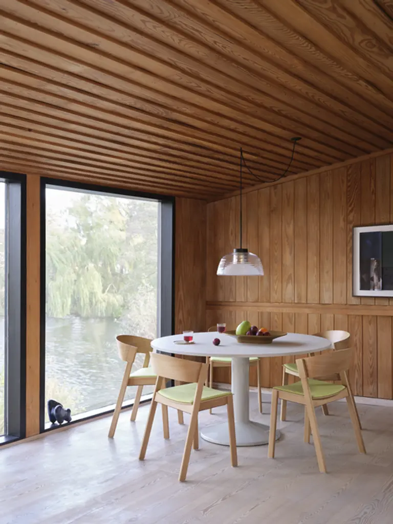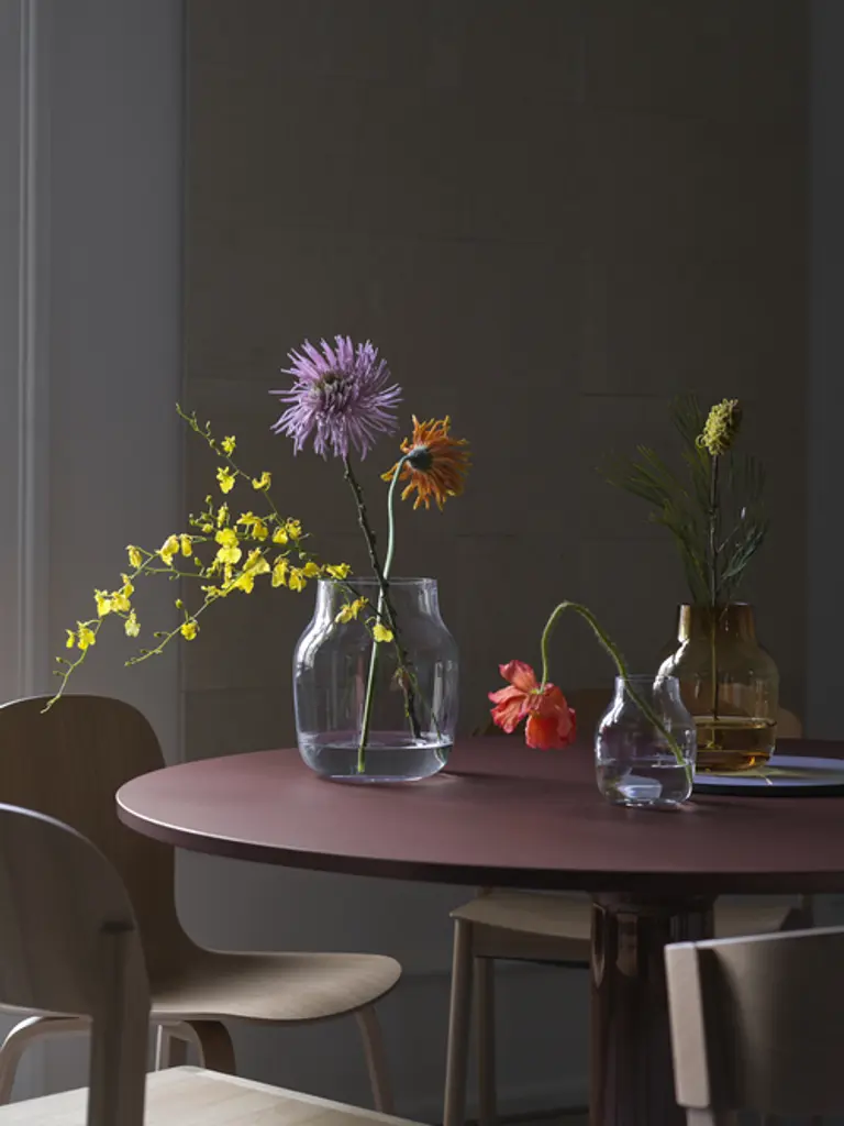 A natural focal point of the home, the Midst Table is a generous, round dining table where friends and family gather—with room to welcome more. Its refined silhouette is simple yet characteristic, enhanced by distinct detailing and contrasting materiality—matte solid oak, linoleum, or honed marble on a monolithic base made of spun steel with a durable high-gloss finish.