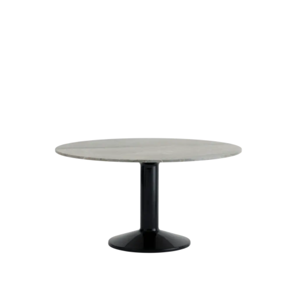 A natural focal point of the home, the Midst Table is a generous, round dining table where friends and family gather—with room to welcome more. Its refined silhouette is simple yet characteristic, enhanced by distinct detailing and contrasting materiality—matte solid oak, linoleum, or honed marble on a monolithic base made of spun steel with a durable high-gloss finish.