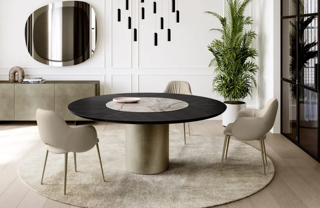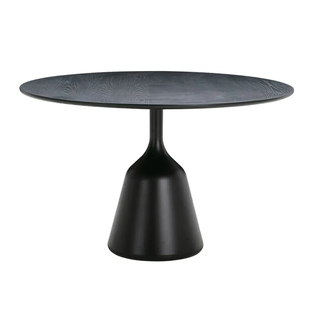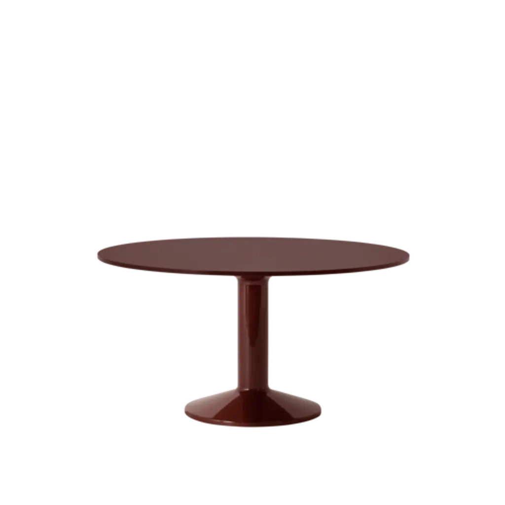 A natural focal point of the home, the Midst Table is a generous, round dining table where friends and family gather—with room to welcome more. Its refined silhouette is simple yet characteristic, enhanced by distinct detailing and contrasting materiality—matte solid oak, linoleum, or honed marble on a monolithic base made of spun steel with a durable high-gloss finish.