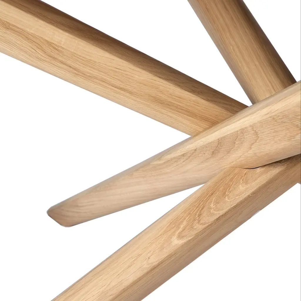The Mikado dining table, designed by Alain van Havre, has been one of our most recognizable designs for years. For its round version, we kept the same eye-catching construction but aimed for a visually lighter design. In an exercise of balance and stability, the legs are thinner and more refined with round edges to fit the solid oak dining table's new shape.
