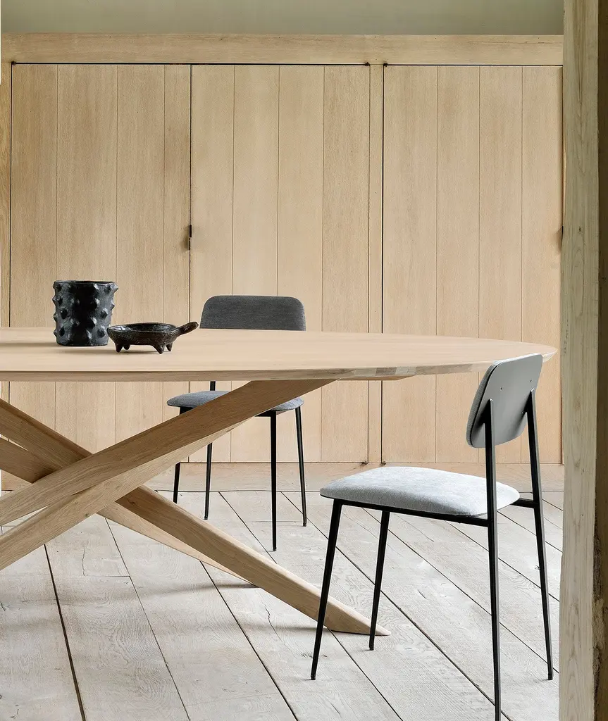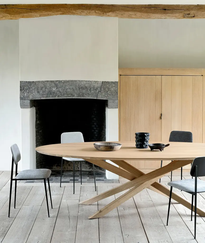 The Mikado dining table, designed by Alain van Havre, has been one of our most recognizable designs for years. Its sculptural character is the result of a quest to find a balance between functionality and stability. Mikado’s legs interlock like a well-thought-out puzzle. By exchanging the rectangular tabletop by an ellipse, we increase togetherness and connection. It's easier to interact with your guests, allows you to converse with everyone and seats over a dozen people comfortably. We tried it ourselves!