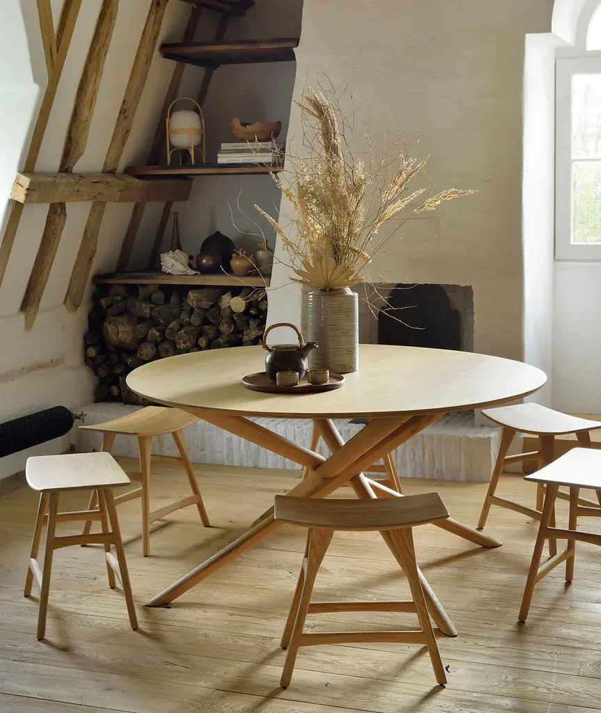 The Mikado dining table, designed by Alain van Havre, has been one of Ethnicraft's most recognizable designs for years. For its round version, they kept the same eye-catching construction but aimed for a visually lighter design. In an exercise of balance and stability, the legs are thinner and more refined with round edges to fit the table's new shape.