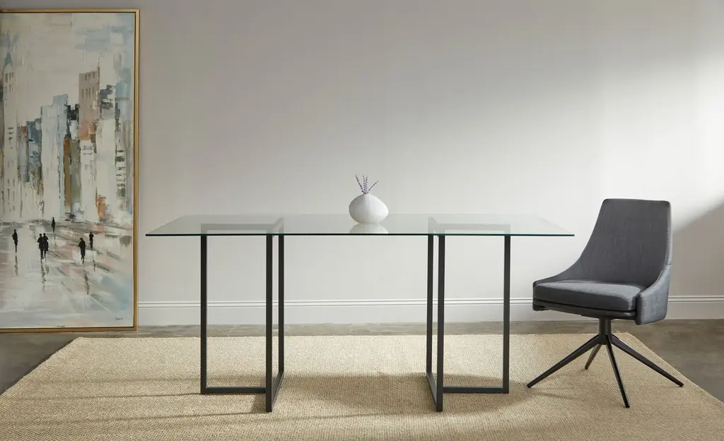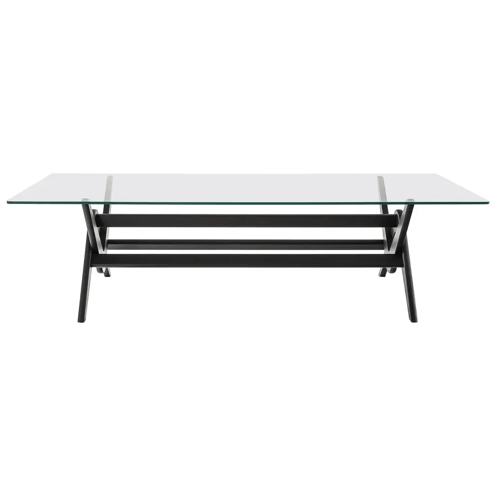 A study in minimalist chic, this dining table rests a transparent tempered-glass top on a pair of matte black T-shape steel bases. Clear suction discs secure the top to the bases, and adjustable feet ensure stability.