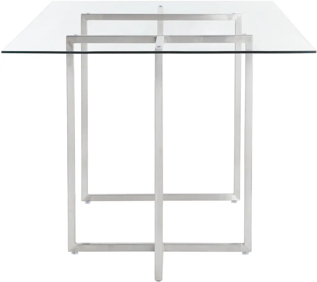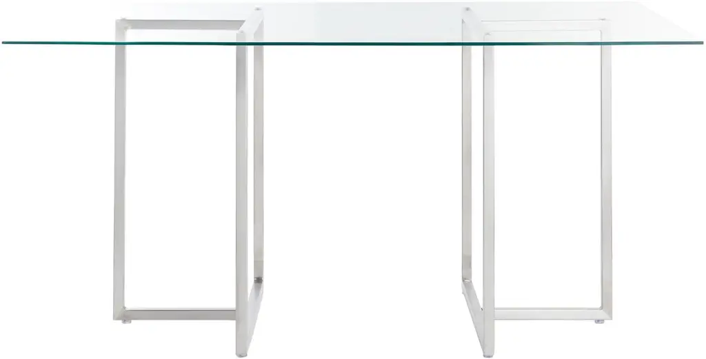 A study in minimalist chic, this dining table rests a transparent tempered-glass top on a pair of T-shape steel bases given a chrome finish. Clear suction discs secure the top to the bases, and adjustable feet ensure stability.