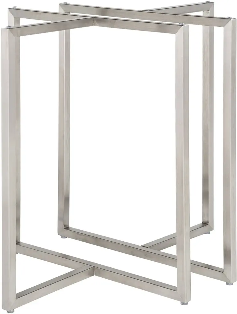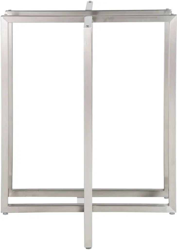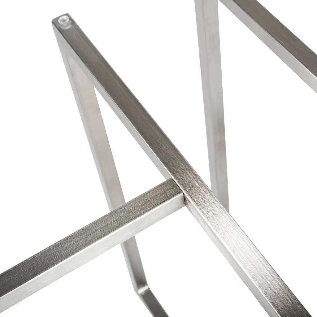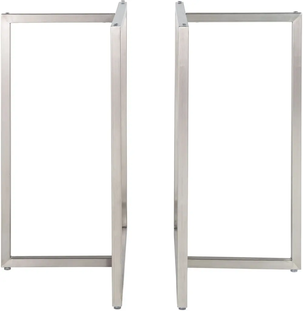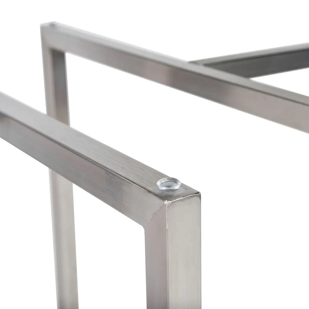 A study in minimalist chic, this dining table rests a transparent tempered-glass top on a geometric steel base given a gleaming chrome finish. Clear suction discs secure the top to the bases, and adjustable feet ensure stability.