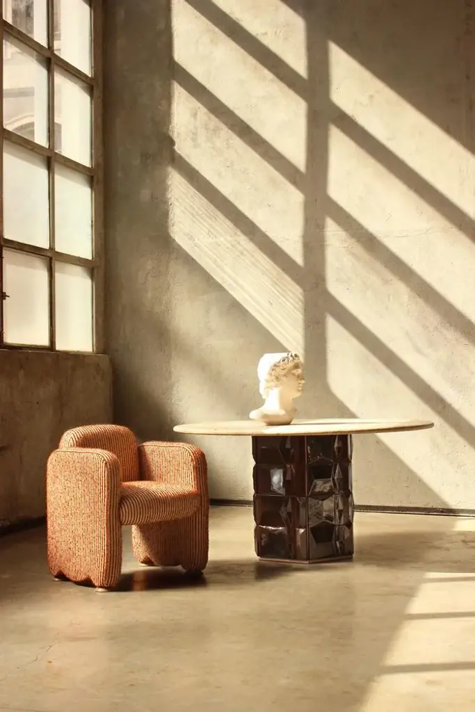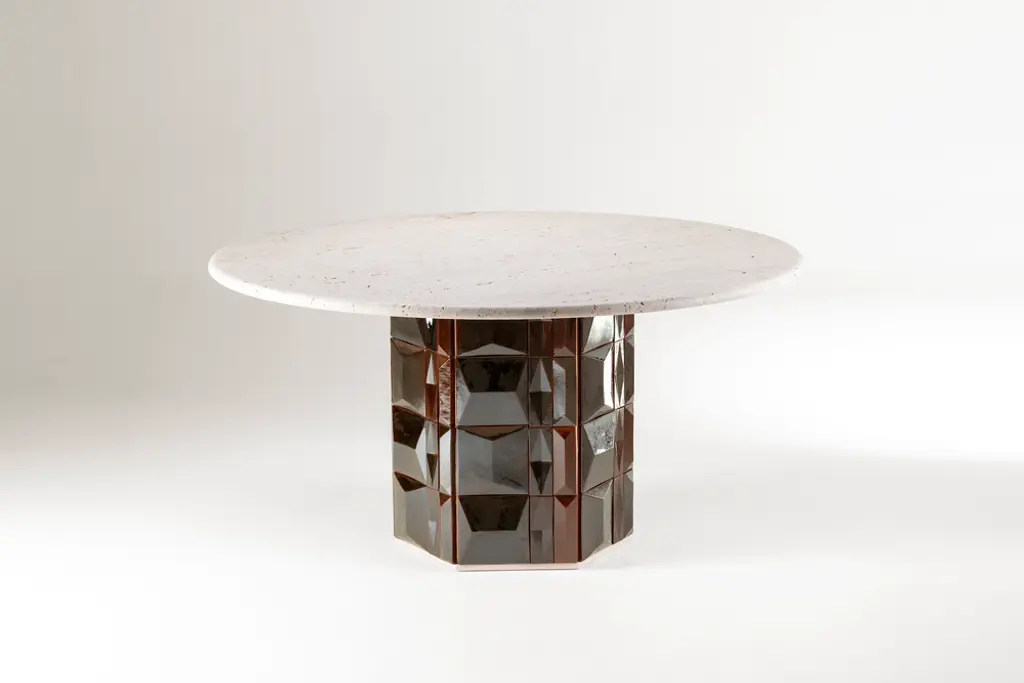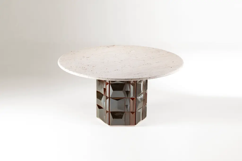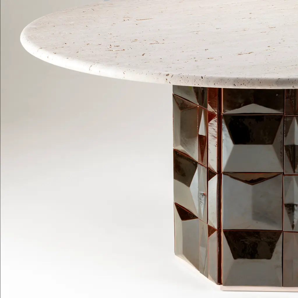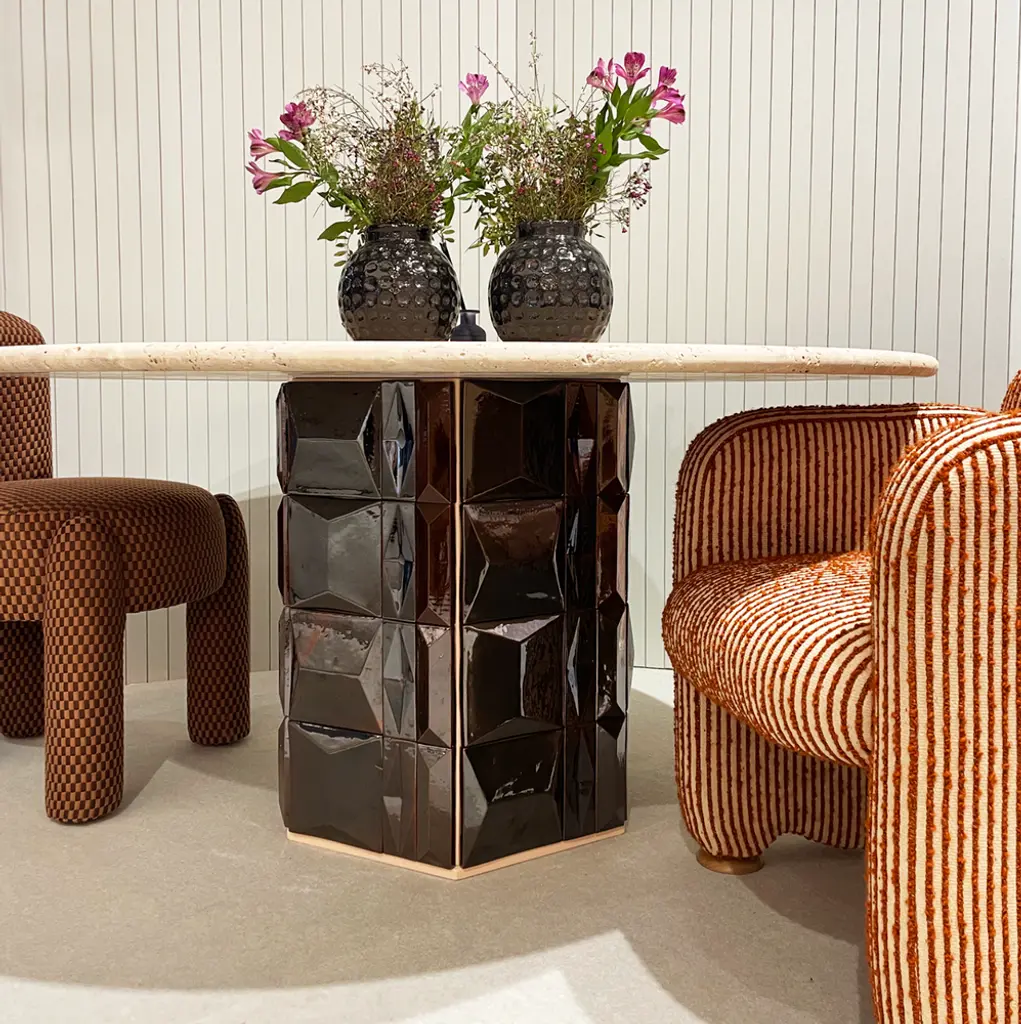 Born from a collaboration with Theia Tiles, the Milano Table celebrates the beauty of handcrafted design. This fully handmade piece features a hexagonal base clad in terracotta tiles arranged in a harmonious blend of three unique models. The lacquered wood and terracotta combination create an interplay of texture and precision. Anchored by a round tabletop, the true focal point lies in the sculptural table feet, making the Milano Table a bold and elegant centrepiece for any space.