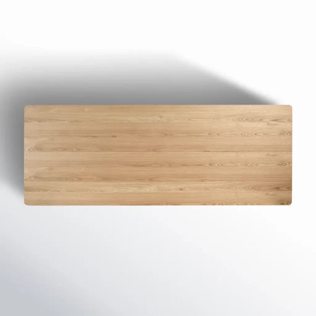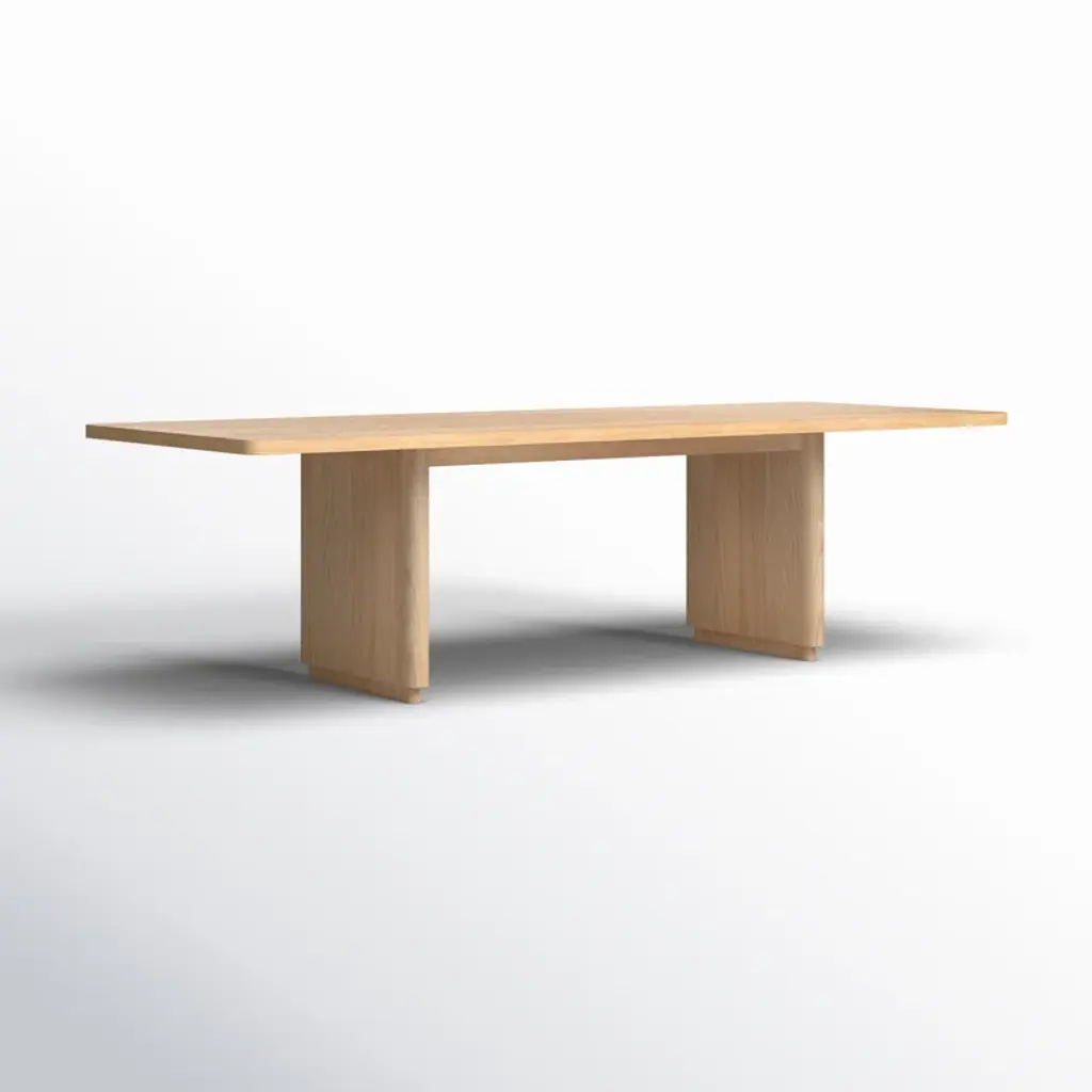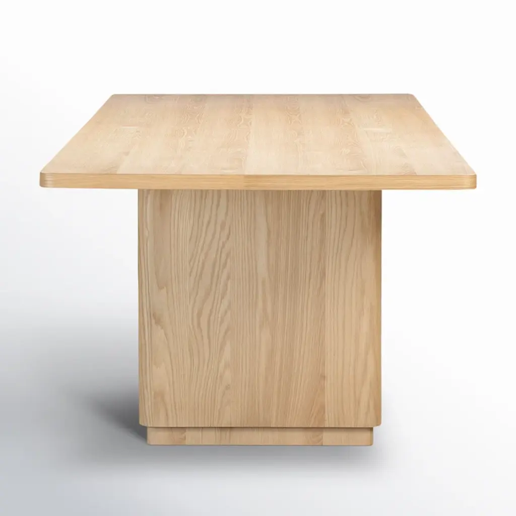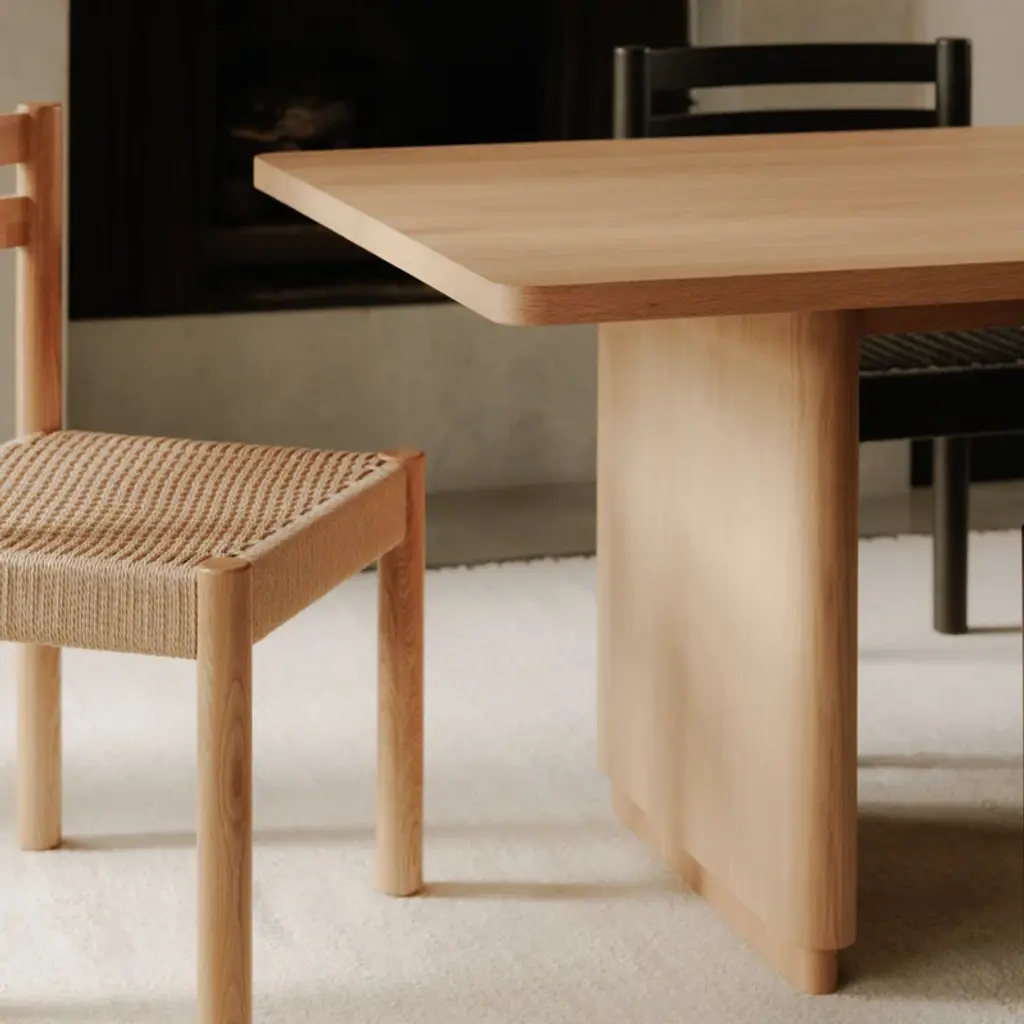 Scandi minimalism. This dining table balances space + clean lines to elevate your space. The rectangular top rests on a solid wood pedestal base with rounded edges. Natural wood grain color and pattern variation offers organic visual dimension. Plus, the kiln-dried construction provides stability + durability. Pair with the chairs of your choice.