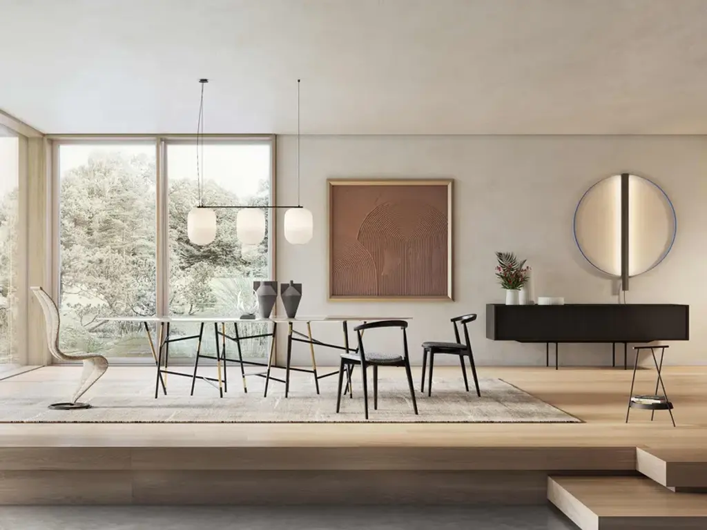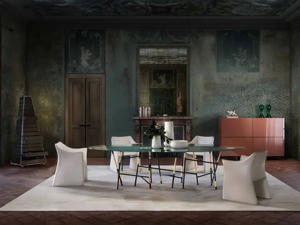 Millepiedi is a collection of dining or meeting tables that shows the hallmark of Dimorestudio’s unique and refined design. The top, characterized by a very thin thickness, rests on a base made of thick metal pipes that give the product a unique and highly recognisable look. The version with elliptical top, available in white Carrara or grey Roma marble, or matt or polish lacquered wood in all the colours from the collection, features a black base enriched with brass inserts, creating an elegant contrast and a perfect balance between different materials. The new versions with round and rectangular top, available only in matt or polish lacquered finish, feature a total black or chromed base for a more minimalist yet equally impactful look.With its sculptural design and high-quality materials, the Millepiedi table is the ideal choice for those looking for contemporary furniture that combines functionality, sophistication, and a strong visual impact. Perfect for decorating residential spaces, offices, and contract environments, this table represents the perfect synthesis of aesthetics and practicality.Notes- The marble top and base with brass inserts are only available for the MPI1 version- The black and chrome-plated bases are only available for the MPI2 and MPI4 versions- In the marble-top version, in addition to the metal base plates there is also an HPL under-top support- In case of handling, the table must be lifted from the base plates and not directly from the top