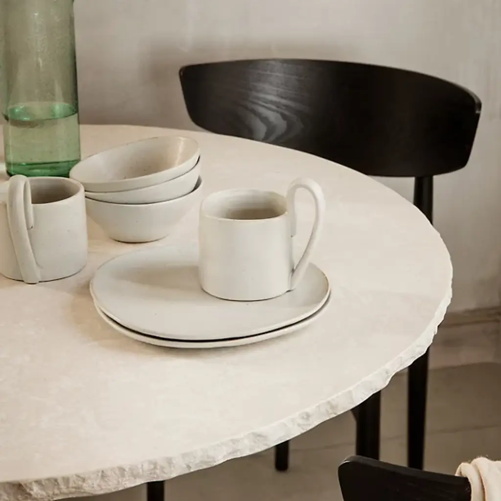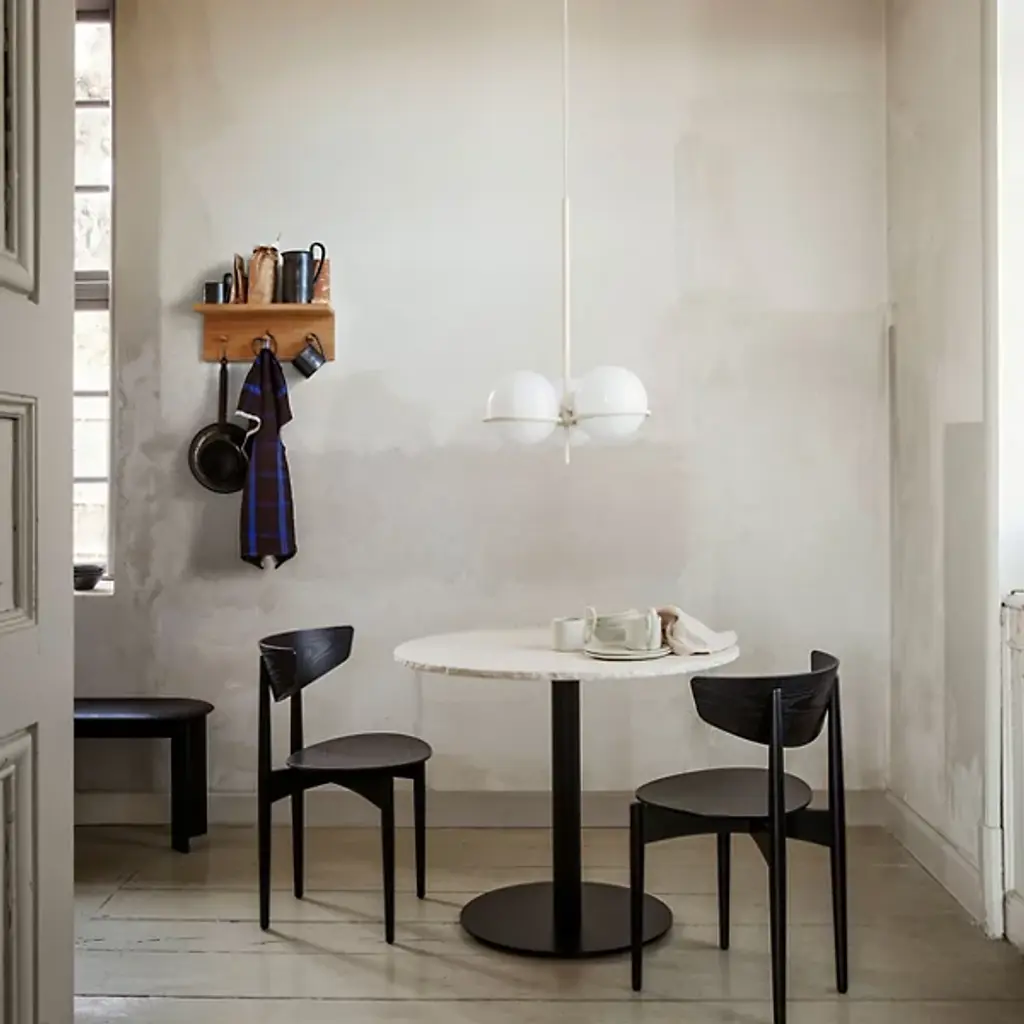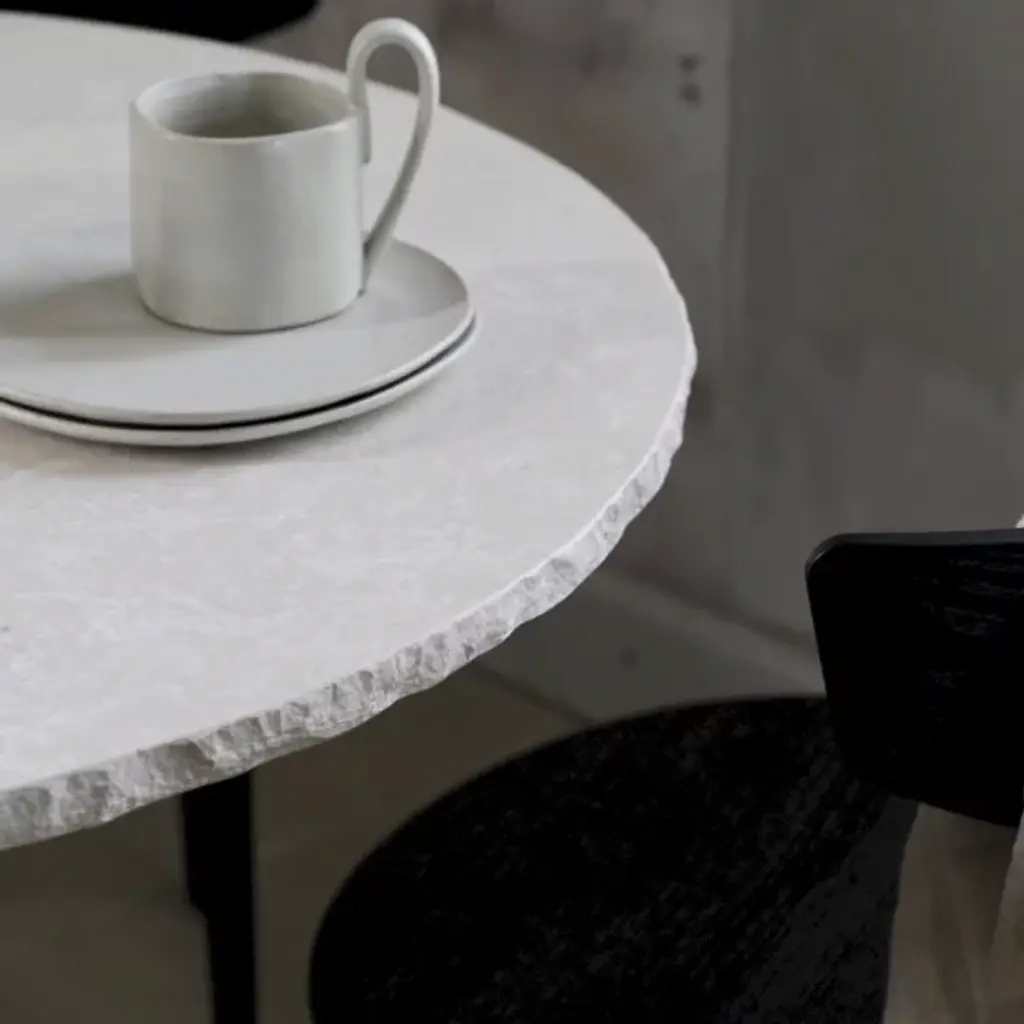 The Mineral Dining Table Ferm Living blends ruggedness and refinement. This dining table features a Bianco Curia marble tabletop that has been meticulously hand-chiseled, showcasing excellent craftsmanship. The round top has a broken-edged look, bringing character to your living space. A powder-coated galvanized steel column is durably made and nicely balanced by a round baseplate. Place this versatile dining table in a variety of contemporary settings to revamp your décor.