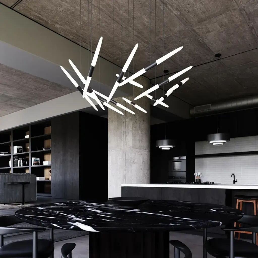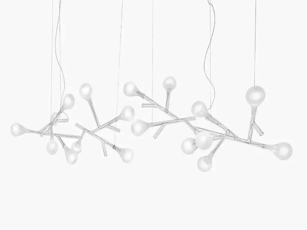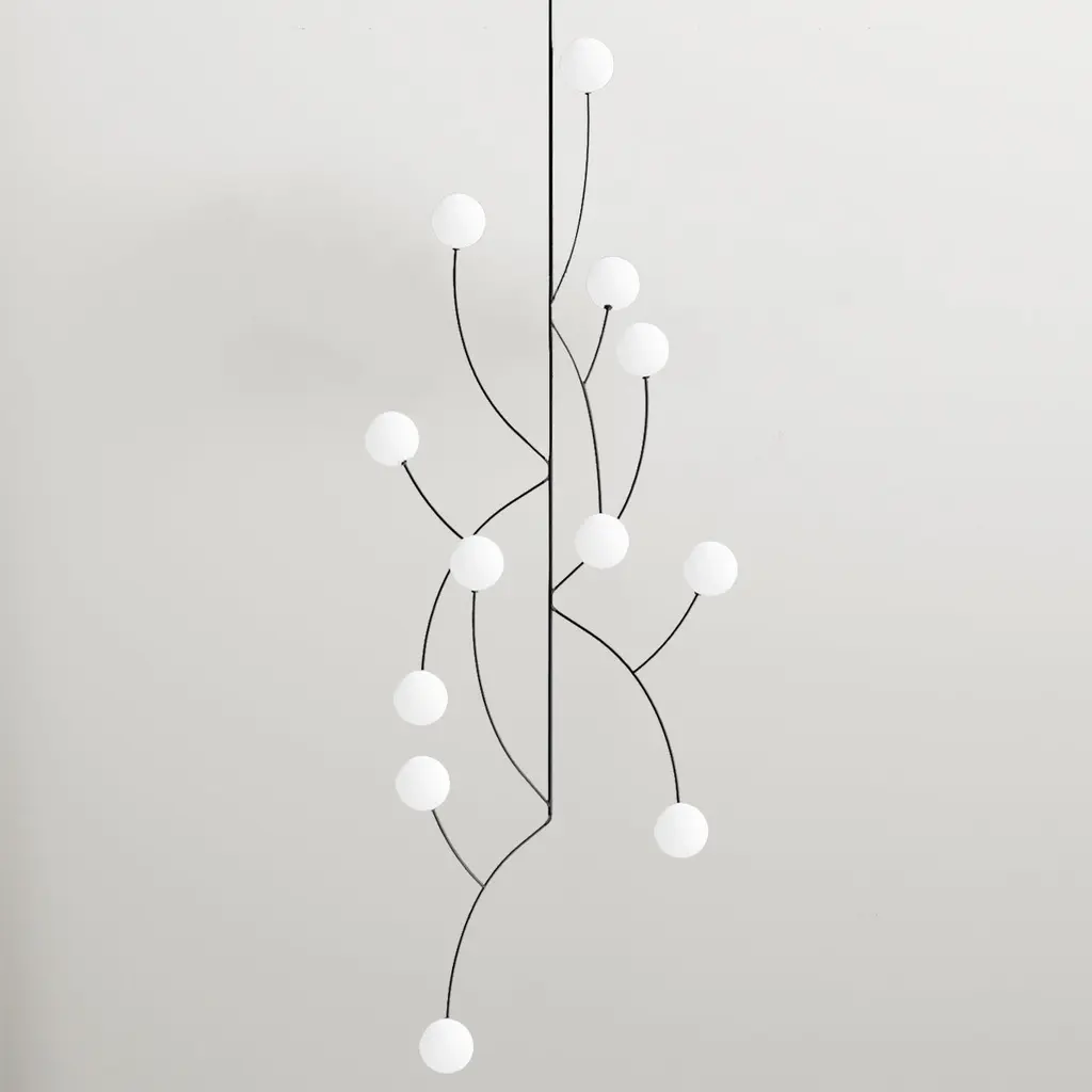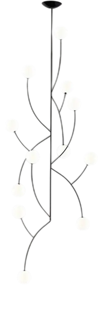 Zustrich - a masterpiece of modern designer lighting where each architectural pendant light becomes a floating constellation in your space. This luxury chandelier transforms any interior with its sculptural composition of illuminated spheres that seem to dance through the air, creating an artistic lighting installation that captivates and inspires. the contemporary lighting design seamlessly merges minimalist aesthetics with statement lighting artistry. Each custom light fixture features gracefully intertwined steel rods supporting delicate frosted glass orbs, providing perfect ambient illumination. As a premium bespoke lighting solution, this modern chandelier creates an enchanting atmosphere in high-ceiling spaces, making it ideal for luxury residential lighting and upscale commercial interiors. whether suspended above a modern dining table or gracing a hotel lobby, the decorative chandelier becomes a focal point of sophisticated interior design. The artistic lighting fixture harmoniously combines form and function, making it perfect for both residential lighting projects and commercial lighting installations. technical specifications: medium pendant: 1420 x 800 mm (52 x 31.4 inch) premium materials: steel rods, frosted glass, textile cable light source: g9, 110-220v european plug (up to 250v).