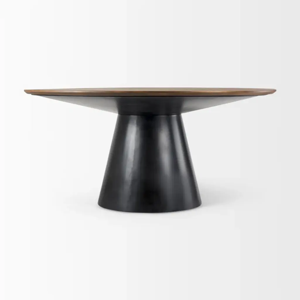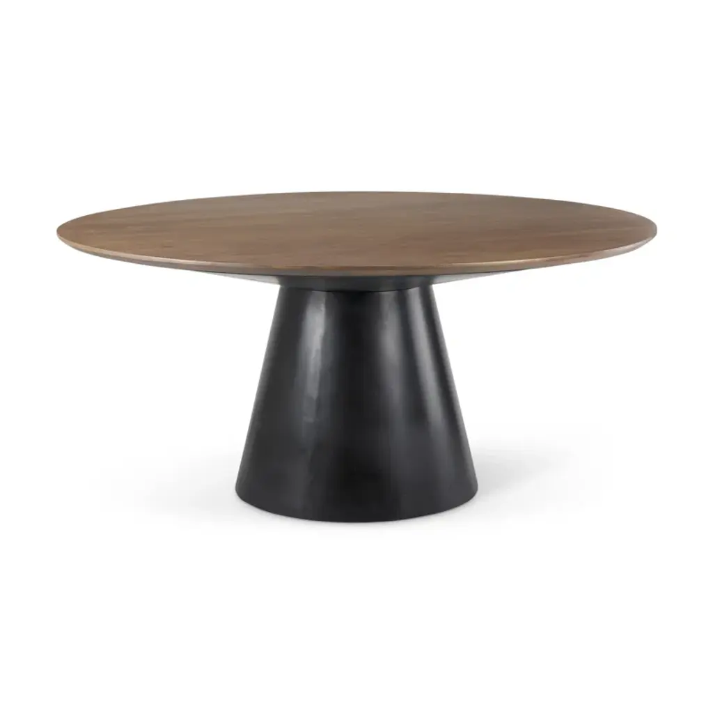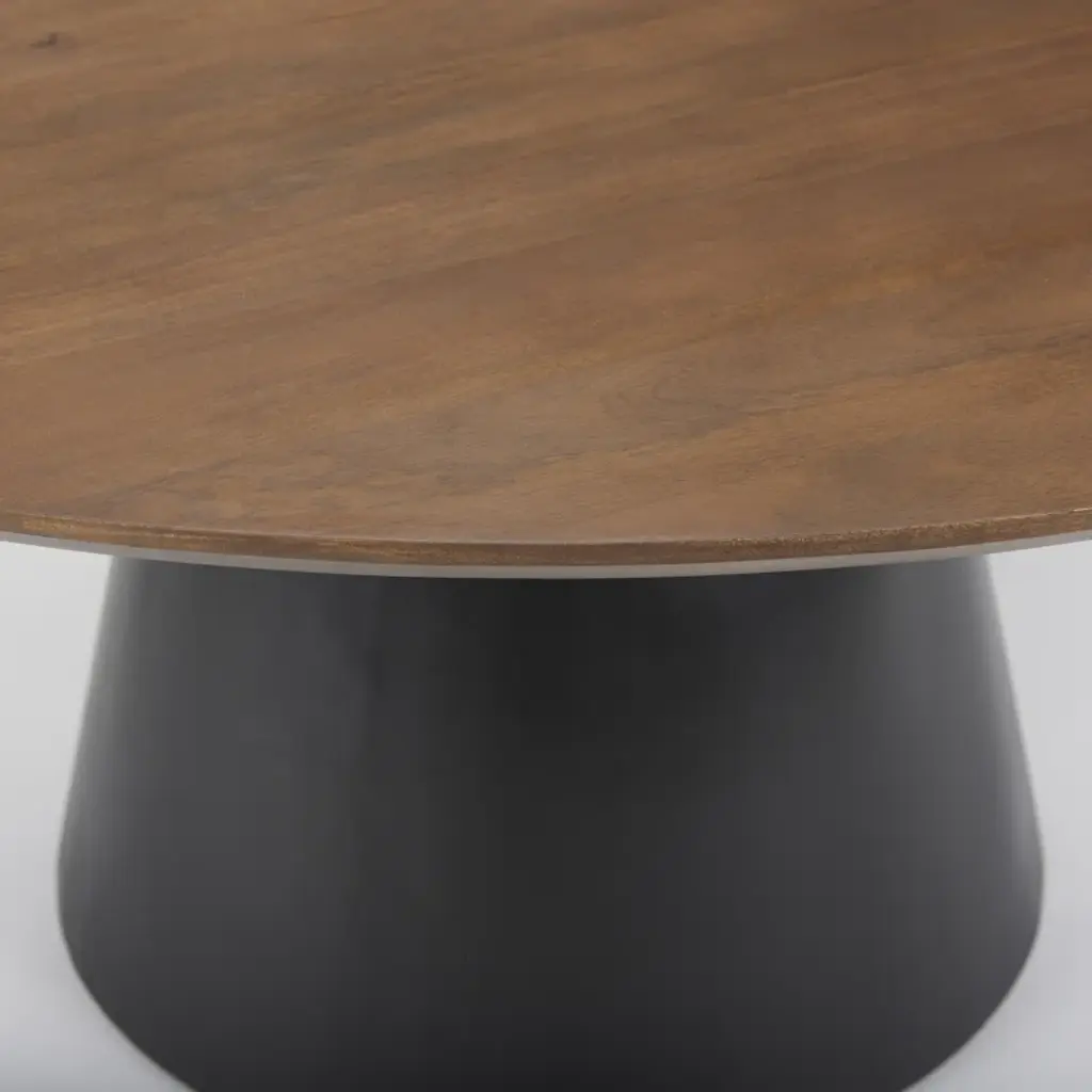 Fall in love with the beautiful chunkiness of the Mitchell Dining Table. This rotund, contemporary table offers a blend of solid mango wood and iron. The sleek, medium brown wooden top has been expertly finished to show off its textured grain, whilst the conical pedestal base comes in a complementary and contrasting black iron finish – so very stylish. This dining table pairs perfectly with the Mitchell Coffee Table and Side Table.