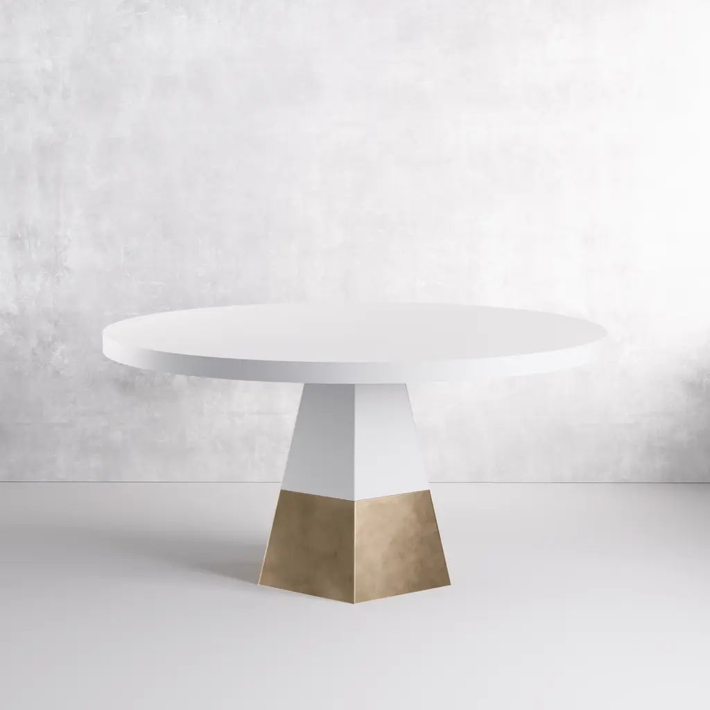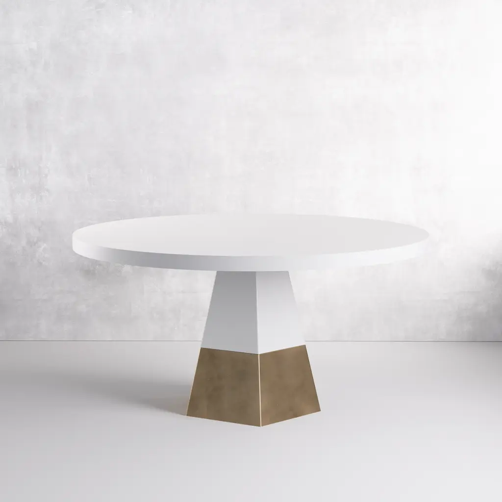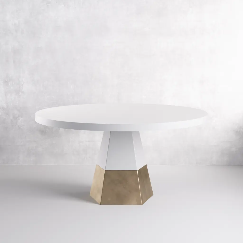 The matte top of our Modena dining table is contrasted by the base with a nickel-plated stainless steel bottom. The juxtaposition between the round top and the hexagonal base is visually dynamic. This is a wholly contemporary piece of furniture and it is ideal for a formal dining room. Discover the unmatched quality of our modern Modena dining table. Dimensions: 59.0''W x 59.0''D x 29.9''H Tear Sheet