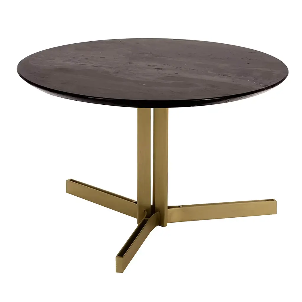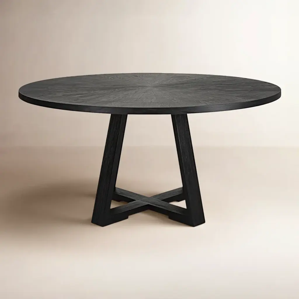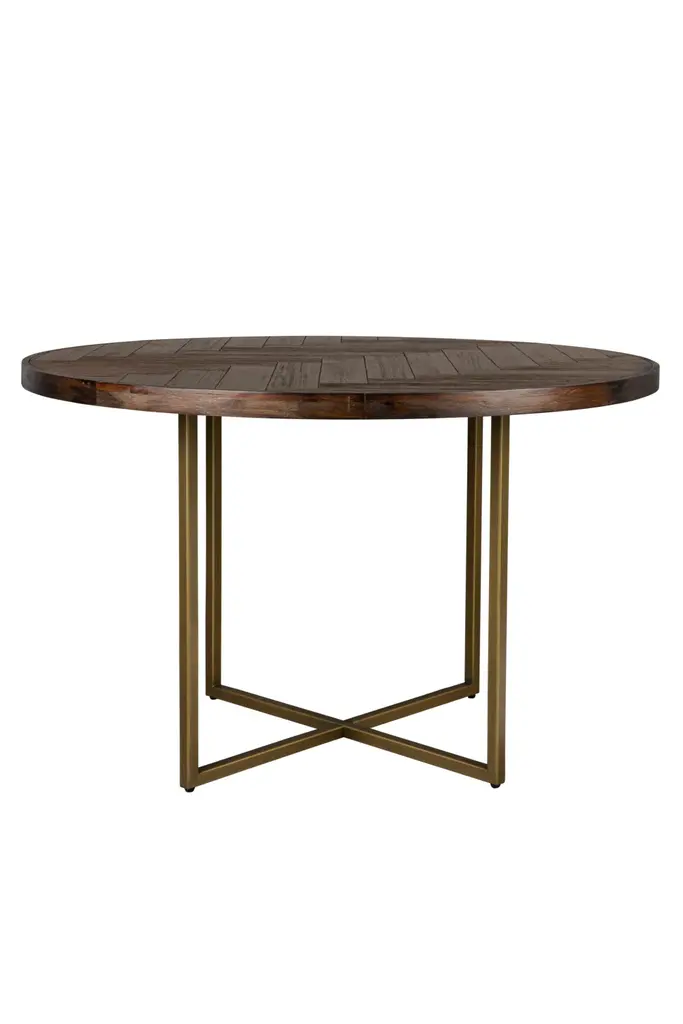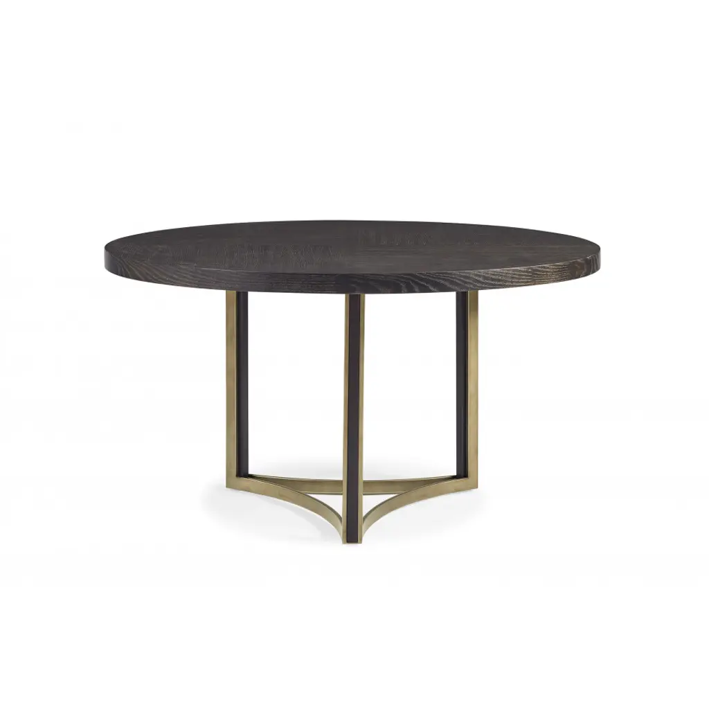 With a style-forward look you'll love for years to come, this 56-inch round dining table redefines effortless elegance. It features a wood top finished in cerused oak supported by a distinctive base of concave curves finished in Bronze Metallic Paint. Leg inserts in Black Stained Ash add another layer of luxurious contrast to its geometric-inspired base. From morning coffee to hosting friends, this captivating table is suited for all. FEATURES: Top finished in Cerused Oak. Base finished in Bronze Gold Metal. Leg inserts in Black Stained Ash.
