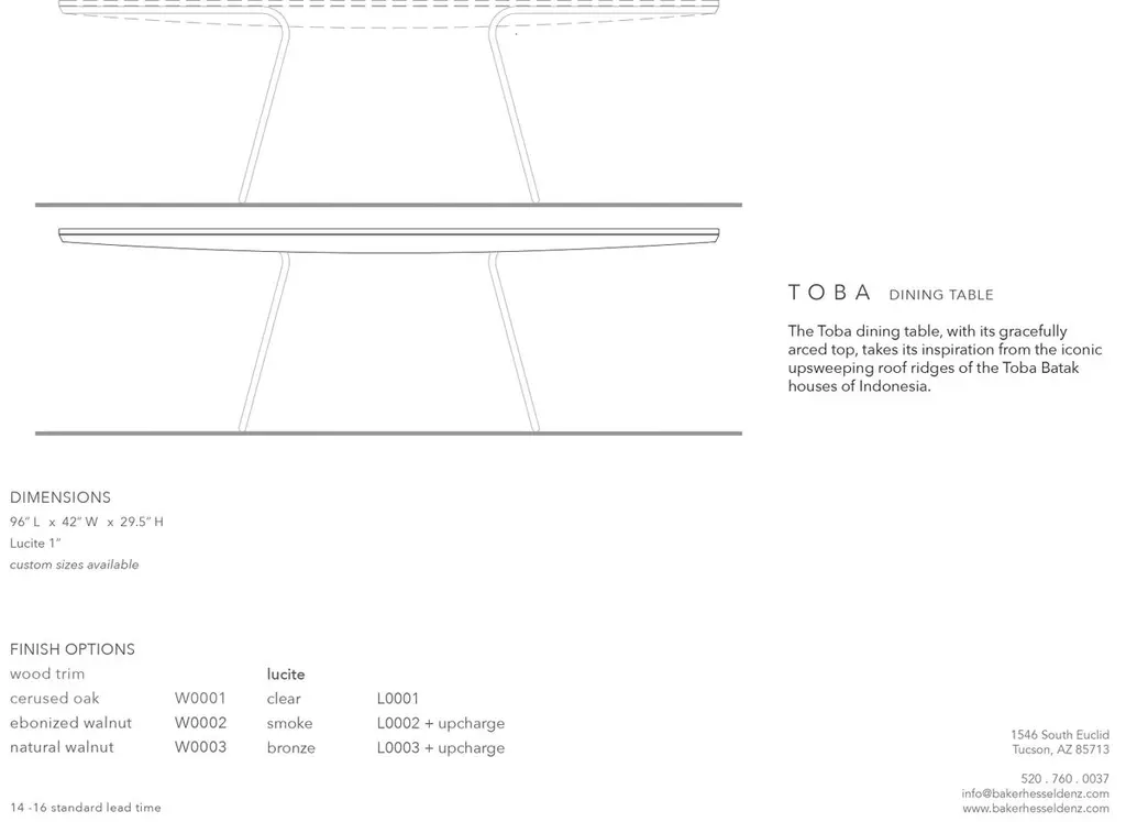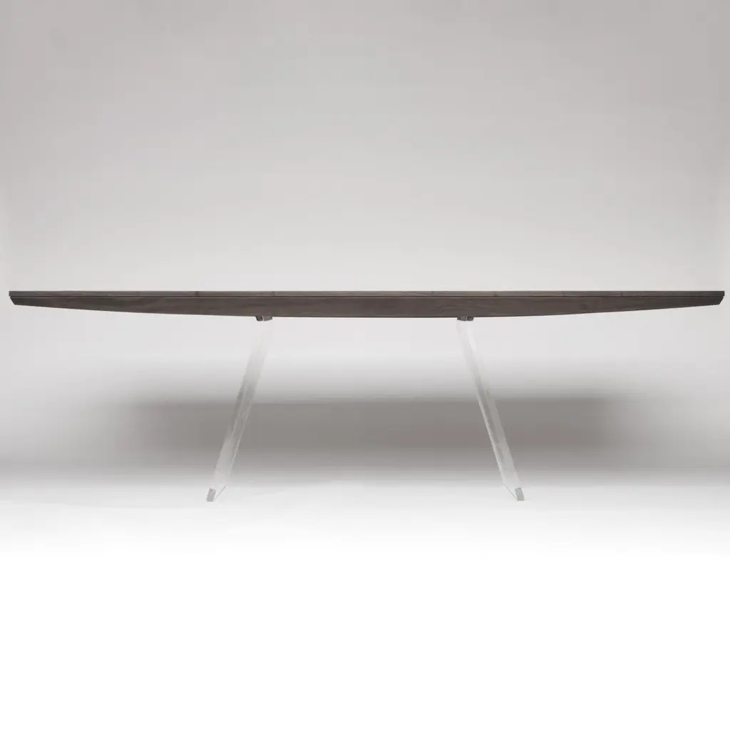 The Toba dining table, with its gracefully arced top, takes its inspiration from the iconic upsweeping roof ridges of the Toba Batak houses of Indonesia. The table top, constructed in walnut with an ebonized finish, sits a top a curved clear Lucite base giving the illusion that the top is floating.Pictured in ebonized walnut top with a clear 1" Lucite base.