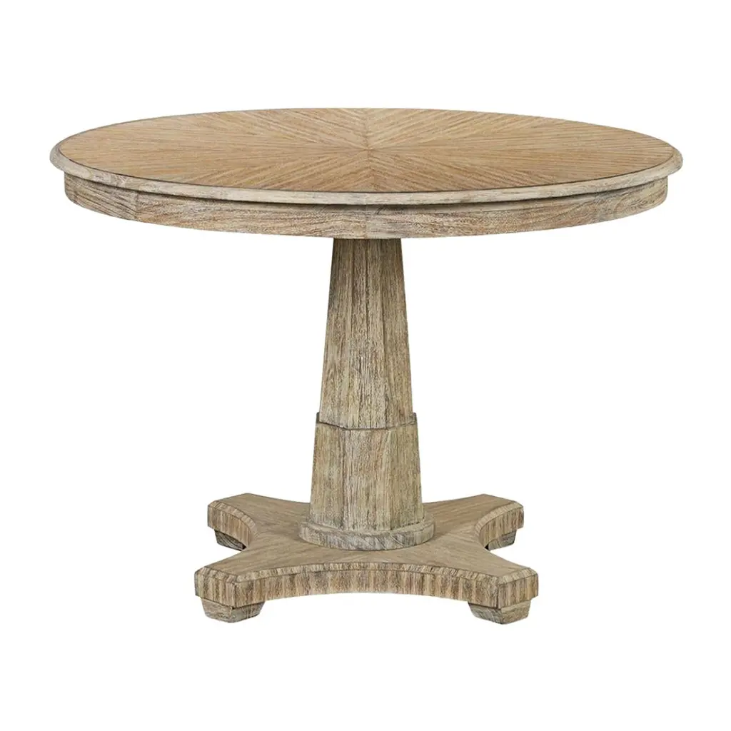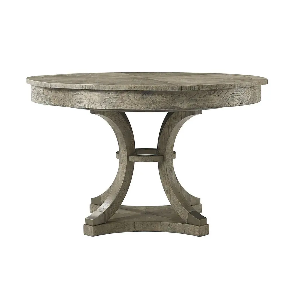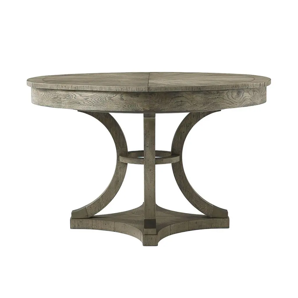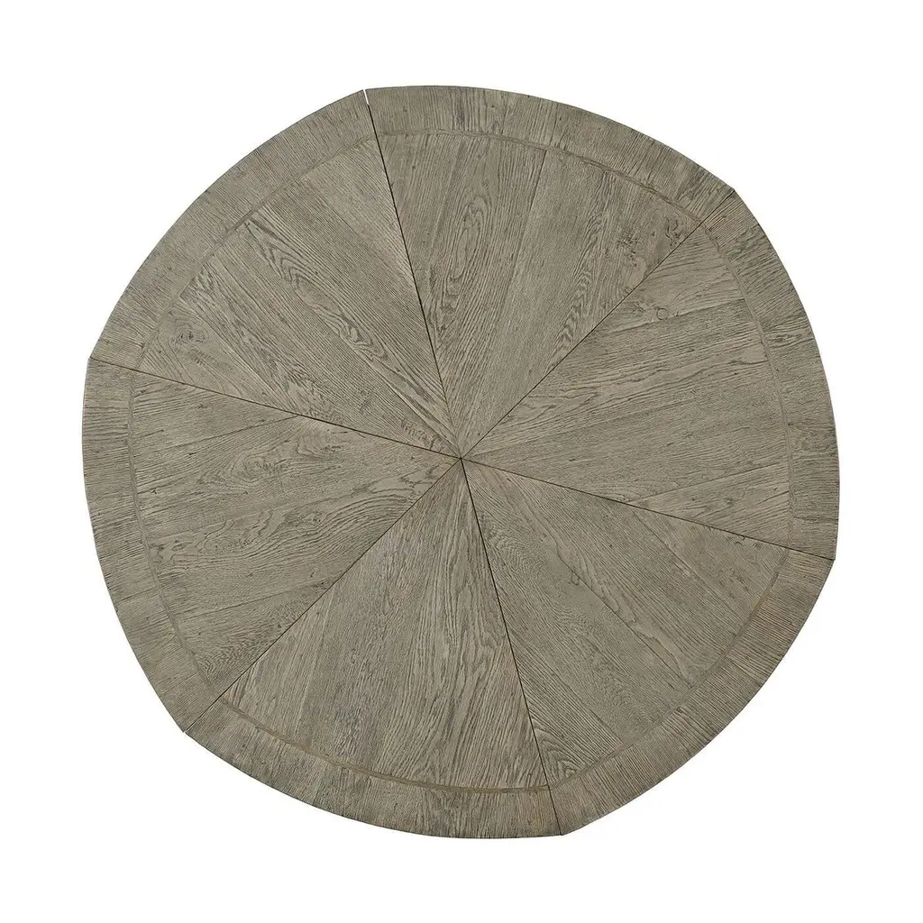 Modern greyed oak parquetry and walnut inlaid top round self-storing extension dining table with six pull-out top sections opening to reveal 6 fold-out leaves, above inswept solid oak legs with a central collar and 'Vintage' metal cast cappings.Open Dimensions: 64" W x 64" D x 30" HClosed: 48" W x 48" D x 30" H.