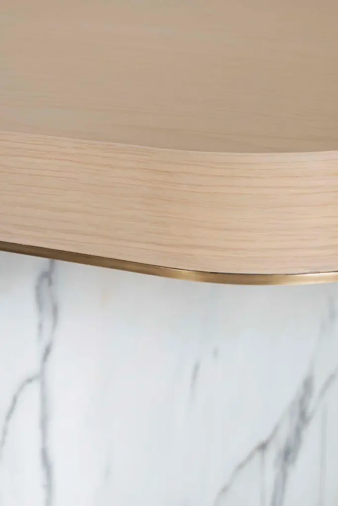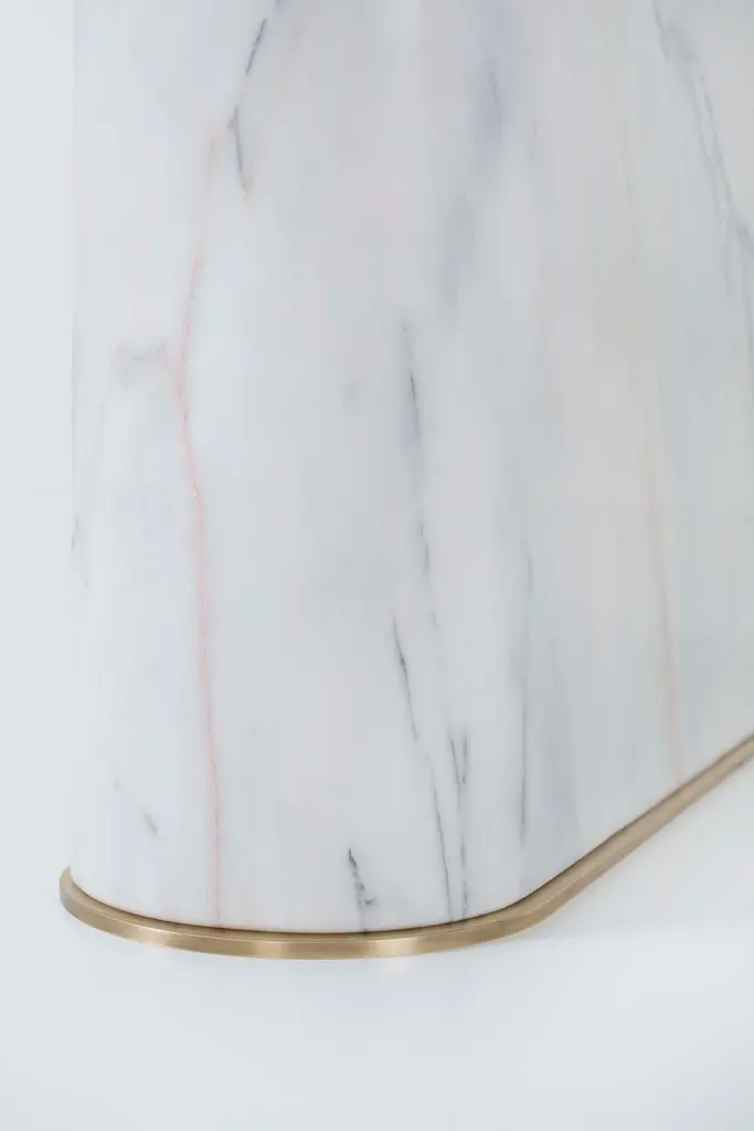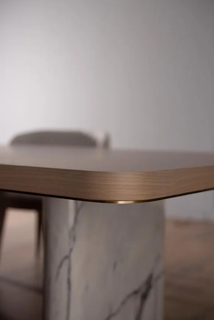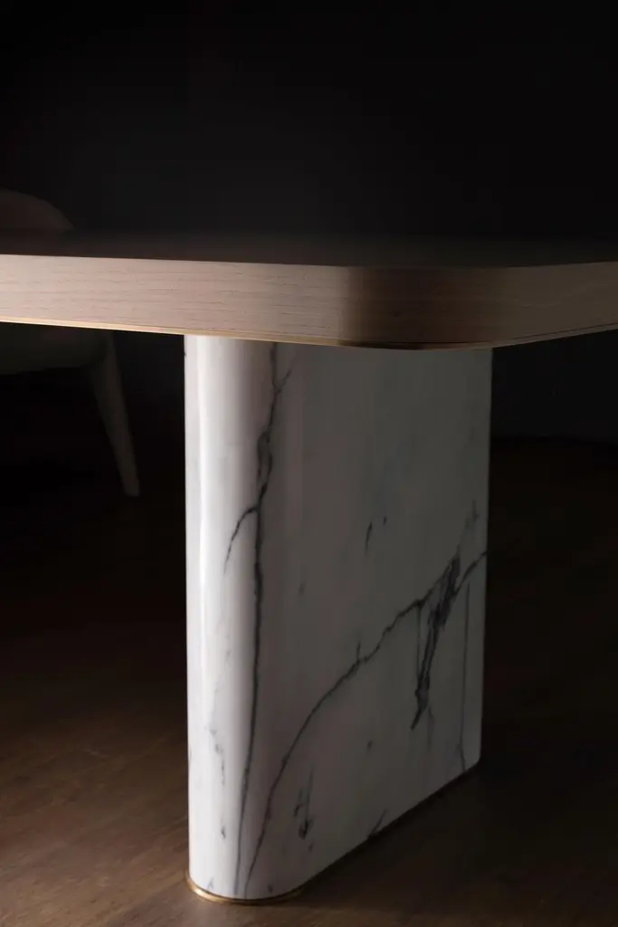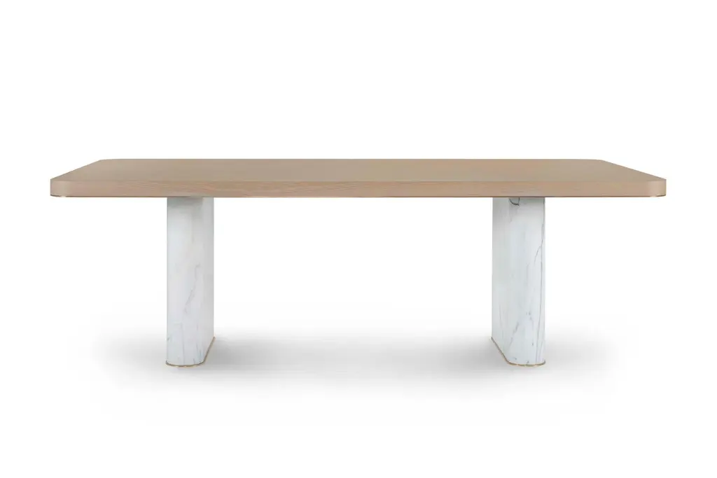 Fall Dining Table, Contemporary Collection, Handcrafted in Portugal - Europe by Greenapple.A modern allure emerges with Fall dining table, enhancing any dining space by taking the exceptional craftmanship and design to a new level.The brownish-grey stained American oak veneer tabletop sits perfectly on the robust exotic legs in Calacatta Bianco marble. The oxidized brass details highlight the beautiful harmony between luxury design and raw beauty.Fall 8-Seat Dining Table Material CodesWD149 American oak; open-pore brownish-grey stained; matt finishME007 Oxidised brass; high-gloss finishST008 Calacatta Bianco marble; polishedHandcrafted in Portugal - Europe by GreenappleUnique by design, Crafted by peopleFounded in 2005 by Sérgio Rebola and Rute Martins, Greenapple designs and produces in-house luxury furniture for exclusive customers worldwide.Our own in-house production facility allows us to be obsessed with detail, and gives us the freedom to dedicate ourselves to the most demanding tailor-made and customised work. As Rute designs all the unique pieces, Sérgio assures the high-quality standards through the whole process - from design to production; from production to your home. Fine craftsmanship, whether perfected by experienced hands or state-of-the-art machinery is quintessential in delivering top quality experiences.