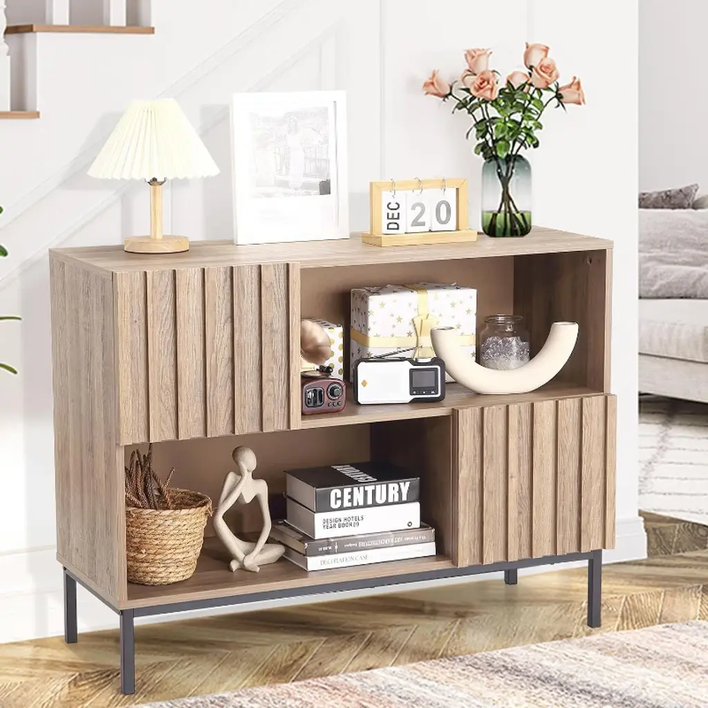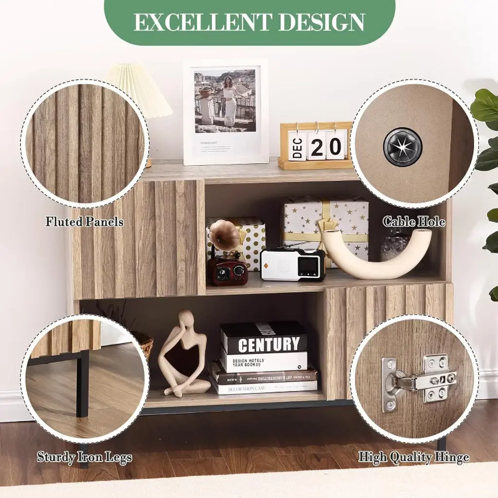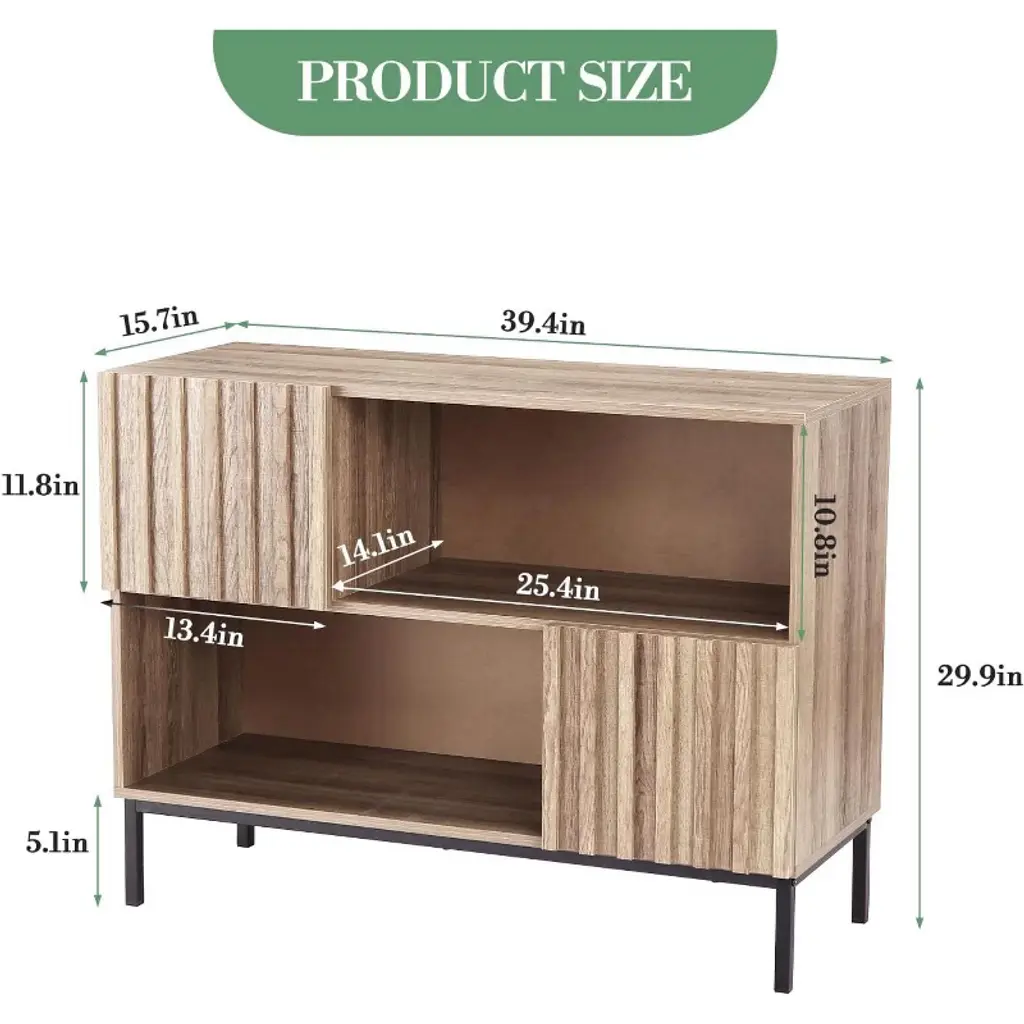 Stylish and Functional Design: Elevate your space with the stylish wave stripe semi-open side cabinet, featuring a chic fluted panel design and thick wood doors. The accent cabinet blends style and functionality, making it a perfect addition to any room Versatile Storage Solutions: Enjoy the convenience of four independent storage spaces, designed for easy classification and organization. This entryway table is ideal for keeping your essentials tidy, whether in the living room, hallway, or dining area Multi-Functional Media Console: The coffee bar cabinet doubles as a TV stand, offering ample space for your television, gaming consoles, media devices, and decorative items, making it a stylish entertainment center for movie nights Durable and Sturdy Construction: Made with high-quality hinges and sturdy iron legs, the sideboard buffet cabinet offers excellent stability and longevity. Its well-built design ensures it stands up to daily use while maintaining its elegance over time Smart Cable Management: Say goodbye to tangled cords! The built-in cable hole allows for easy and neat management of wires from electronic devices, keeping your space clutter-free and organized. Perfect for modern living rooms or home offices