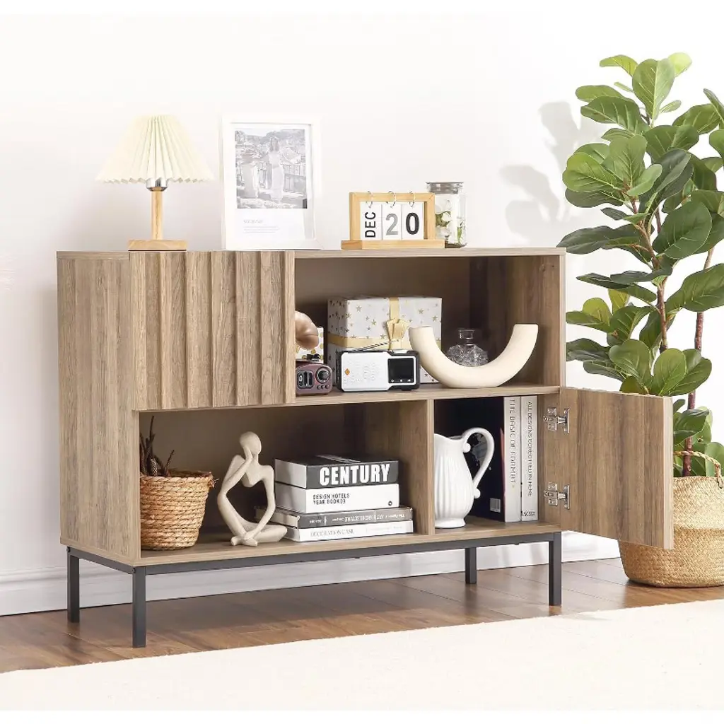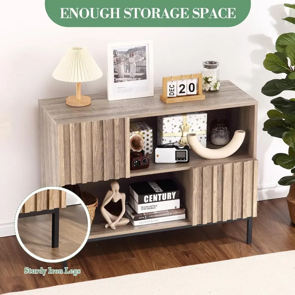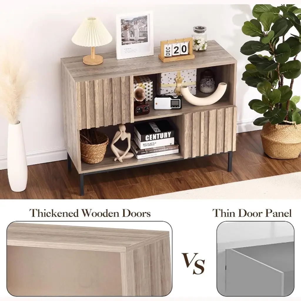 Stylish and Functional Design: Elevate your space with the stylish wave stripe semi-open side cabinet, featuring a chic fluted panel design and thick wood doors. The accent cabinet blends style and functionality, making it a perfect addition to any room Versatile Storage Solutions: Enjoy the convenience of four independent storage spaces, designed for easy classification and organization. This entryway table is ideal for keeping your essentials tidy, whether in the living room, hallway, or dining area Multi-Functional Media Console: The coffee bar cabinet doubles as a TV stand, offering ample space for your television, gaming consoles, media devices, and decorative items, making it a stylish entertainment center for movie nights Durable and Sturdy Construction: Made with high-quality hinges and sturdy iron legs, the sideboard buffet cabinet offers excellent stability and longevity. Its well-built design ensures it stands up to daily use while maintaining its elegance over time Smart Cable Management: Say goodbye to tangled cords! The built-in cable hole allows for easy and neat management of wires from electronic devices, keeping your space clutter-free and organized. Perfect for modern living rooms or home offices