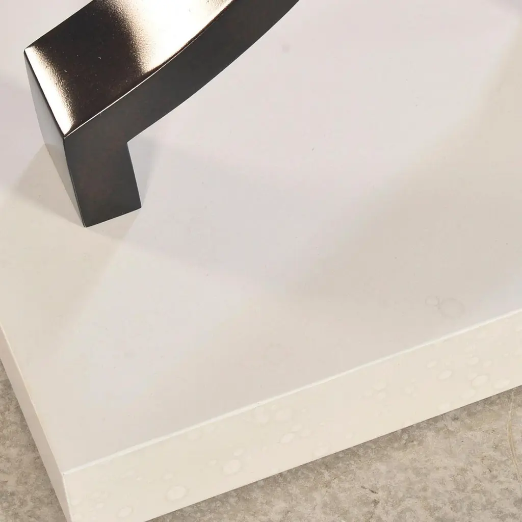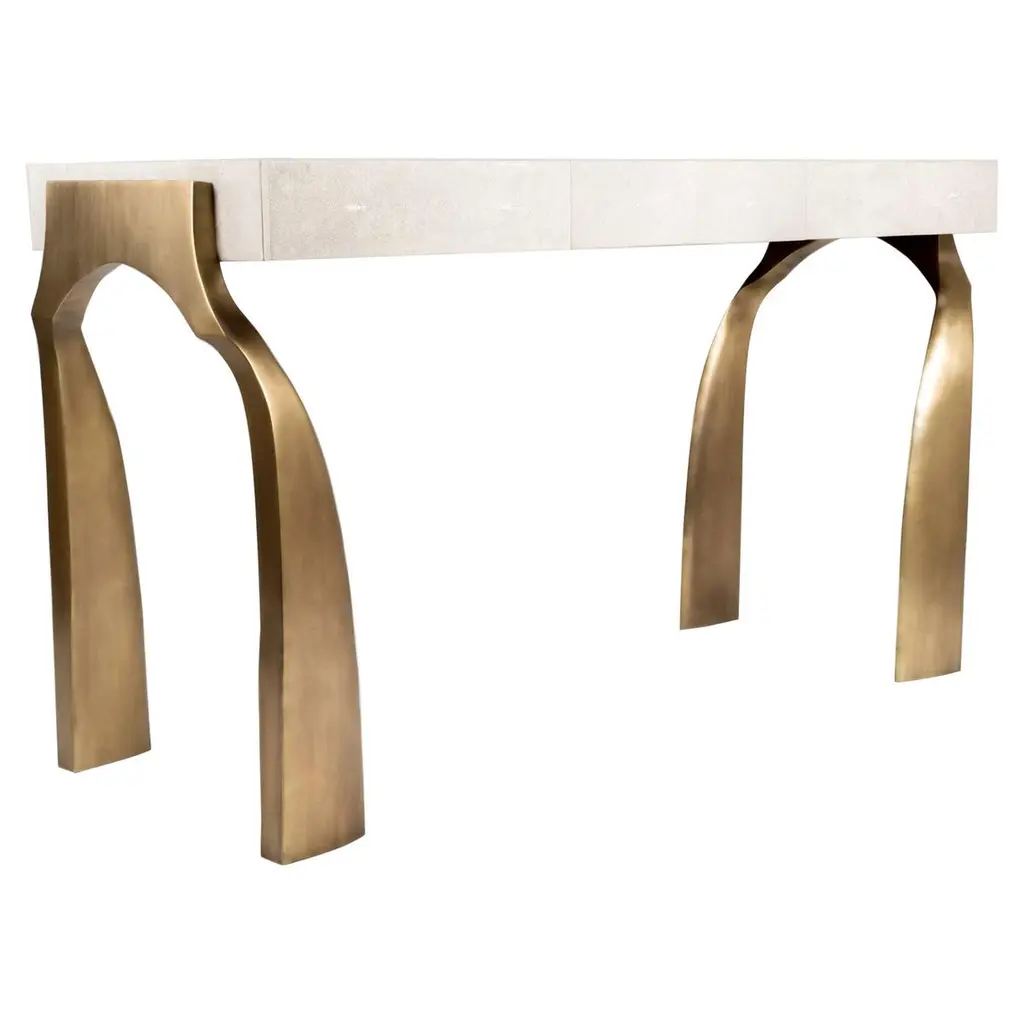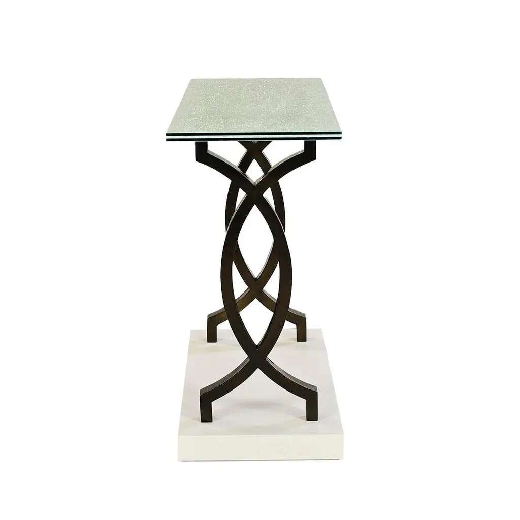 The table strikes a bold balance between contemporary elegance and sculptural sophistication. A cracked glass top brings dynamic texture and shimmer, while the hand-painted Egret finish on the wood base offers a soft, refined contrast. Anchoring the piece are two dramatic, stainless steel legs with a twisted silhouette that add architectural presence and a sense of movement.This console table is ideal for entryways, living rooms, or dining spaces where light-catching surfaces and high-design aesthetics take center stage. The fusion of crisp materials and organic texture makes it an exceptional focal point for interiors that celebrate artful luxury.Dimensions: 60" W x 16" D x 32" H
