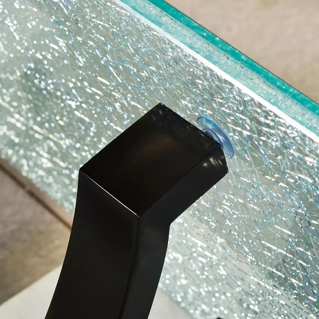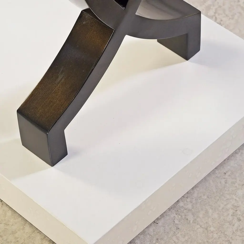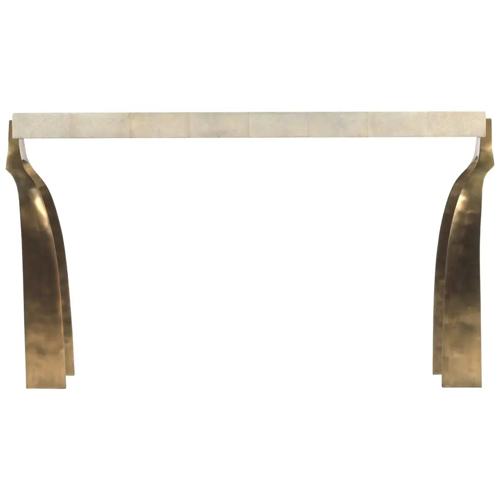 The table strikes a bold balance between contemporary elegance and sculptural sophistication. A cracked glass top brings dynamic texture and shimmer, while the hand-painted Egret finish on the wood base offers a soft, refined contrast. Anchoring the piece are two dramatic, stainless steel legs with a twisted silhouette that add architectural presence and a sense of movement. This console table is ideal for entryways, living rooms, or dining spaces where light-catching surfaces and high-design aesthetics take center stage. The fusion of crisp materials and organic texture makes it an exceptional focal point for interiors that celebrate artful luxury. Dimensions: 60" W x 16" D x 32" H