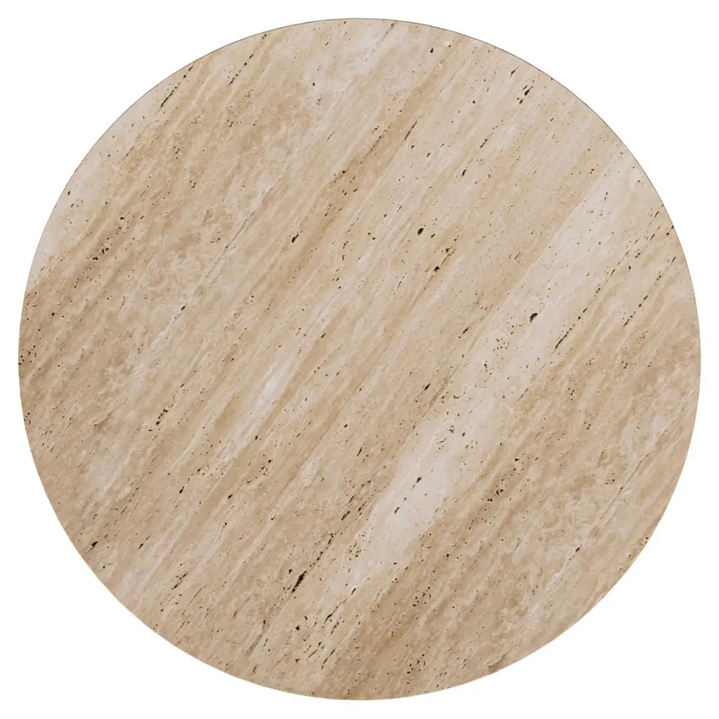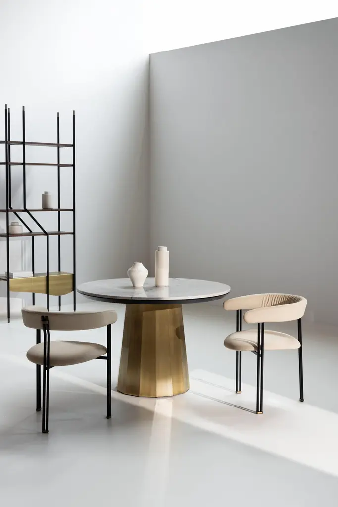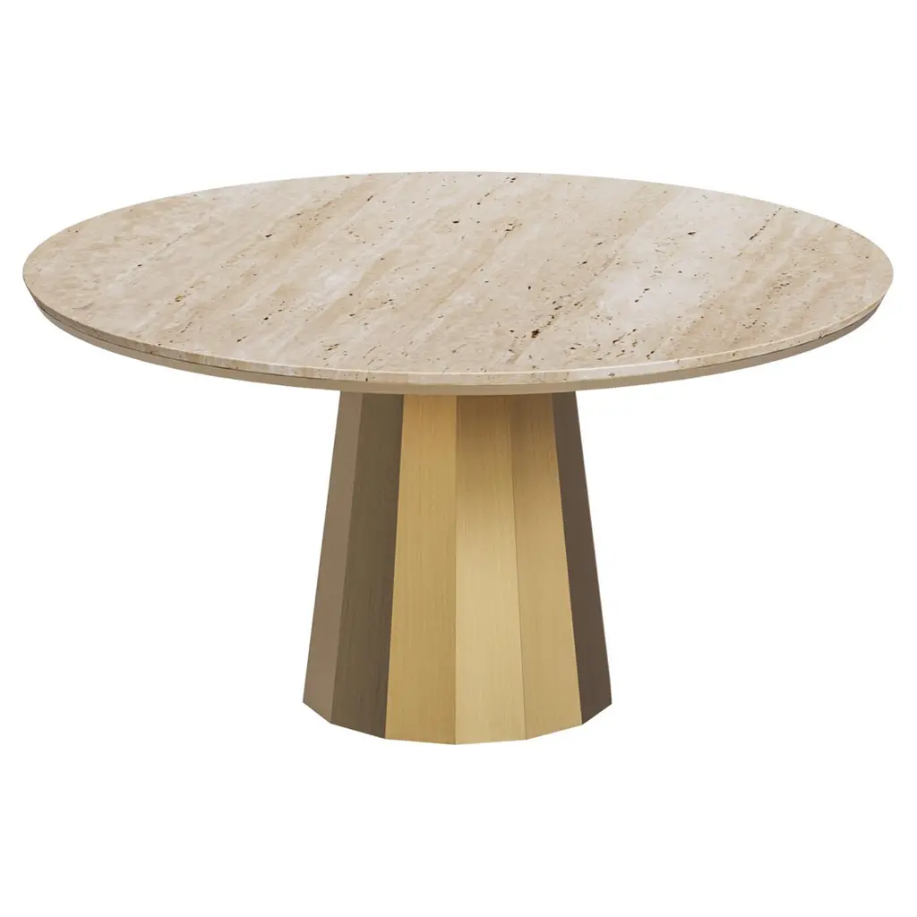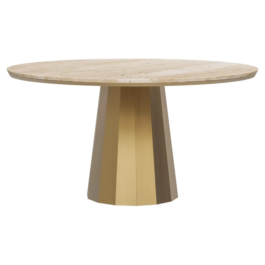 Modern Howlite Round Dining Table 4-Seats, Modern Collection, Handcrafted in Portugal - Europe by GF Modern.Howlite dining table represents the dawn of a new modern era. The Travertine stone in the table top and the faceted base in brushed and burnished antique brass, finished with a high-gloss varnish, complements the bold and eye-catching design, representing the ultimate form of sophistication.The Howlite dining table can be customized in terms of dimensions, materials and finishes.Howlite Dining Table 4-Seats Material CodesST099 Travertine Limestone, Polished, Beige, GlossME007 Brass, Brushed, Burnished, Varnished, Antique-Brass, High-GlossFI007 Lacquered, Black, SatinHandcrafted in Portugal - Europe by GreenappleUnique by design, Crafted by peopleGreenapple transforms contemporary spaces into exclusive narratives of design and craftsmanship. From custom-made furniture to bespoke interiors, each creation is a timeless work of art, shaped by master artisans who honor centuries-old techniques.Founded in 2005 by Sérgio Rebola and Rute Martins, Greenapple has earned global recognition among high-end clientele and leading design firms. While Rute designs each unique piece, Sérgio ensures uncompromising quality from design to production and from production to your home. We provide a seamless experience, offering short production lead times, worldwide delivery within 7 to 10 days, and white-glove service upon request.For U.S. clients, we can handle all customs clearance, cover duties, and offer white-glove service as well upon request.Table, Round Table
