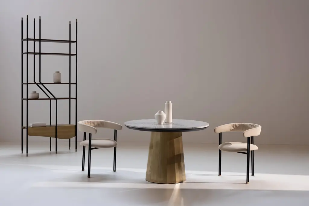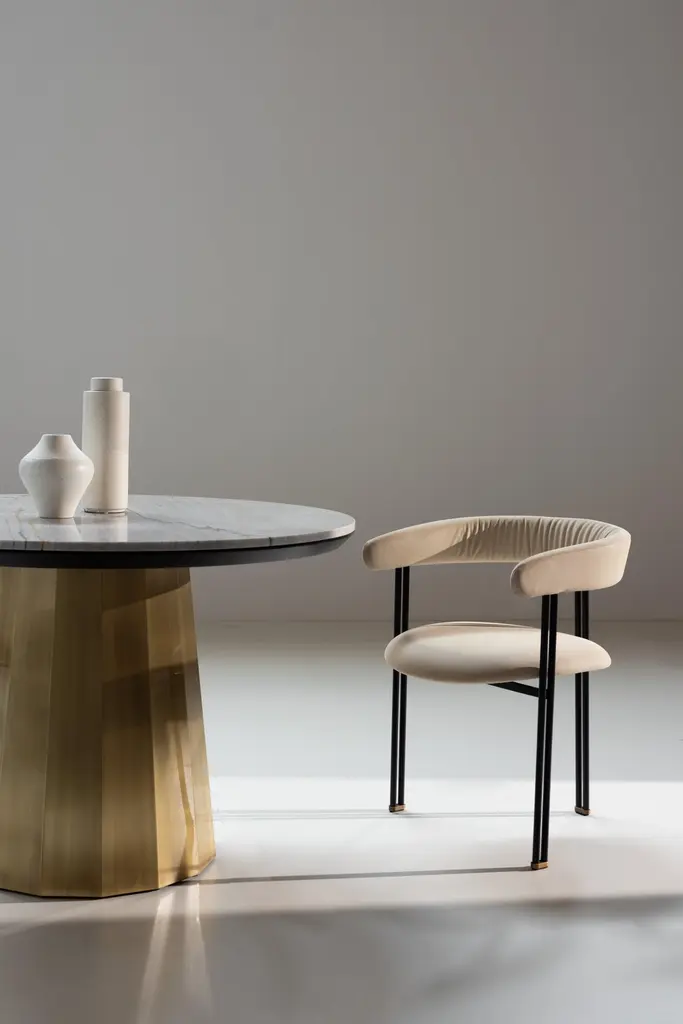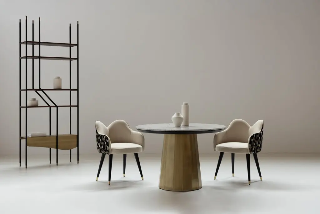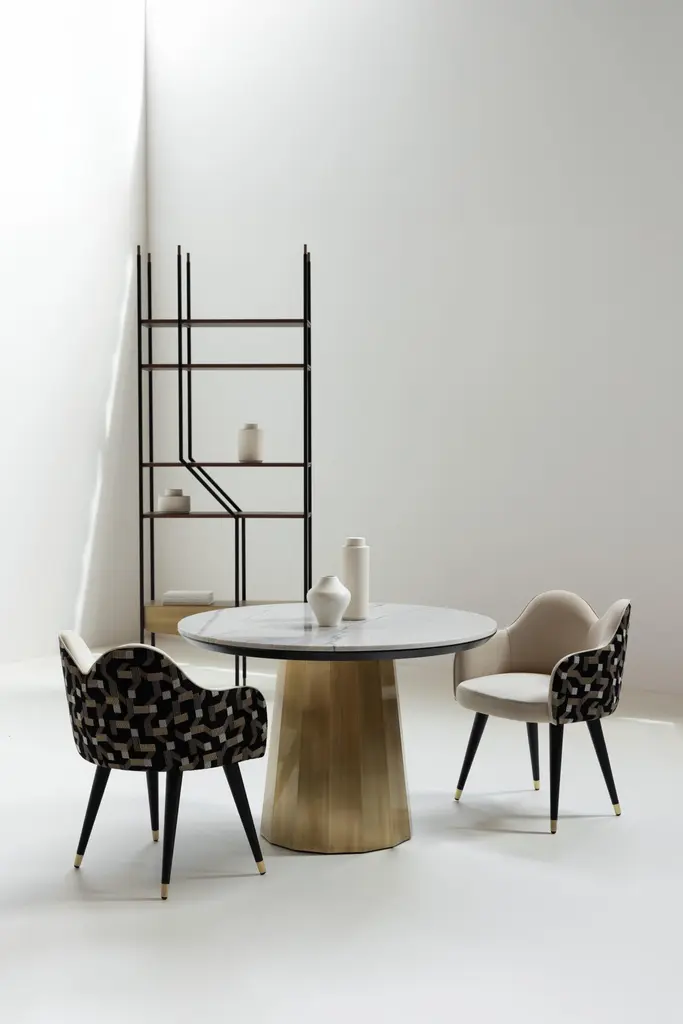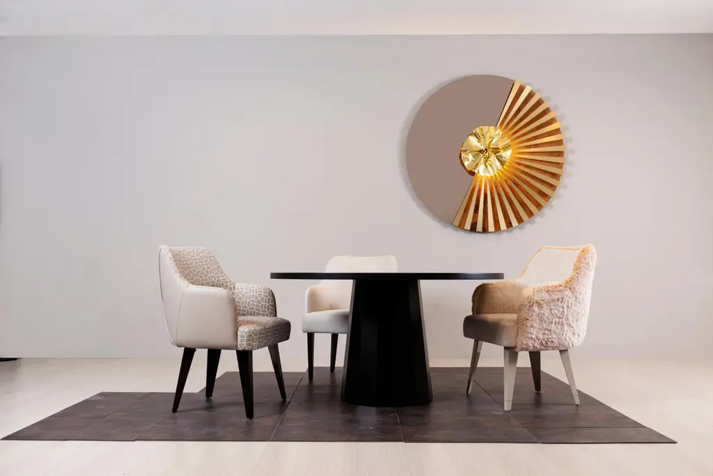Modern Howlite Round Dining Table 4-Seats, Modern Collection, Handcrafted in Portugal - Europe by GF Modern.Howlite dining table represents the dawn of a new modern era. The Travertine stone in the table top and the faceted base in brushed and burnished antique brass, finished with a high-gloss varnish, complements the bold and eye-catching design, representing the ultimate form of sophistication.The Howlite dining table can be customized in terms of dimensions, materials and finishes.Howlite Dining Table 4-Seats Material CodesST099 Travertine Limestone, Polished, Beige, GlossME007 Brass, Brushed, Burnished, Varnished, Antique-Brass, High-GlossFI007 Lacquered, Black, SatinHandcrafted in Portugal - Europe by GreenappleUnique by design, Crafted by peopleGreenapple transforms contemporary spaces into exclusive narratives of design and craftsmanship. From custom-made furniture to bespoke interiors, each creation is a timeless work of art, shaped by master artisans who honor centuries-old techniques.Founded in 2005 by Sérgio Rebola and Rute Martins, Greenapple has earned global recognition among high-end clientele and leading design firms. While Rute designs each unique piece, Sérgio ensures uncompromising quality from design to production and from production to your home. We provide a seamless experience, offering short production lead times, worldwide delivery within 7 to 10 days, and white-glove service upon request.For U.S. clients, we can handle all customs clearance, cover duties, and offer white-glove service as well upon request.Table, Round Table