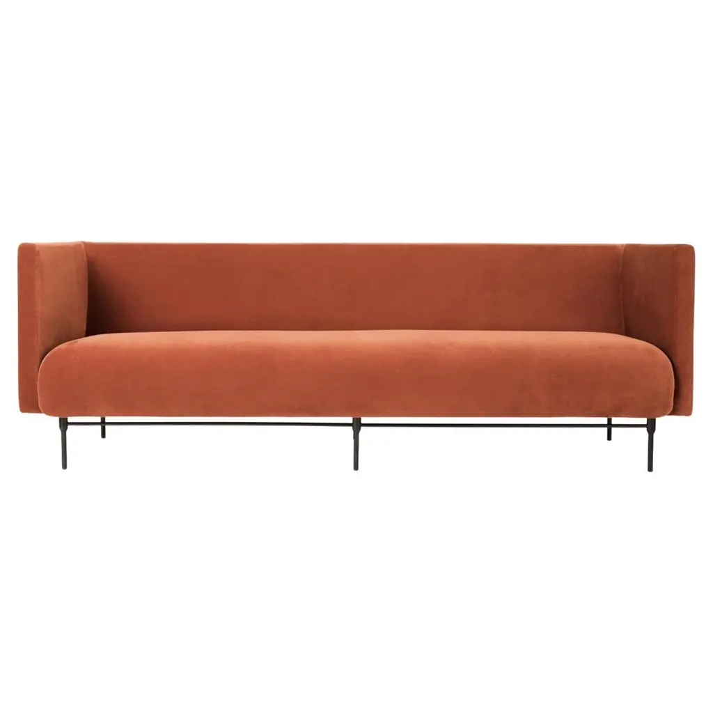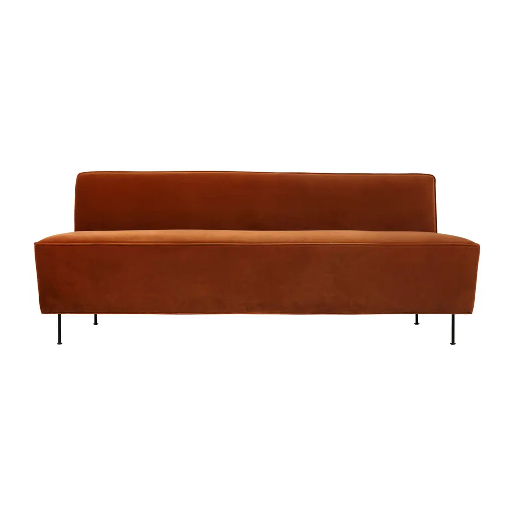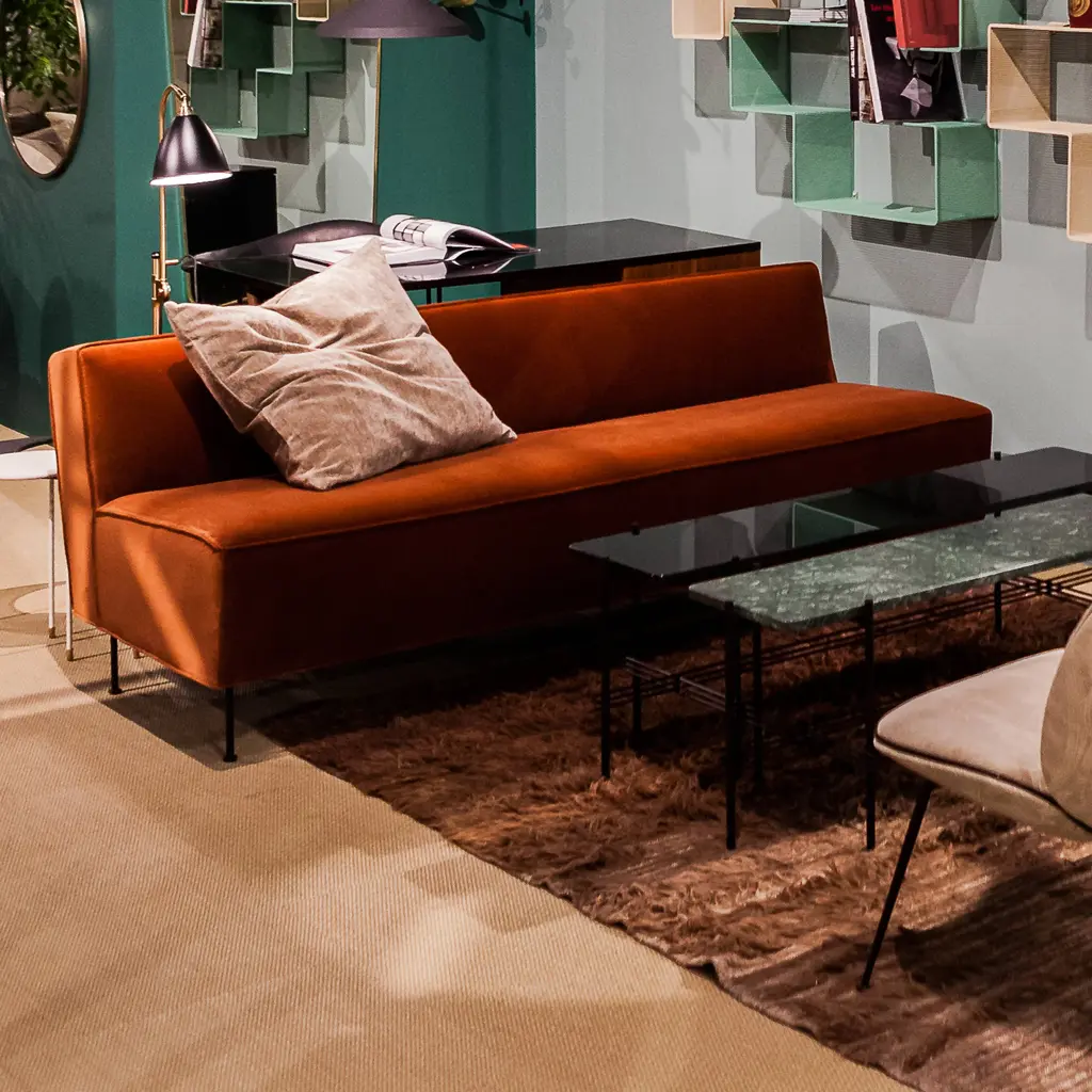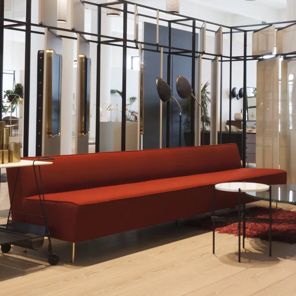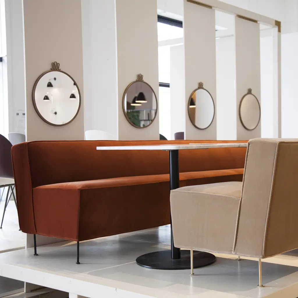 An extended sofa pitched at dining height broadens the iconic Modern Line collection. The 1949 original is rethought with a raised seat that is also less deep, to accommodate dining table placement. Considered one of Swedish pioneer Greta M. Grossman’s signature works, it’s noted for the contrast between solid upholstered form and slender metal legs which impart a floating effect. Luxurious yet understated, the seating is available in a wide range of sizes to serve in cafés and restaurants.