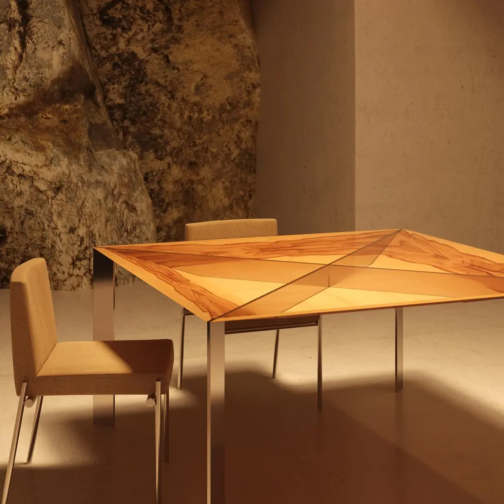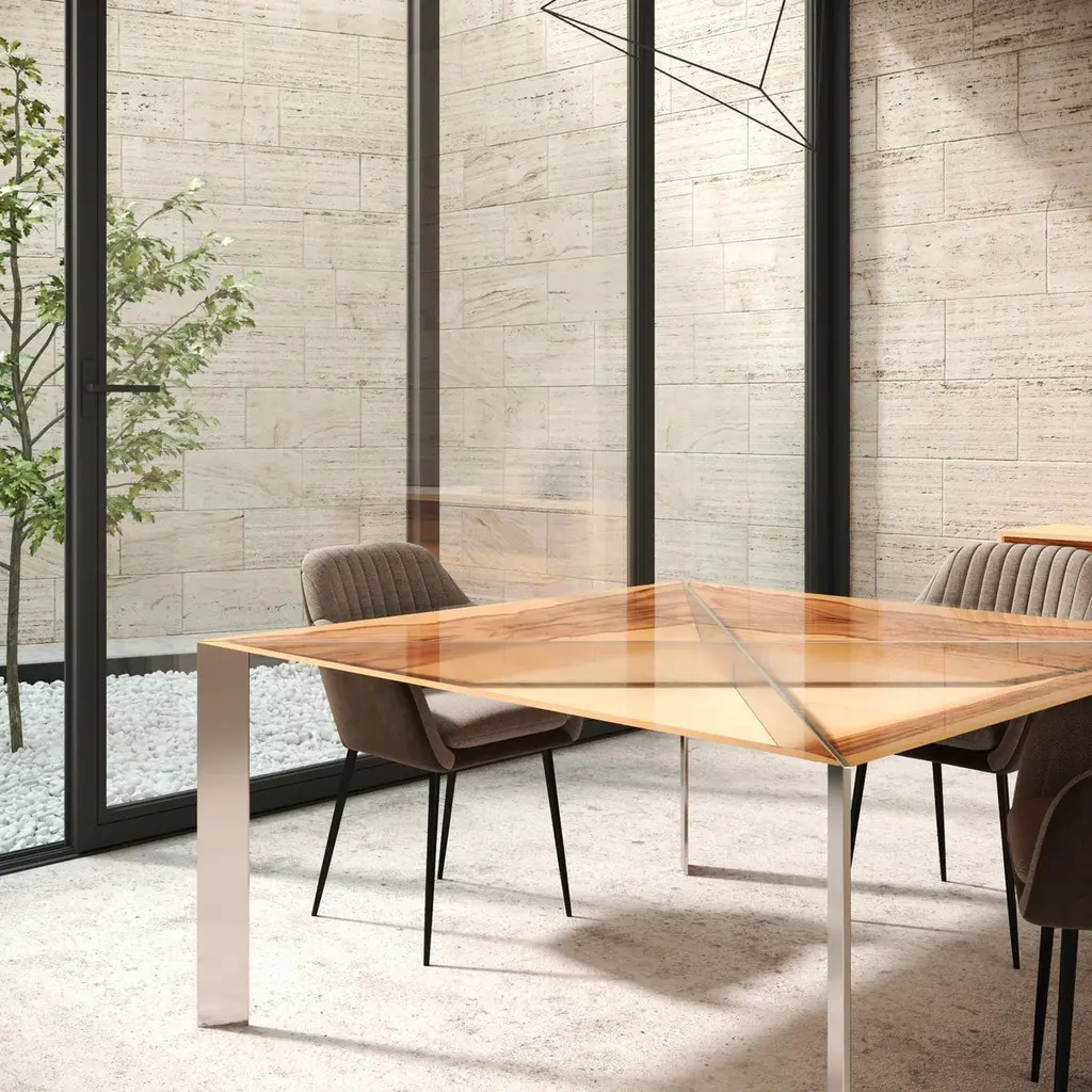 Modern Minimalist Square Dining Table In Satinwood And Brushed Stainless Steel