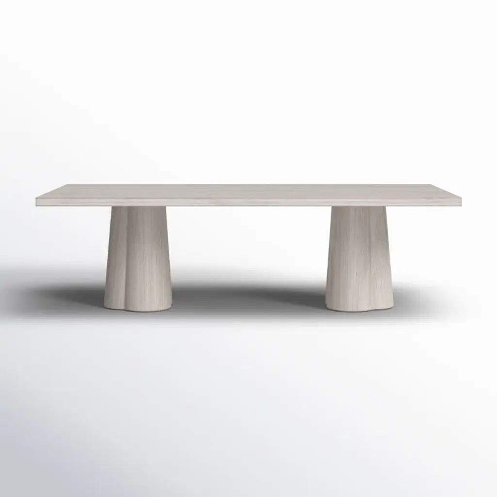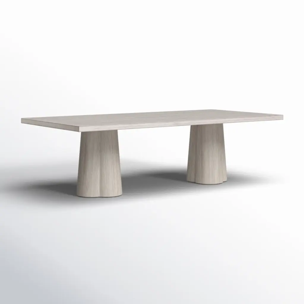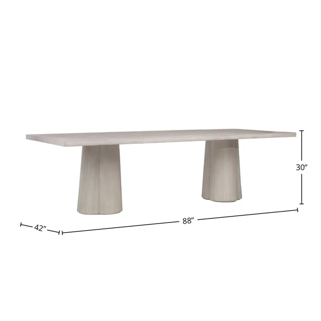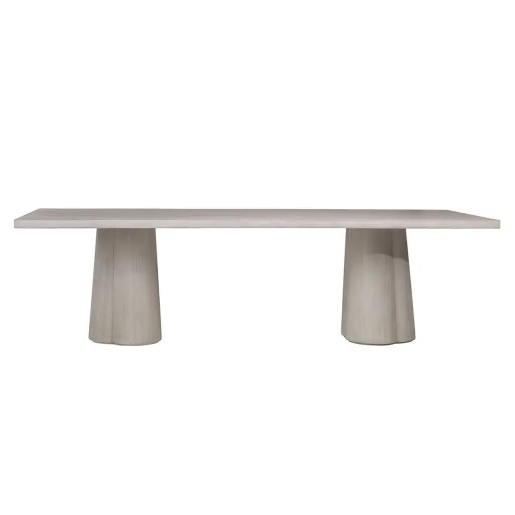 Inspired by decades of design movements with an unmistakably modern aesthetic that transcends time, the Modern Mood leg dining table is a striking, softly sophisticated profile. Featuring a rounded table apron and corners, matched veneers on the top, and metal banding accents on the legs in a warm pewter finish, it is crafted of quartered oak veneers in a diamond finish with crystal-like alabaster hues. With one 24-inch leaf, the table extends up to 110 inches long. Unbound by geographical design, Modern Mood presents itself as an evolution of design choices, spanning a variety of decades and design movements, while maintaining an unmistakably modern aesthetic that transcends time. The 90-piece collection includes a bedroom, dining room, home office, accent, and occasional items characterized by substantive forms with soft architectural details. Elevated materials and brushed metal accents in a warm pewter finish are evident throughout the collection, including metal banding and edging and marble and glass accents. Crafted with flat-cut quartered oak veneer with wire-brushed detailing. A much lighter presentation is achieved with the crystal-like alabaster and pewter hues finish, delivering a soft sophistication.