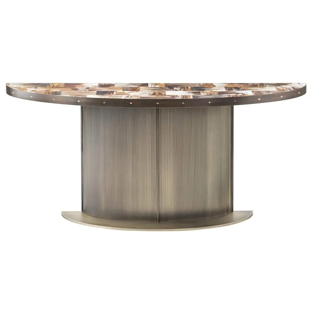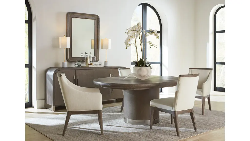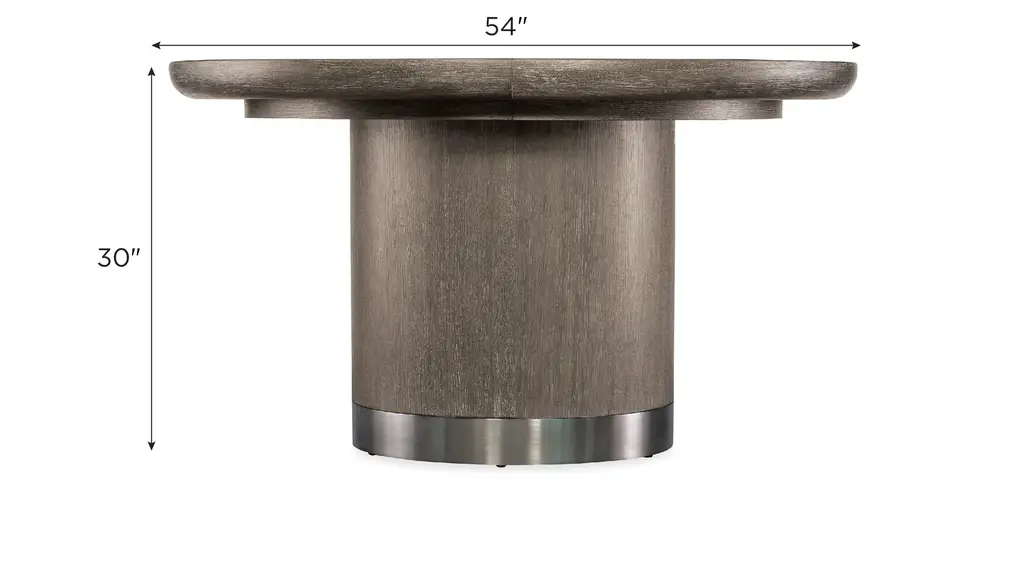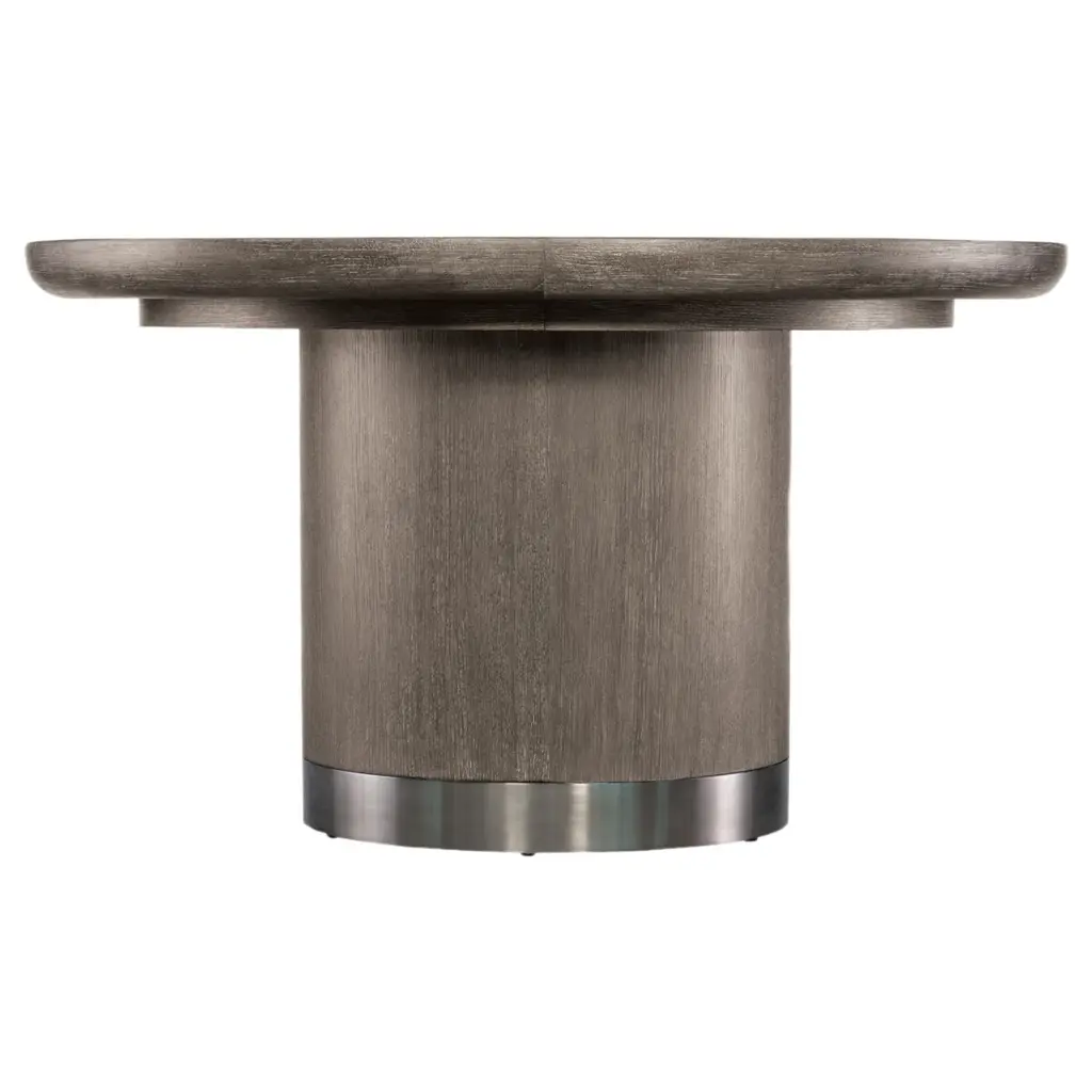 Modern Mood Round Dining Table is a statement piece with a softly sophisticated profile. Featuring metal banding accents on the base in a warm pewter finish, it is crafted of Quartered Oak Veneers with dark, earthy brown hues with notes of black. With one 18-inch leaf, the table extends up to 72 inches round.