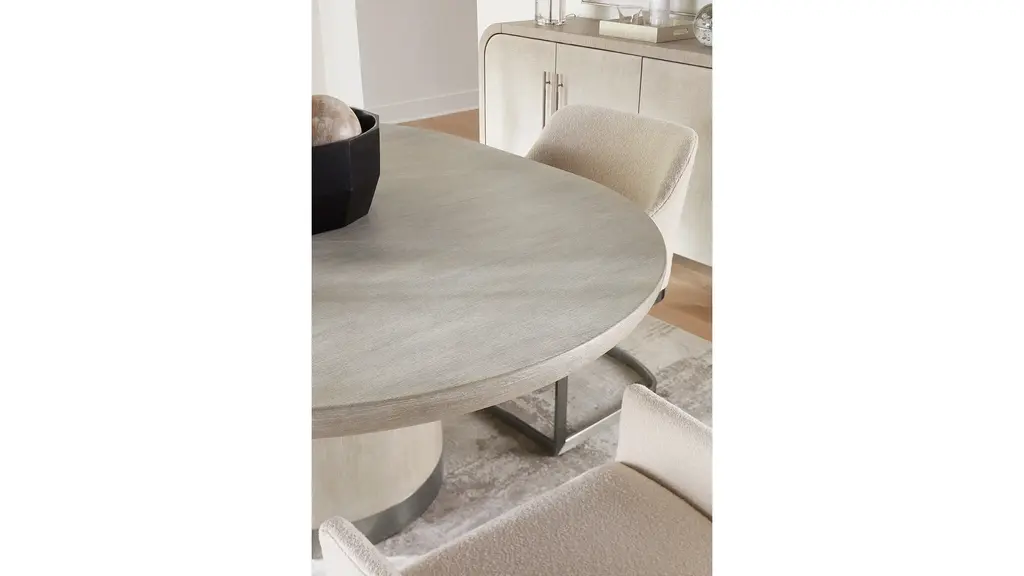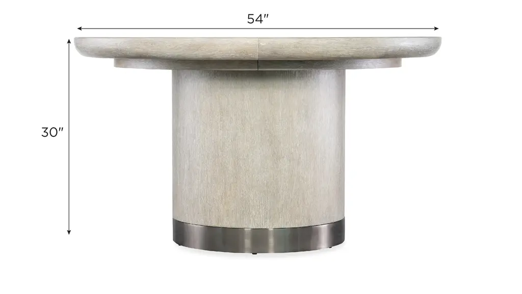 Modern Mood Round Dining Table is a statement piece with a softly sophisticated profile. Featuring metal banding accents on the base in a warm pewter finish, it is crafted of Quartered Oak Veneers in a Diamond Finish with crystal-like alabaster hues. With one 18-inch leaf, the table extends up to 72 inches round.