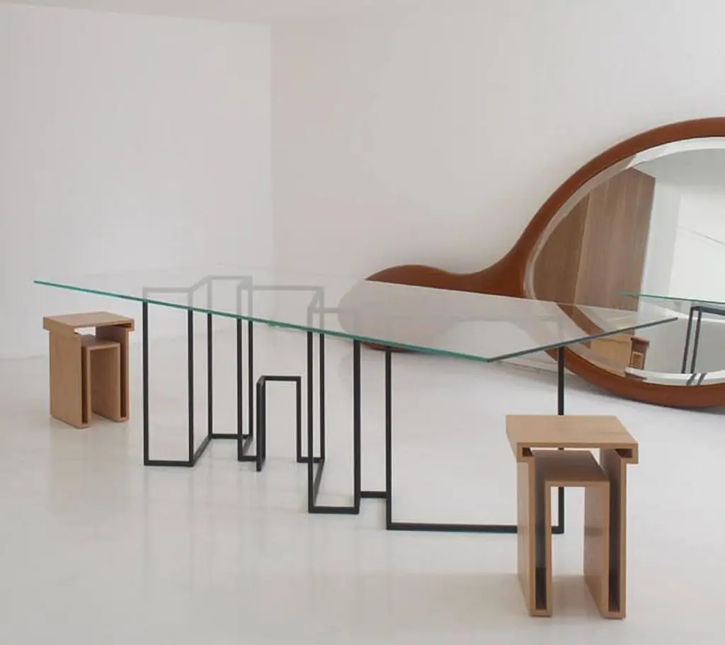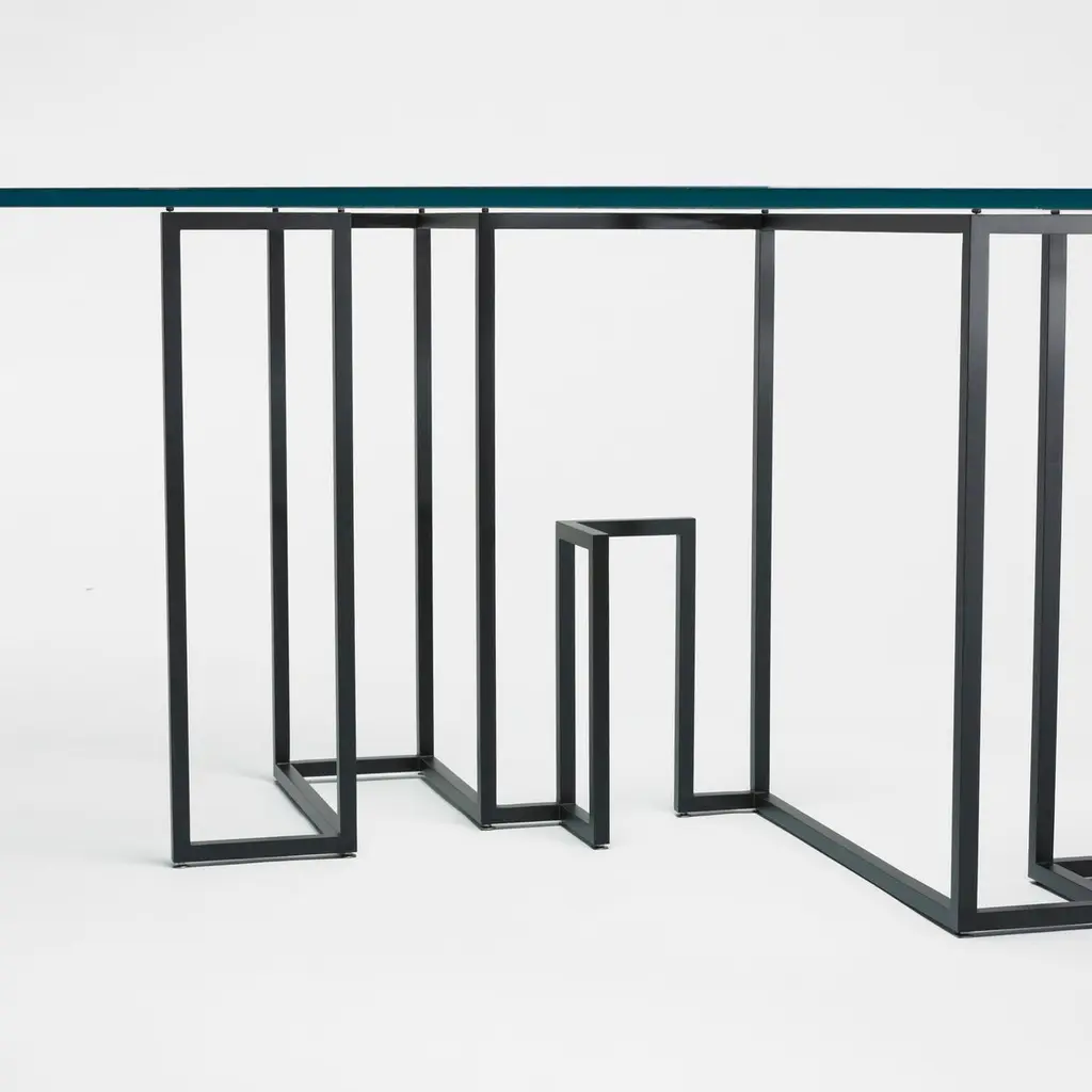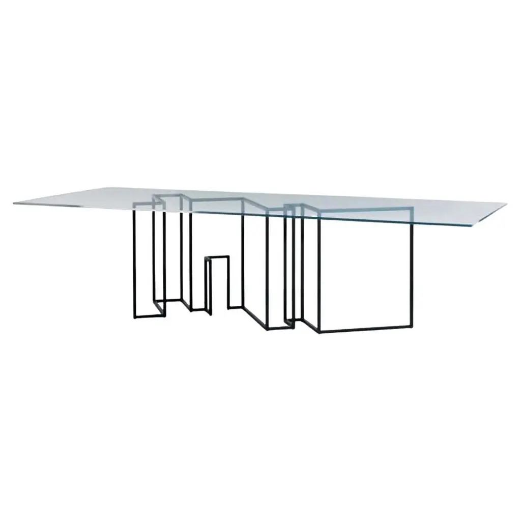 Rectangular dining table designed by Ron Gilad for Dilmos Edizioni.The table has a lacquered iron base and 22 mm thick extra light glass top with round corners. The design of the base represents the floor plan of the designer's New York apartment. The base is available in any lacquered color.Signed by the designer. Size: cm 220 x 105 x 72 H.