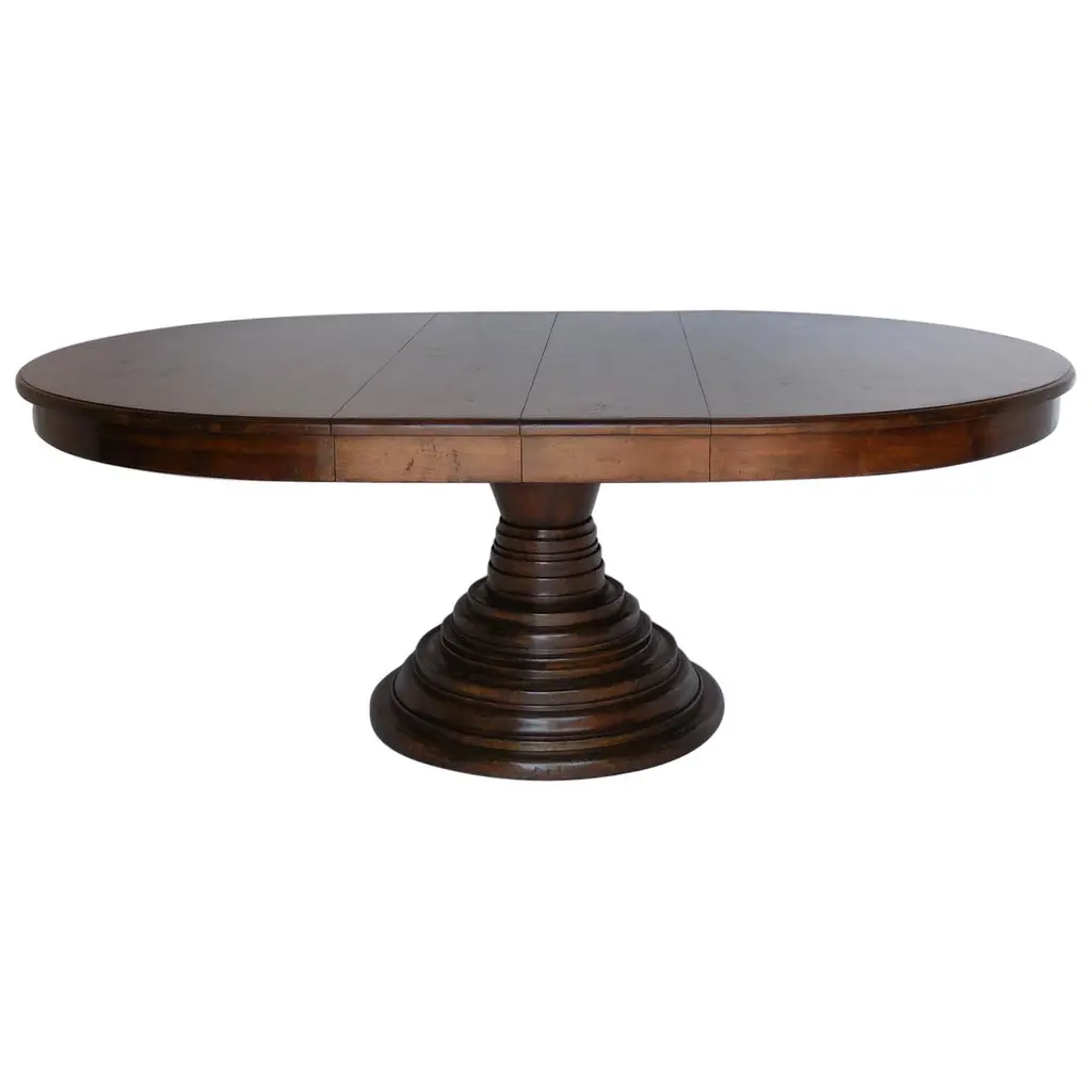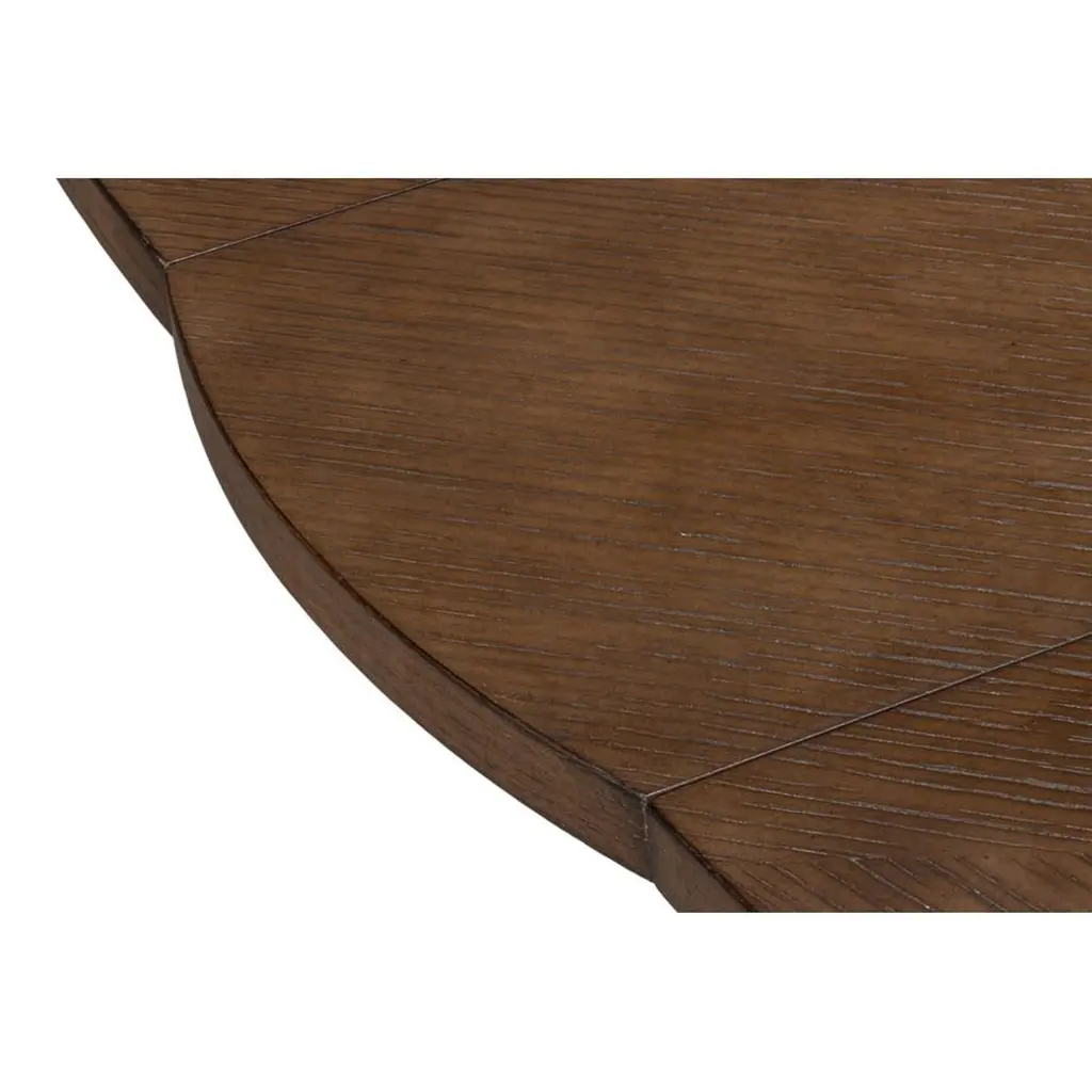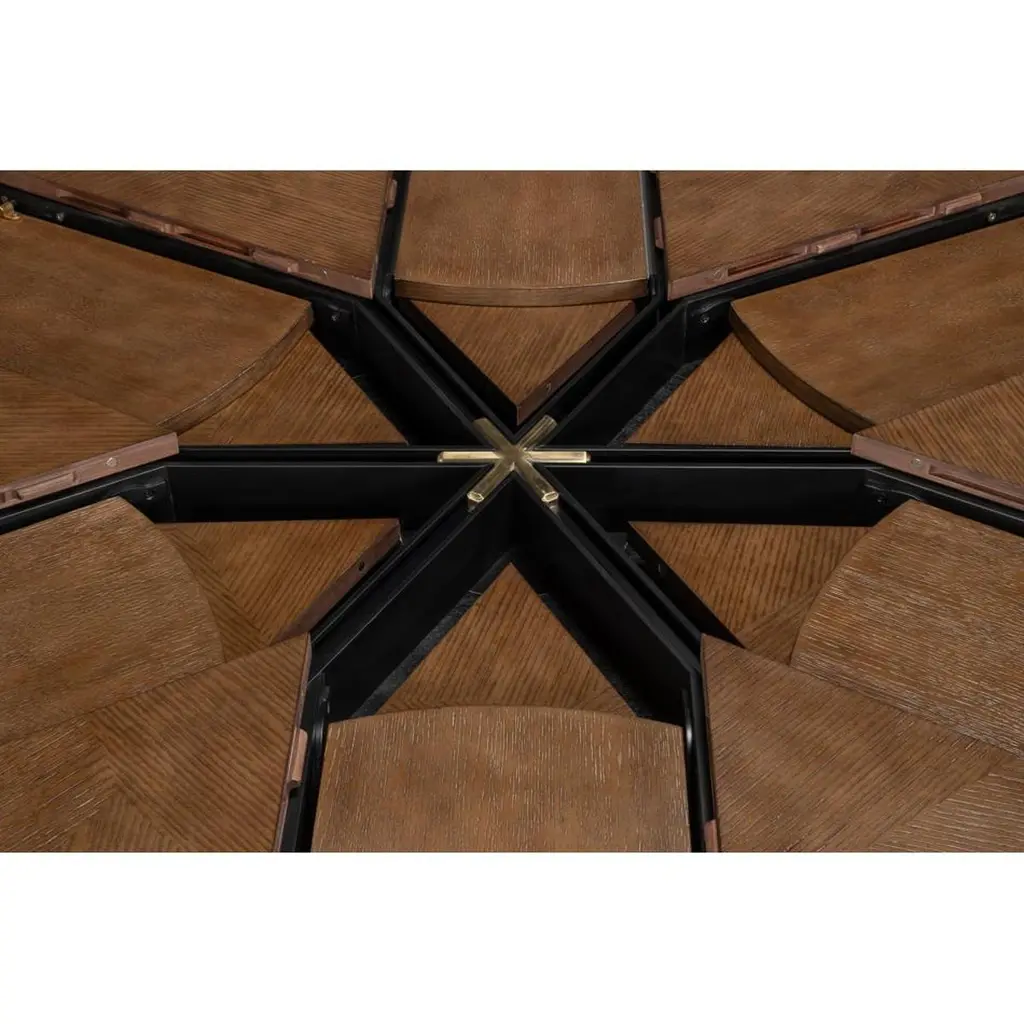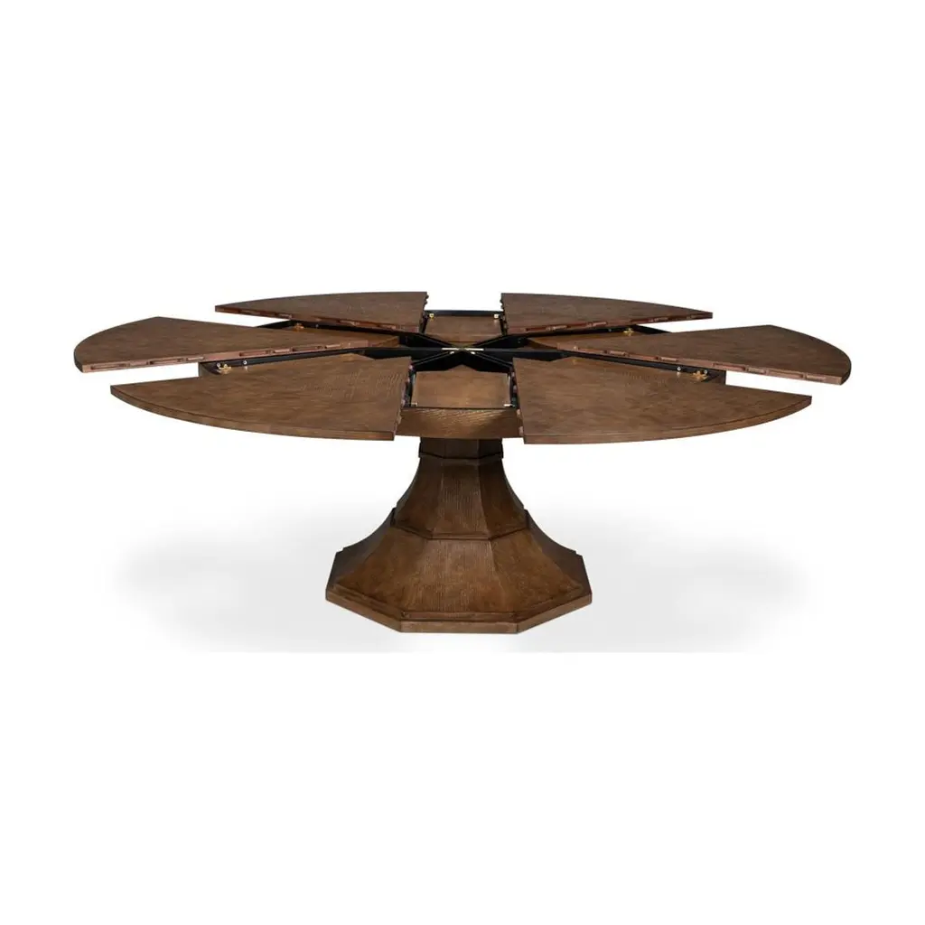 Crafted from quarter-sawn white oak veneer, its tabletop features a stunning herringbone marquetry design that adds texture and refined sophistication. The tapered octagonal pedestal base with curved facets provides architectural elegance and sturdy support, making it a beautiful focal point for any dining space.This table features a newly reengineered self-storing expansion mechanism made from durable extruded aluminum, allowing it to expand effortlessly for smooth operation and simplified assembly. Finished in a warm medium brown light-mink tone, the table is the perfect blend of style, functionality, and innovation—ideal for both intimate gatherings and grand dinners.Open Dimensions: 70" W x 70" D x 30" HClosed Dimensions: 55" W x 55" D x 30" H