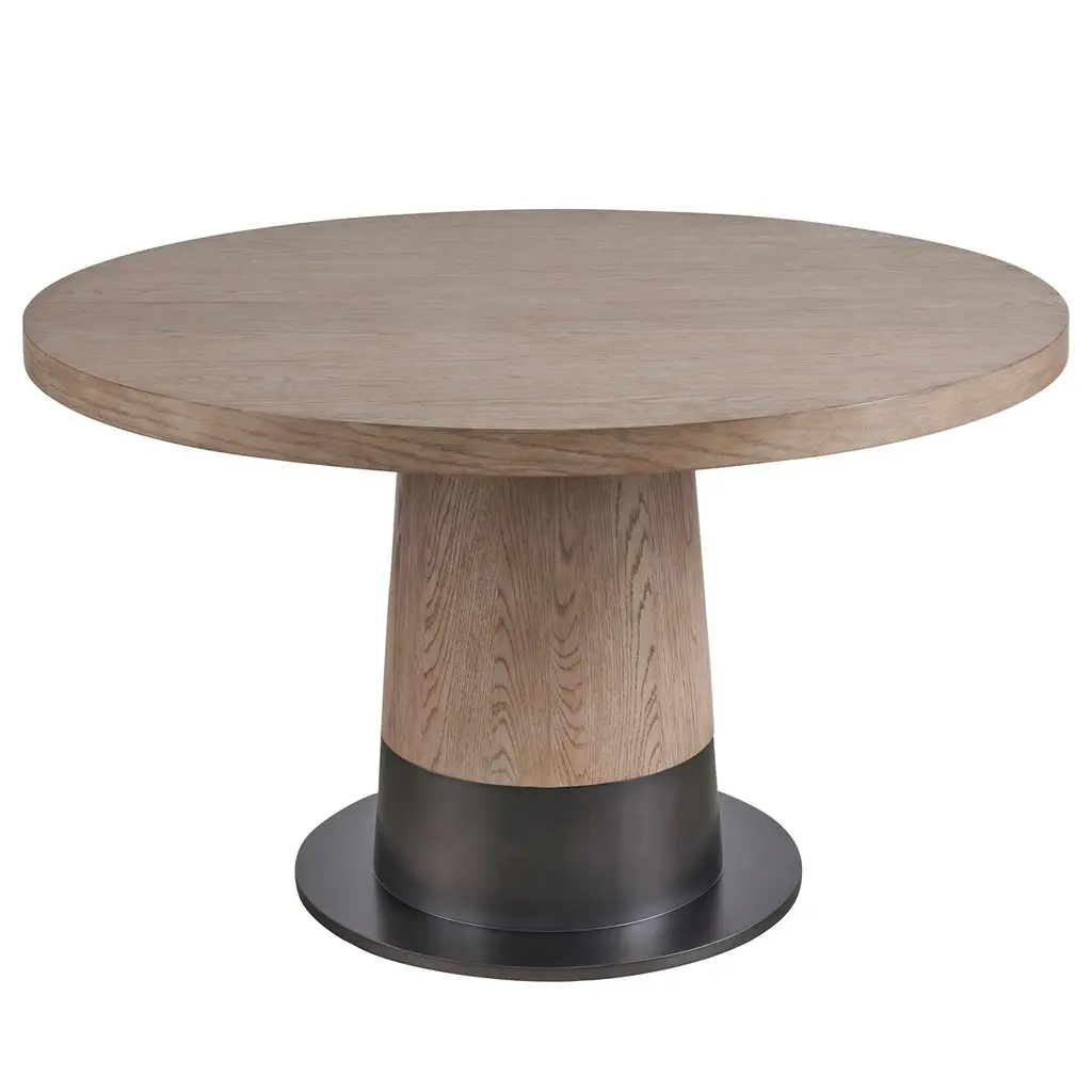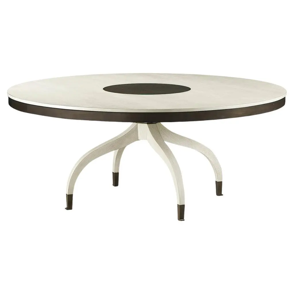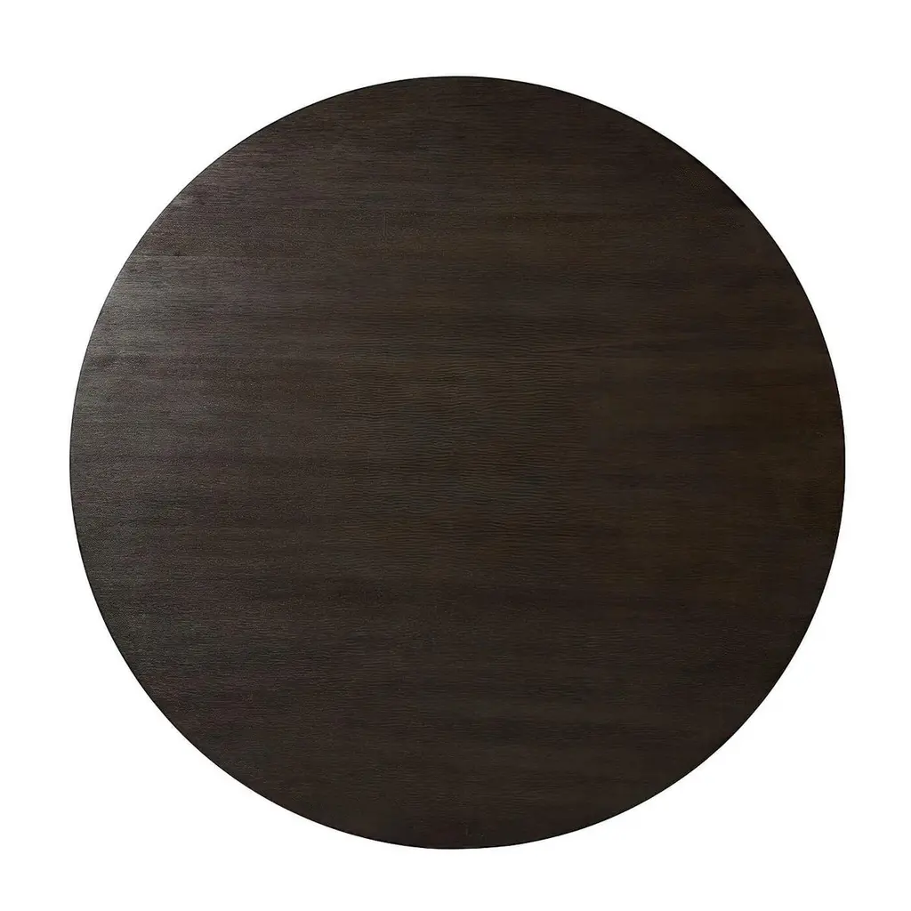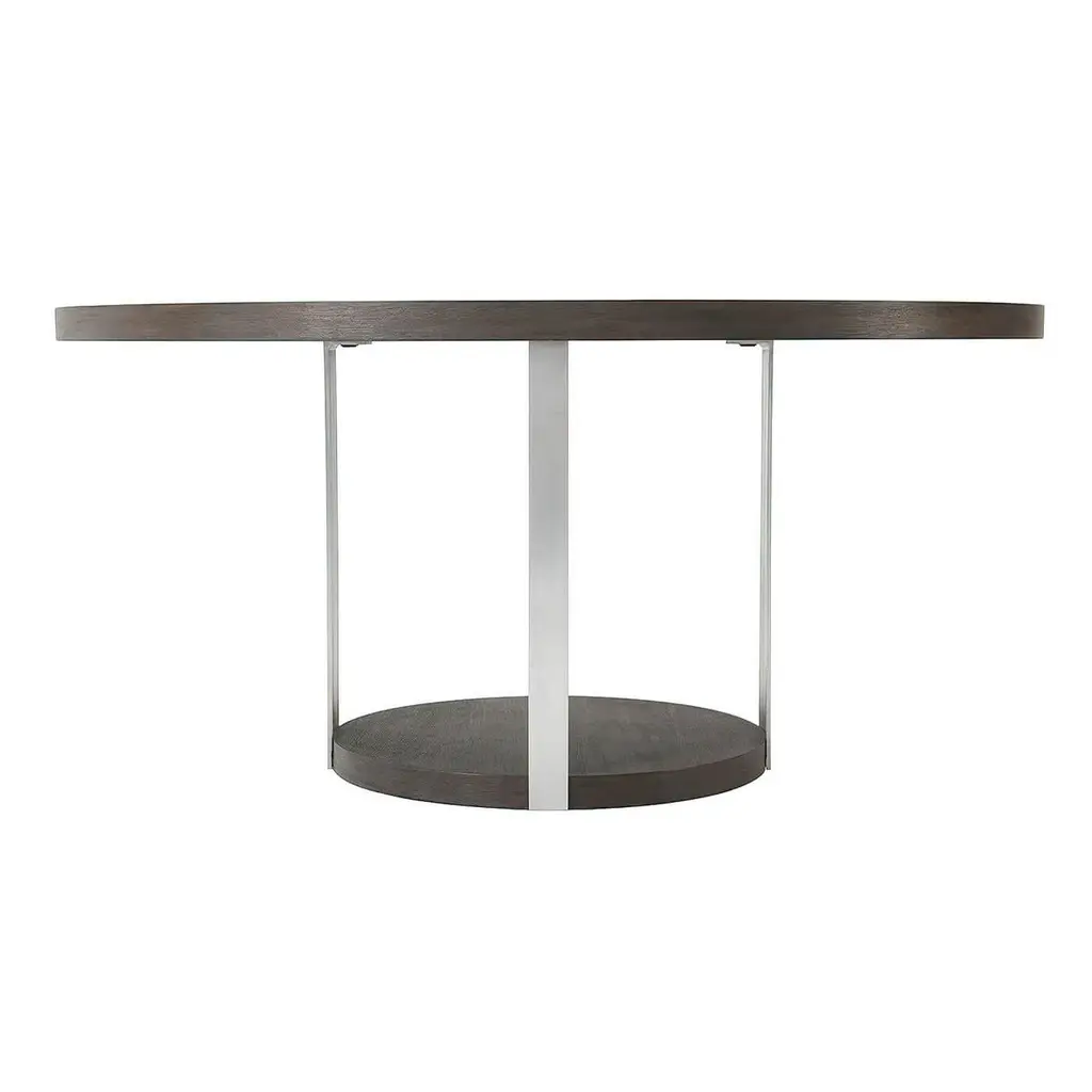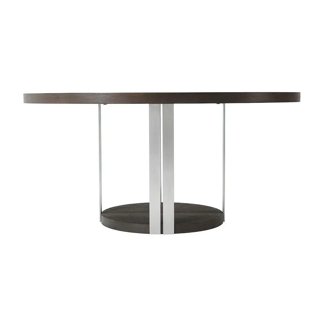Modern circular Anise finish dining table with four brushed nickel finish supports on a matching round platform base.Dimensions: 62.25" W x 62.25" D x 30" H.