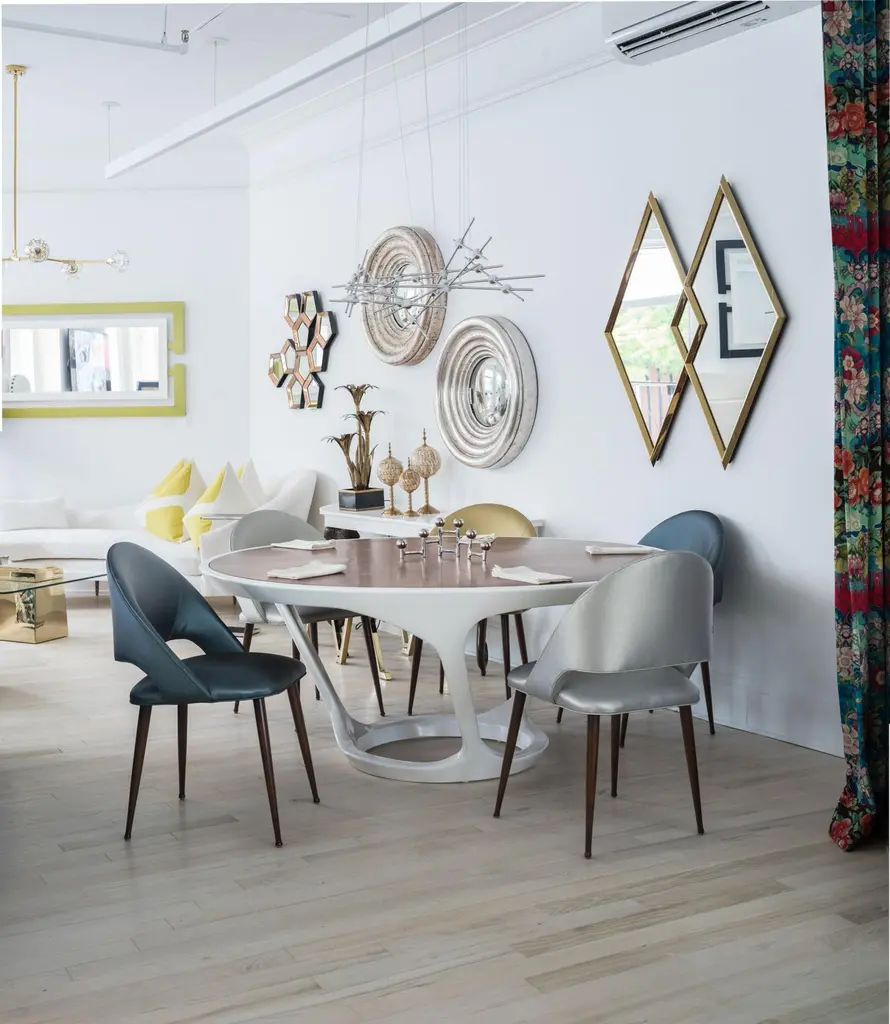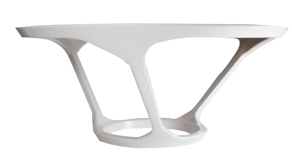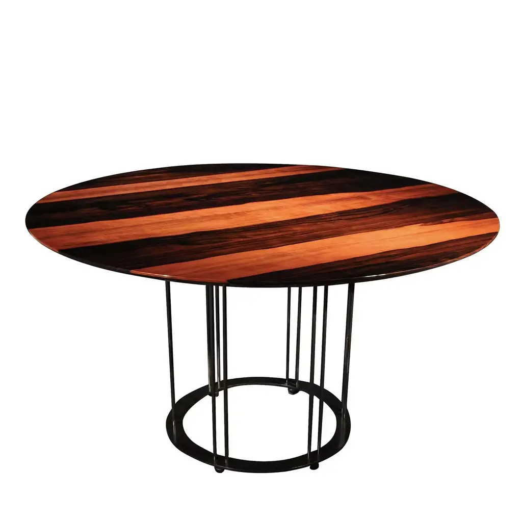 This modern round dining table has a 6 foot round maple base lacquered white and walnut top. Sits many people for easy conversations with a modern and innovative design. Customization of size and finish is available upon request.Measurements: 30" height x 6' diameter.